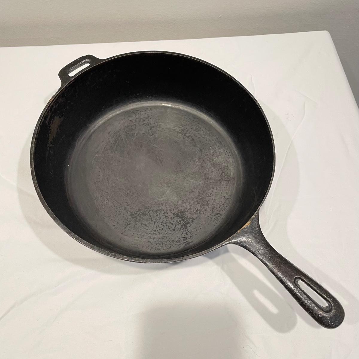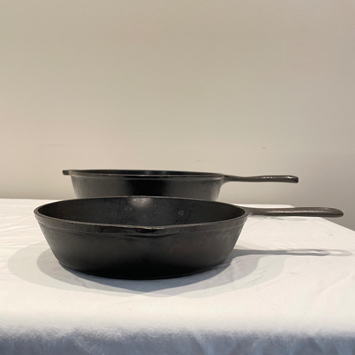 A nice 10"D cast iron skillet marked Chicken Fryer that's 3" deep and a #5 8"D cast iron skillet. See images. Shipping available.