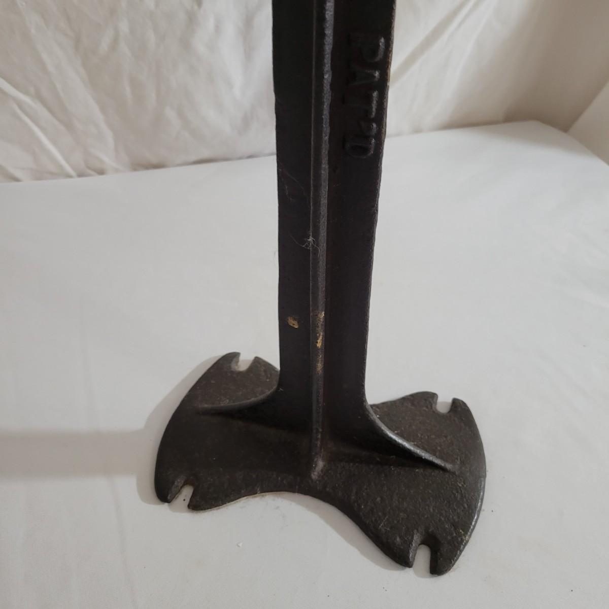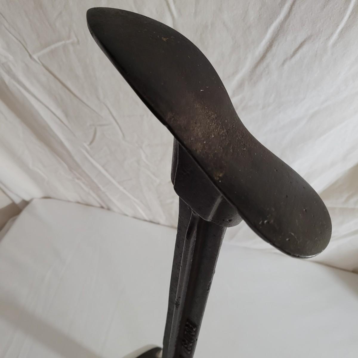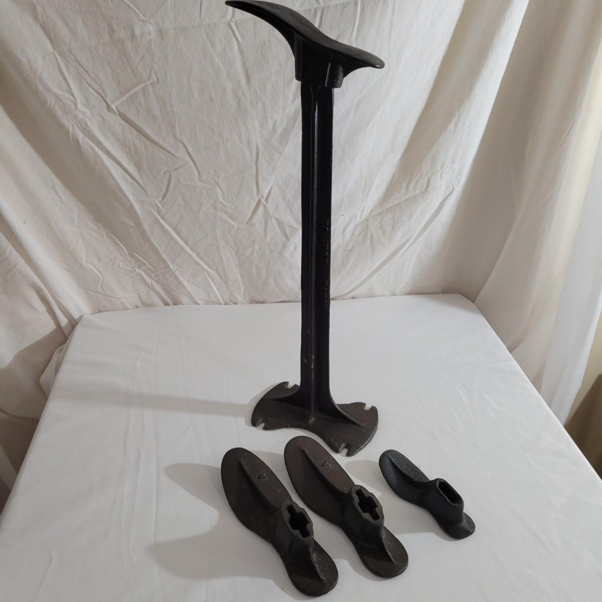A cast iron cobblers shoe form in good condition. Included is a cast iron stand that measures approximately 8" x 5" x 23" and includes four different shoe molds, two of which are the same size. The smallest mold does not fit onto the stand. Shipping available. Shipping can be costly. We suggest calling our local UPS with dimensions and getting an estimate before bidding: (828) 252-6930.