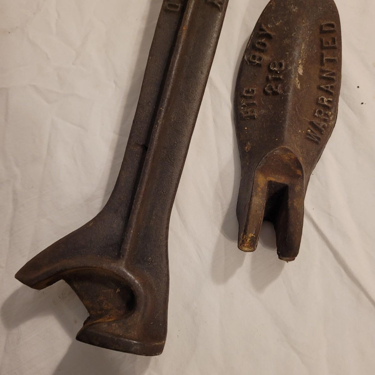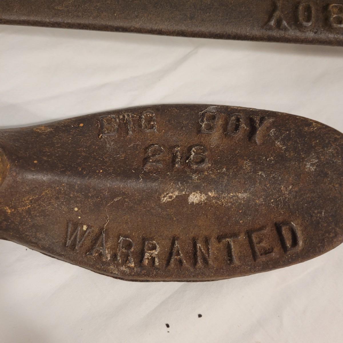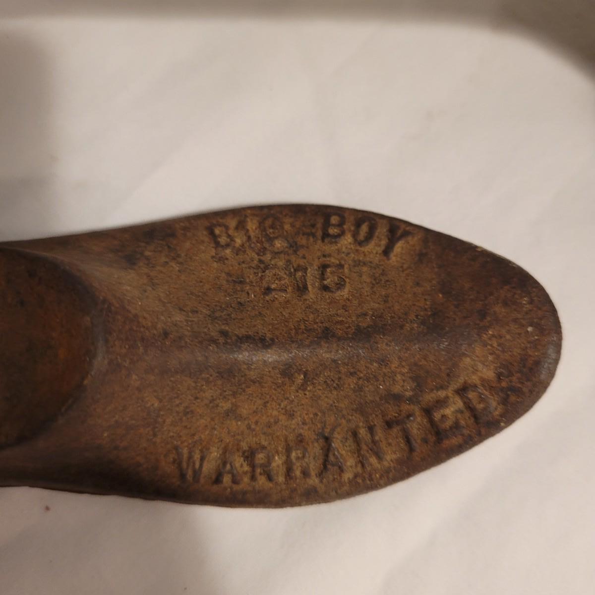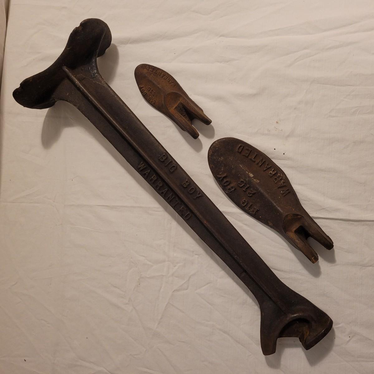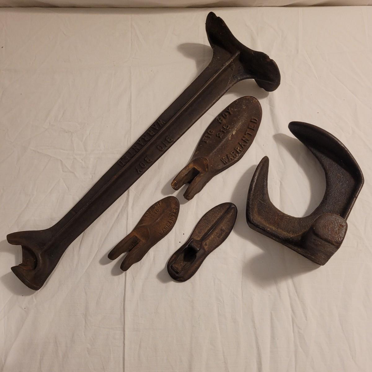 This lot includes five cast iron cobblers tools. All items are made from solid cast iron. Three of the pieces are marked "Big Boy Warranted" and include a part number "215", "218" and "211". The other items are unmarked but include an additional shoe mold and shoe anvil. The largest item measures 7" x 5" x 20"H. See photos for individual items.