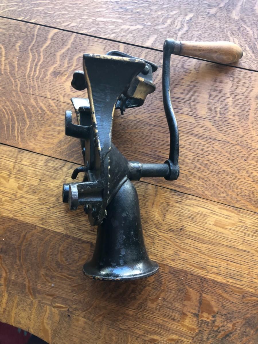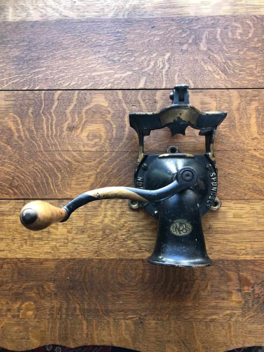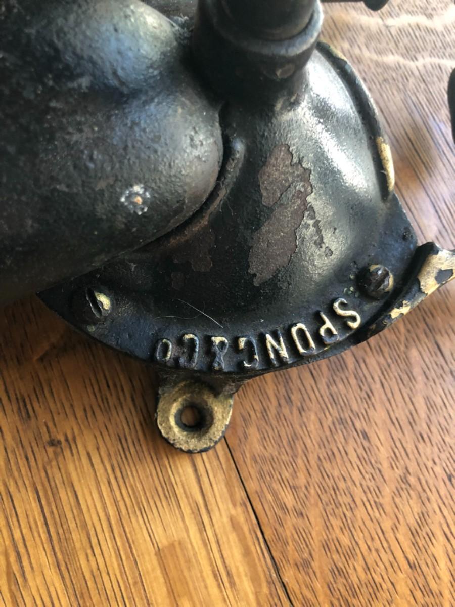 This cast iron coffee grinder is signed by Spong and Co and in excellent condition.