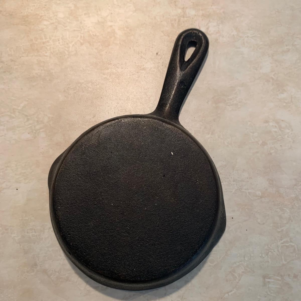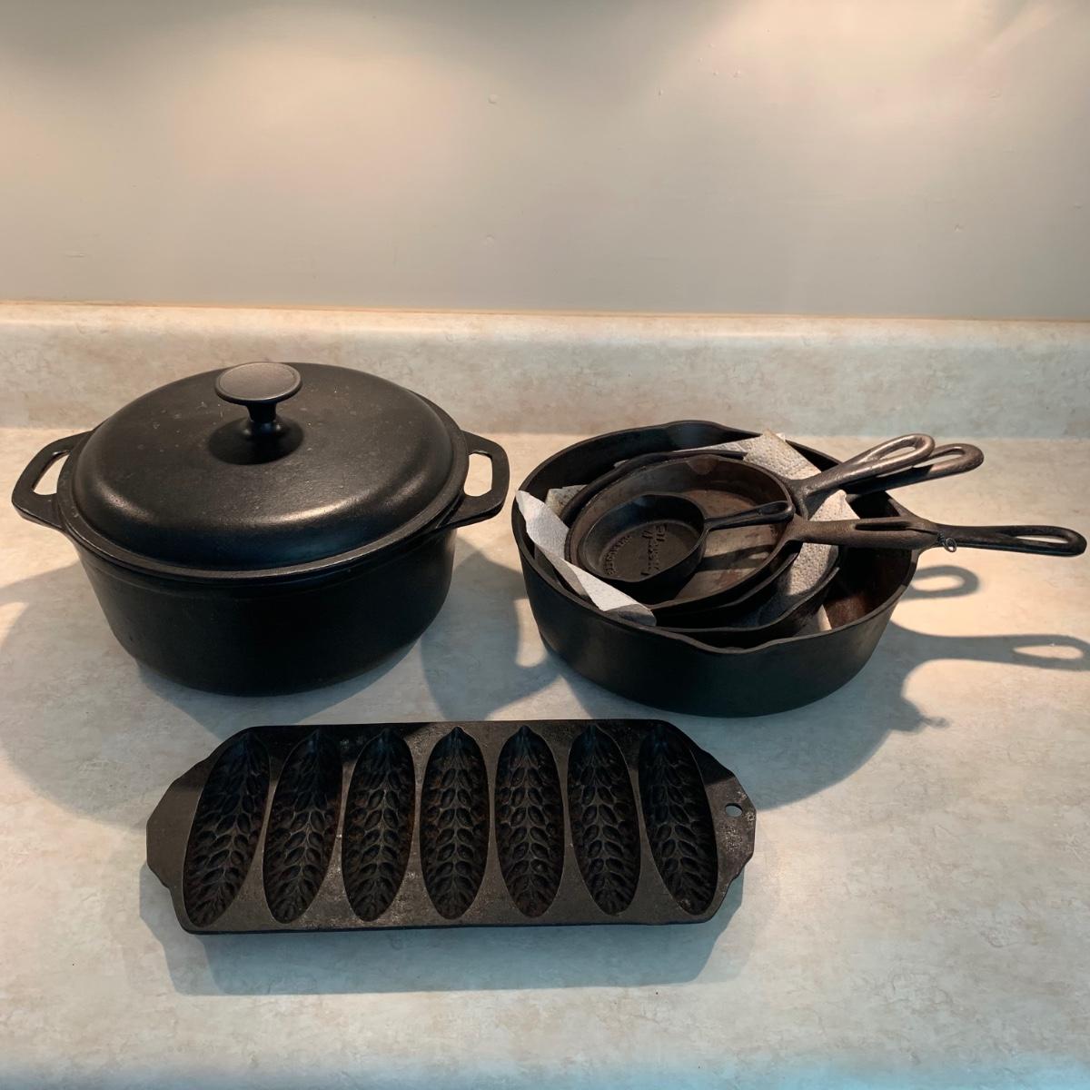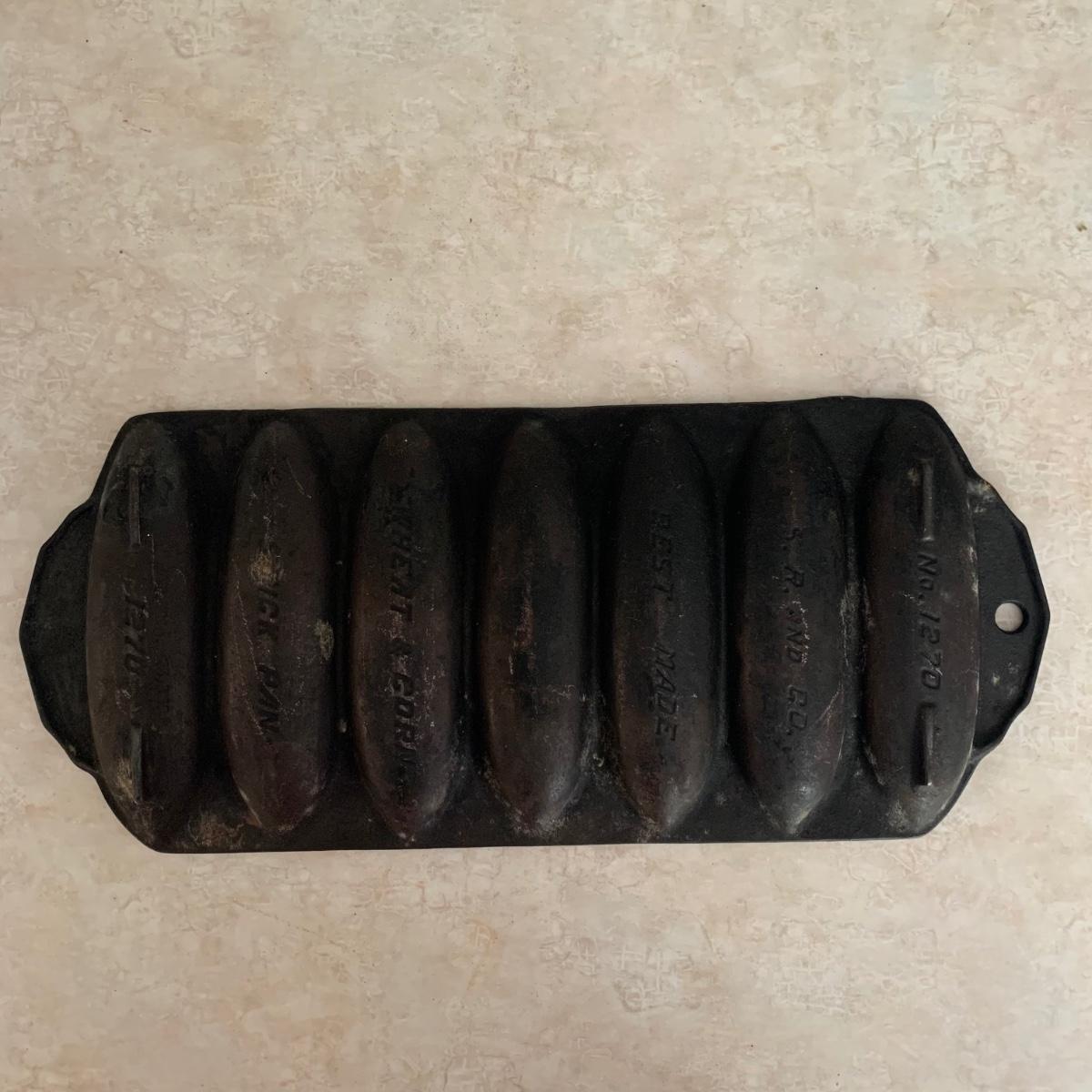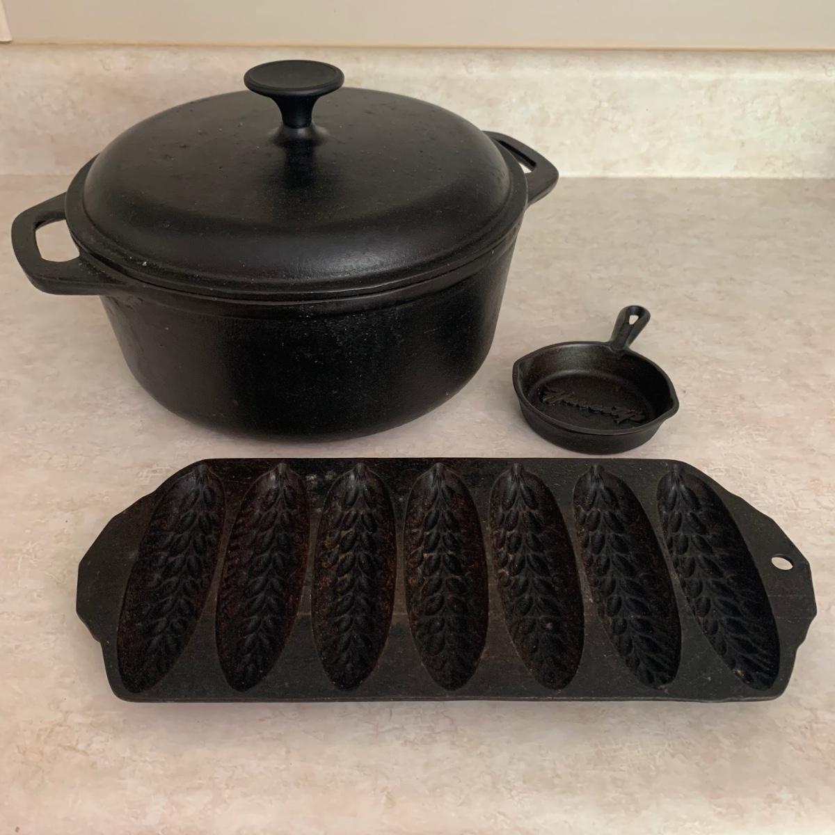 This lot contains a variety of cast iron pans. There is a lidded Chefmate brand pot with handles. It has a strong oil smell from previous use. This pot is 10”D. There is a unique S. R. and Co. “Wheat & Corn Stick Pan”. There are five frying pans, all different sizes. The largest is 10.75”D and the smallest is 3.75”D. Only the smallest pan has a legible makers mark. It reads “Haverty’s Charlotte, NC”. All items show some rust and wear. Shipping available, but be aware that items are quite heavy.