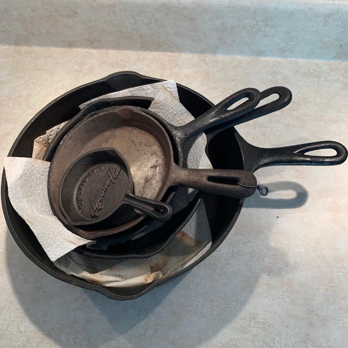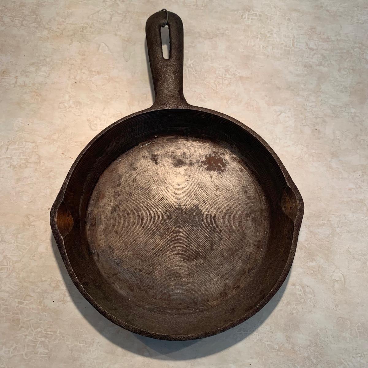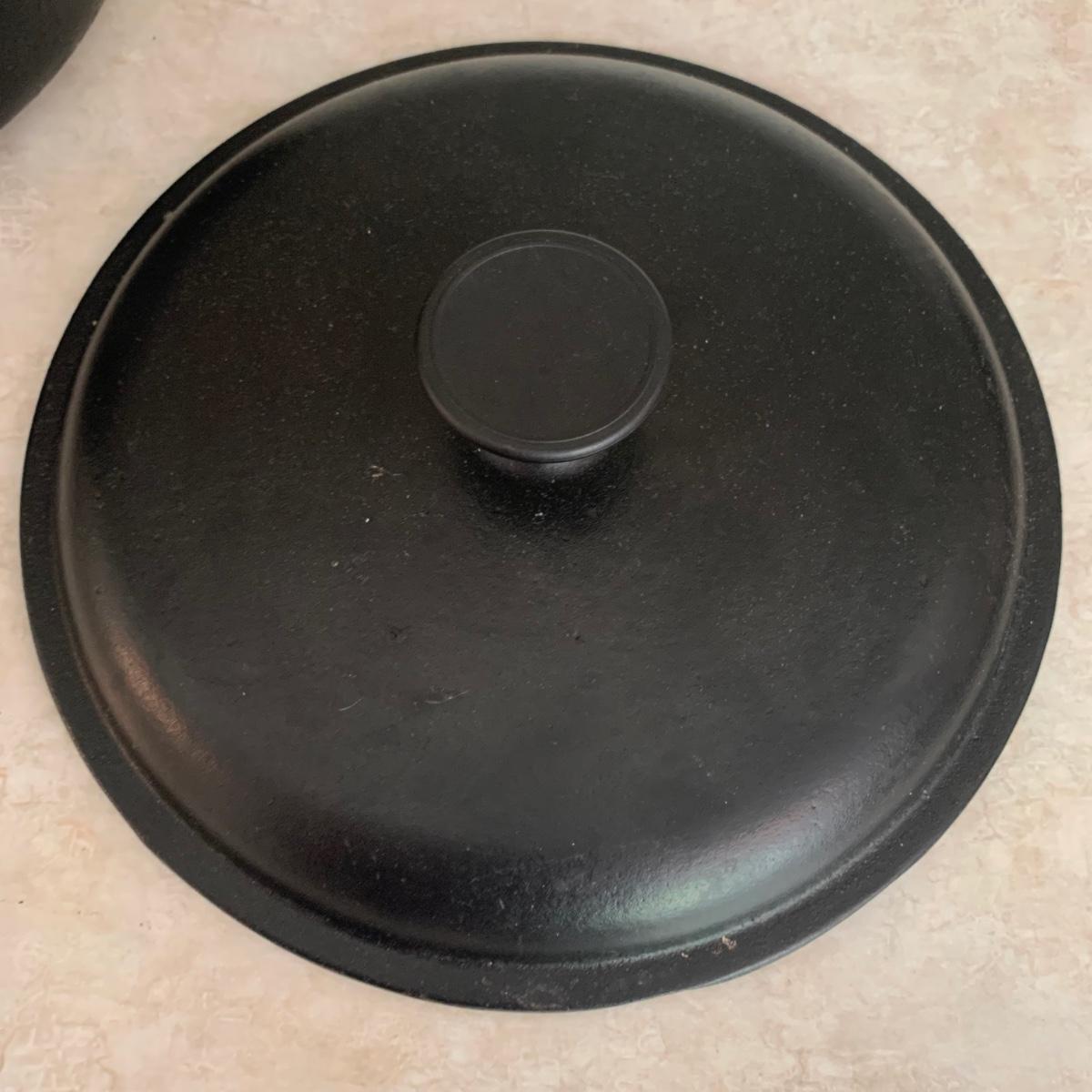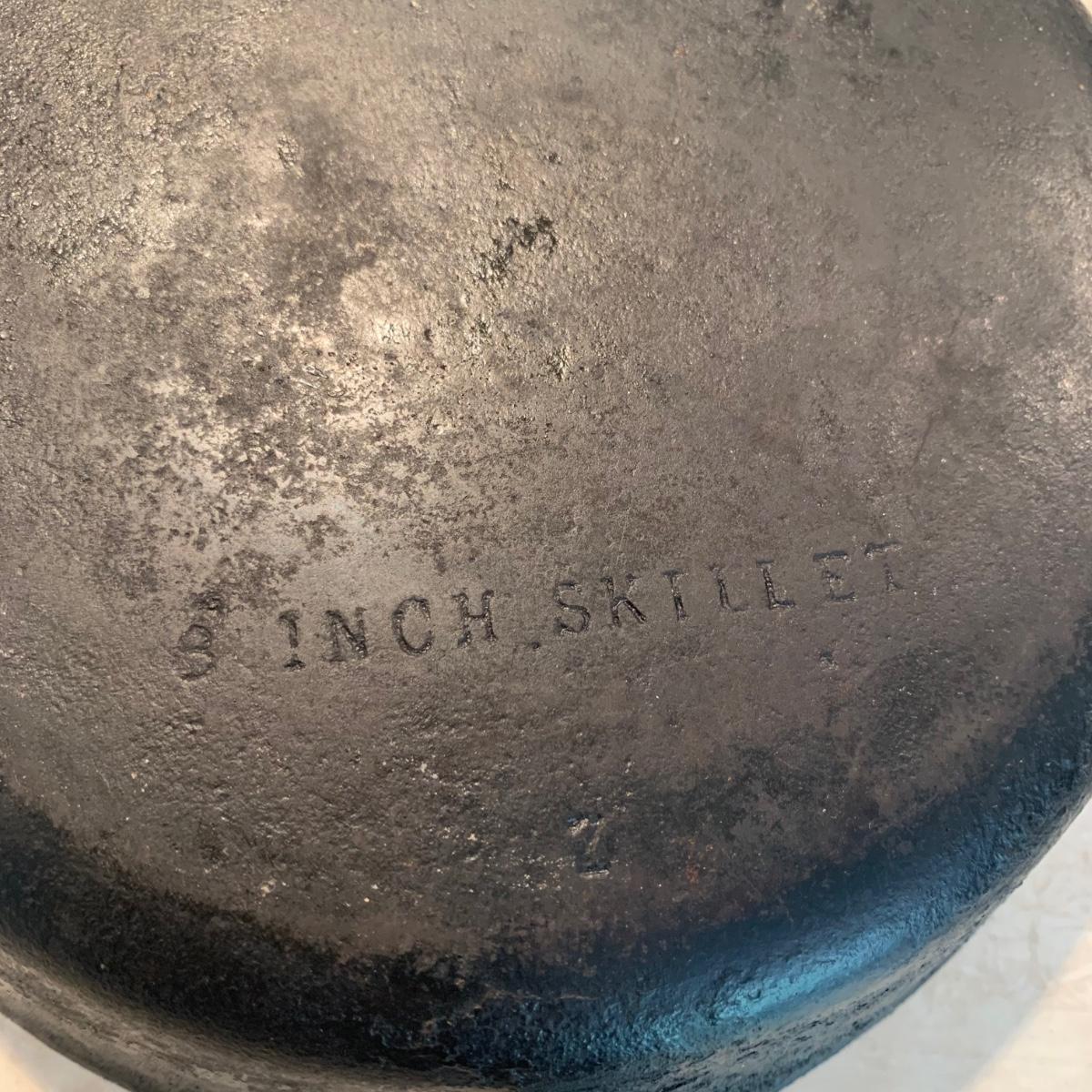 This lot contains a variety of cast iron pans. There is a lidded Chefmate brand pot with handles. It has a strong oil smell from previous use. This pot is 10”D. There is a unique S. R. and Co. “Wheat & Corn Stick Pan”. There are five frying pans, all different sizes. The largest is 10.75”D and the smallest is 3.75”D. Only the smallest pan has a legible makers mark. It reads “Haverty’s Charlotte, NC”. All items show some rust and wear. Shipping available, but be aware that items are quite heavy.