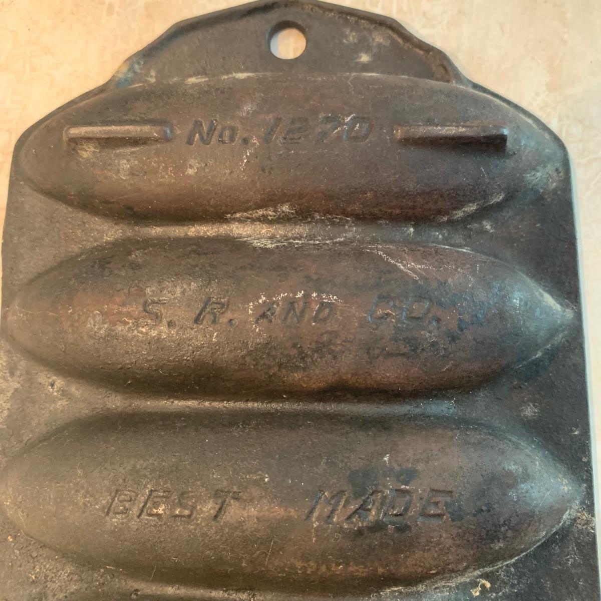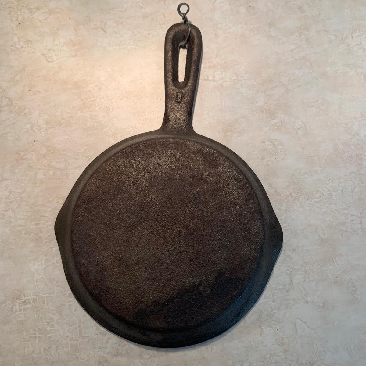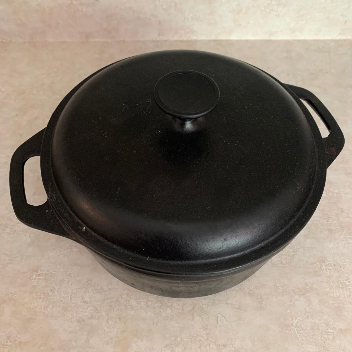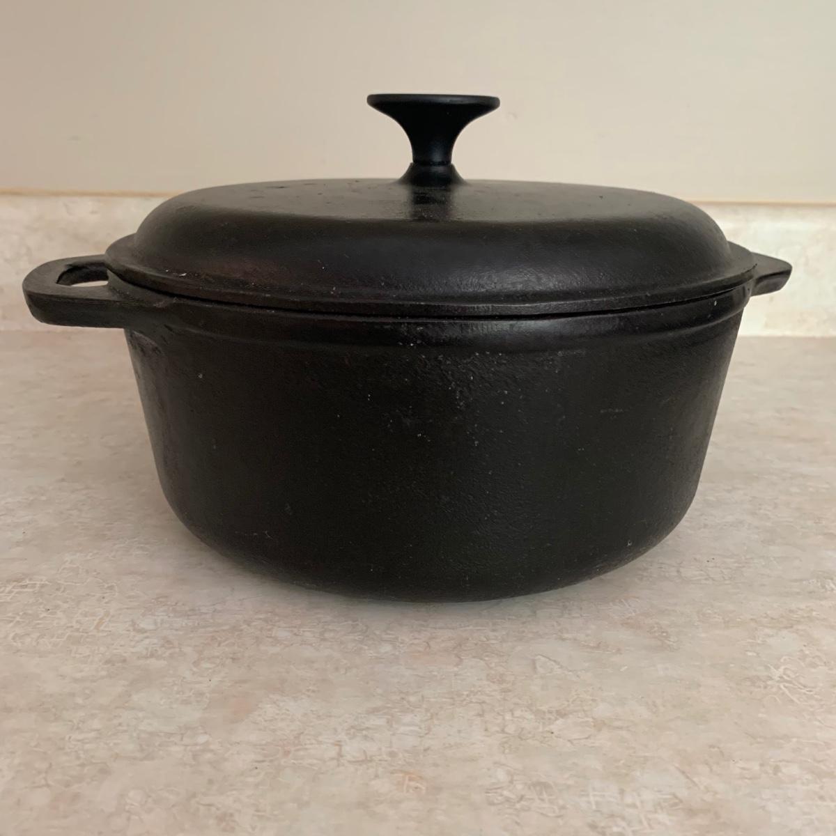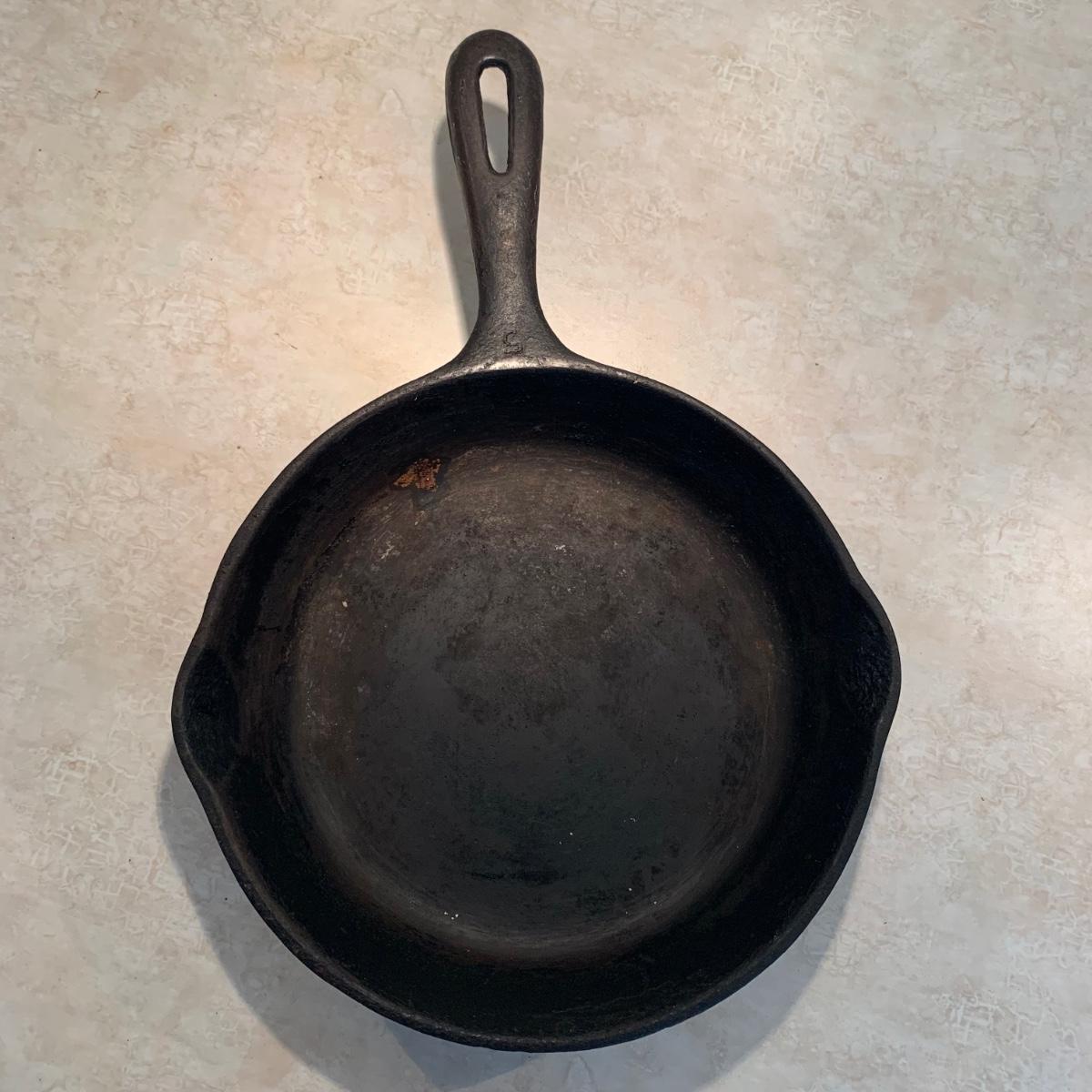 This lot contains a variety of cast iron pans. There is a lidded Chefmate brand pot with handles. It has a strong oil smell from previous use. This pot is 10”D. There is a unique S. R. and Co. “Wheat & Corn Stick Pan”. There are five frying pans, all different sizes. The largest is 10.75”D and the smallest is 3.75”D. Only the smallest pan has a legible makers mark. It reads “Haverty’s Charlotte, NC”. All items show some rust and wear. Shipping available, but be aware that items are quite heavy.