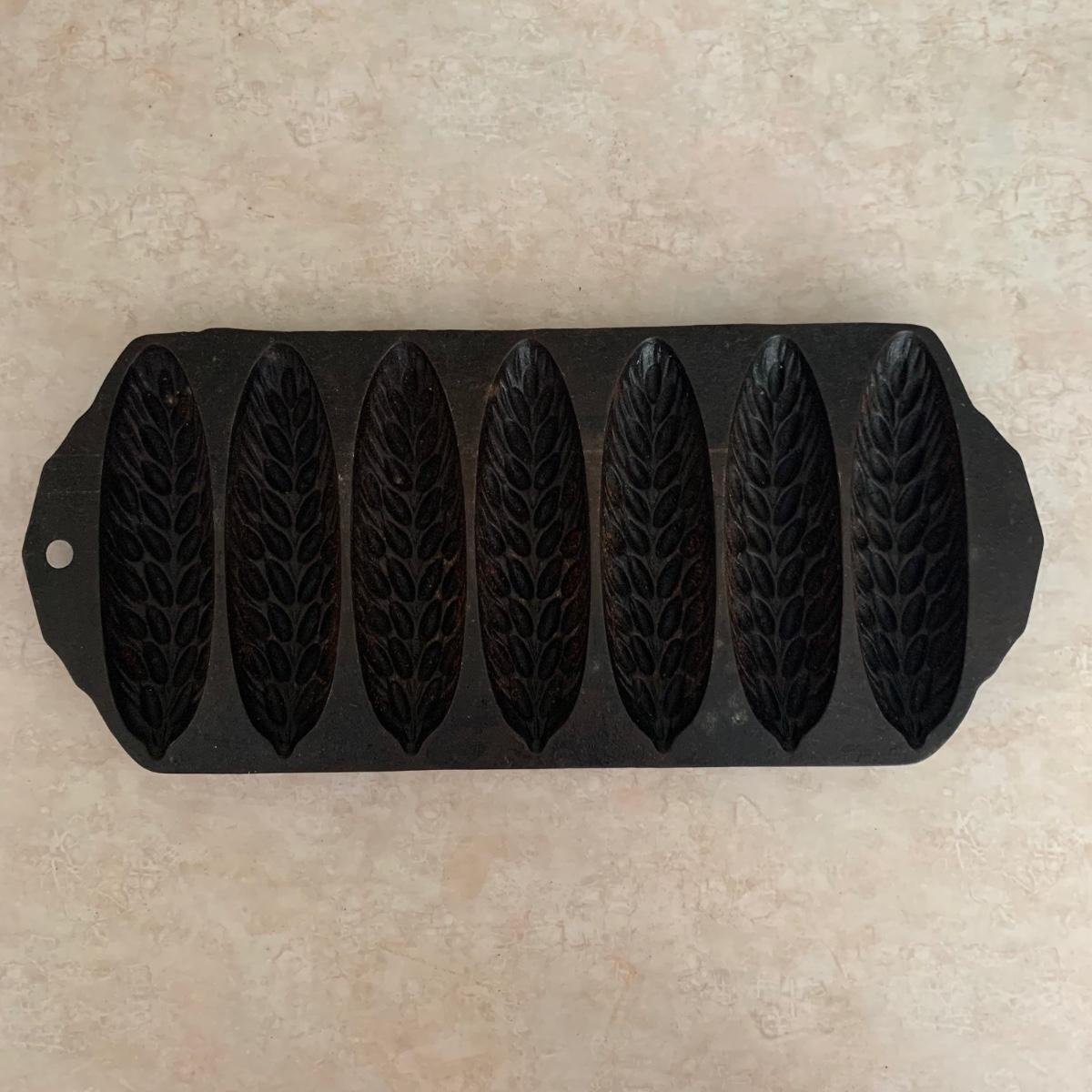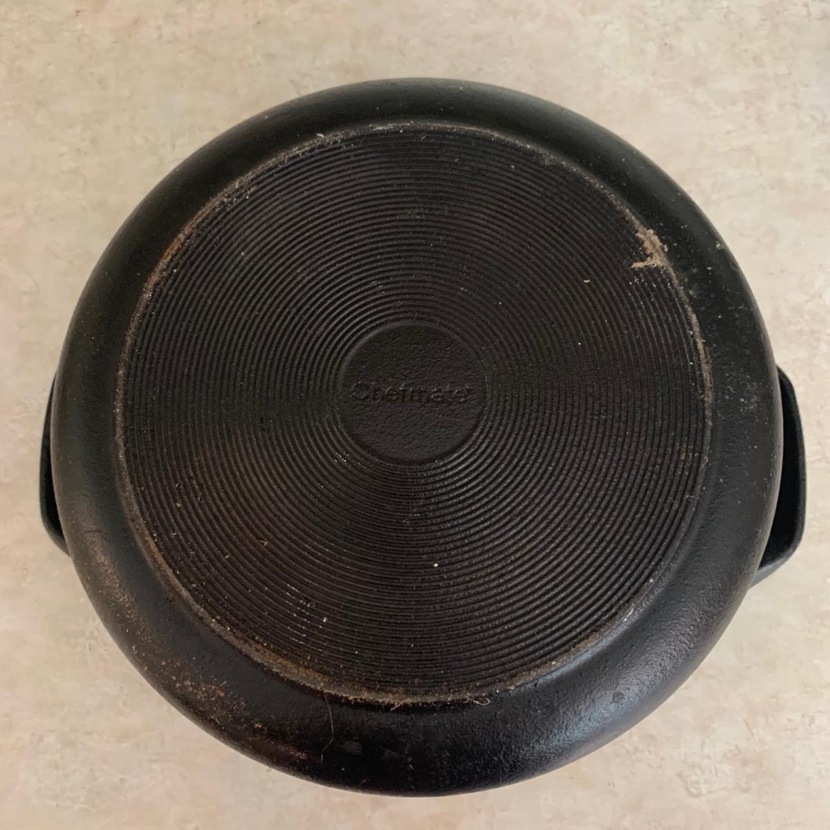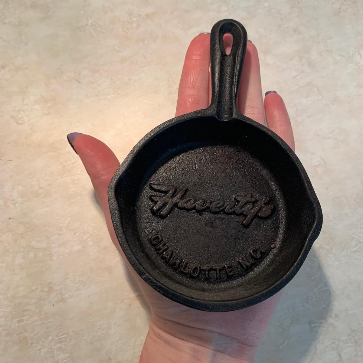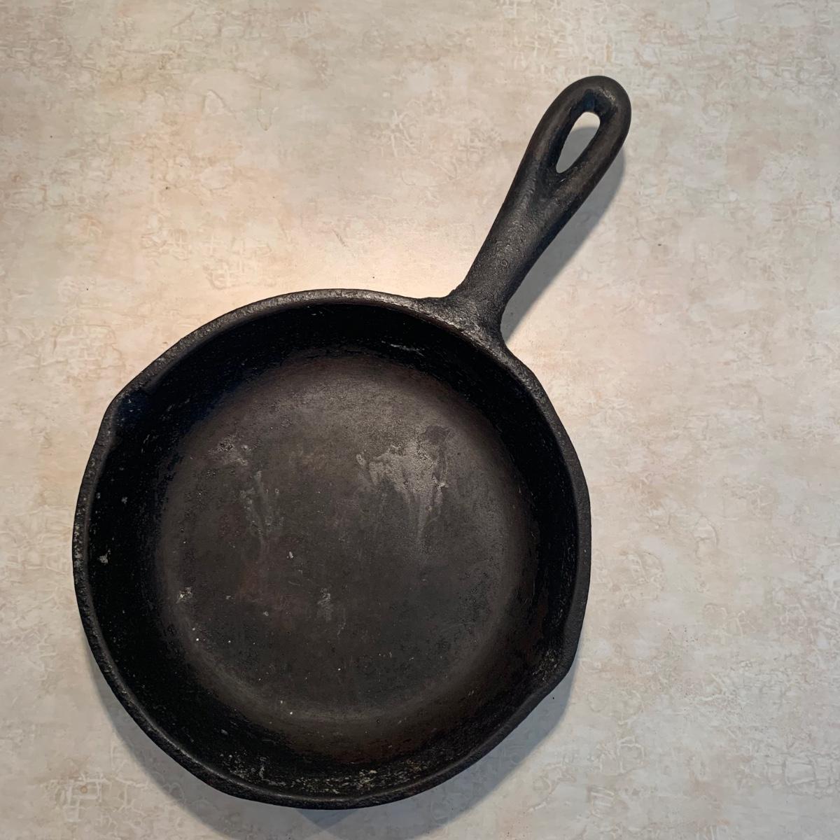 This lot contains a variety of cast iron pans. There is a lidded Chefmate brand pot with handles. It has a strong oil smell from previous use. This pot is 10”D. There is a unique S. R. and Co. “Wheat & Corn Stick Pan”. There are five frying pans, all different sizes. The largest is 10.75”D and the smallest is 3.75”D. Only the smallest pan has a legible makers mark. It reads “Haverty’s Charlotte, NC”. All items show some rust and wear. Shipping available, but be aware that items are quite heavy.