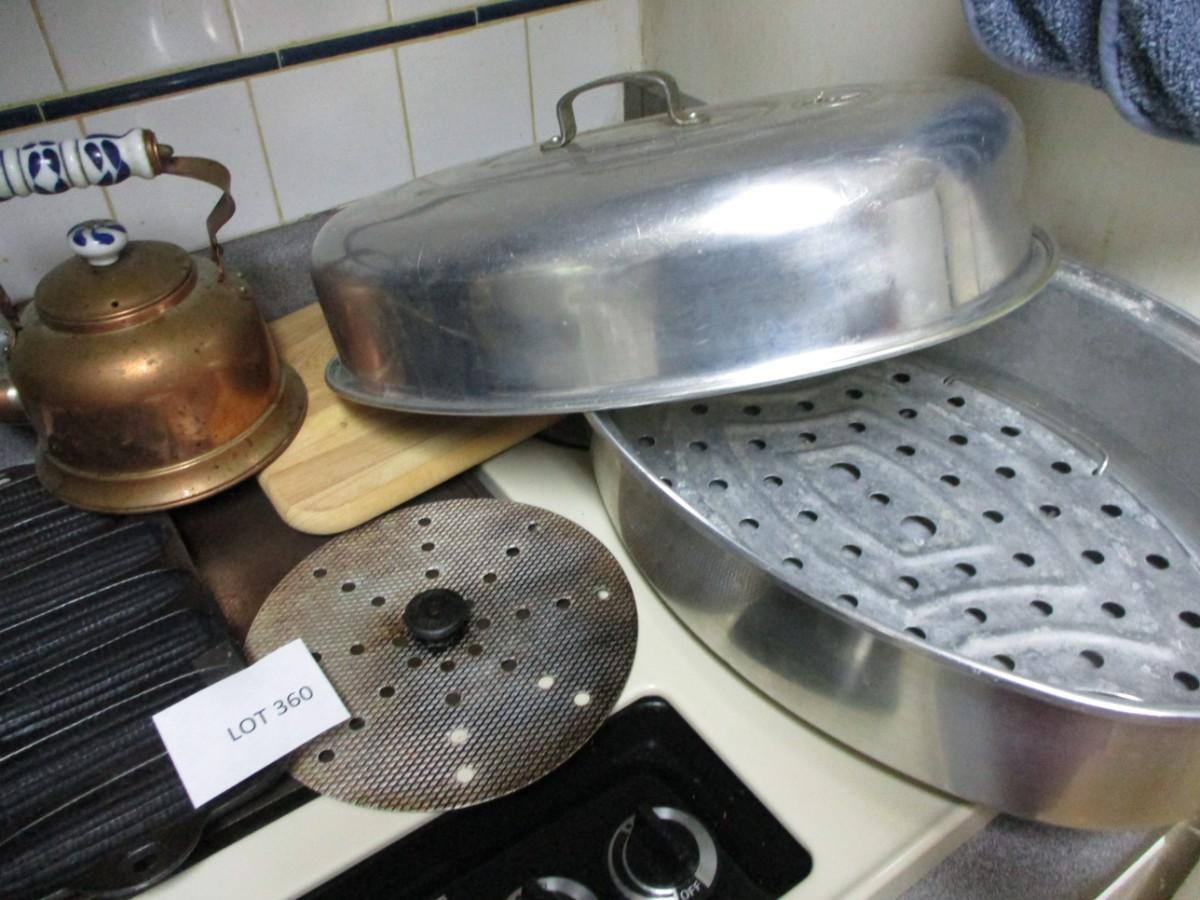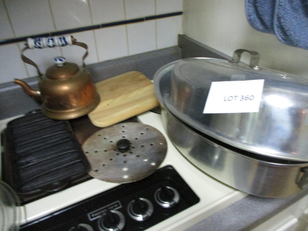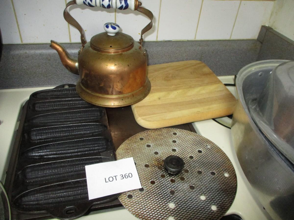 Metal roaster. Brass tea kettle. Cast iron cornbread pan