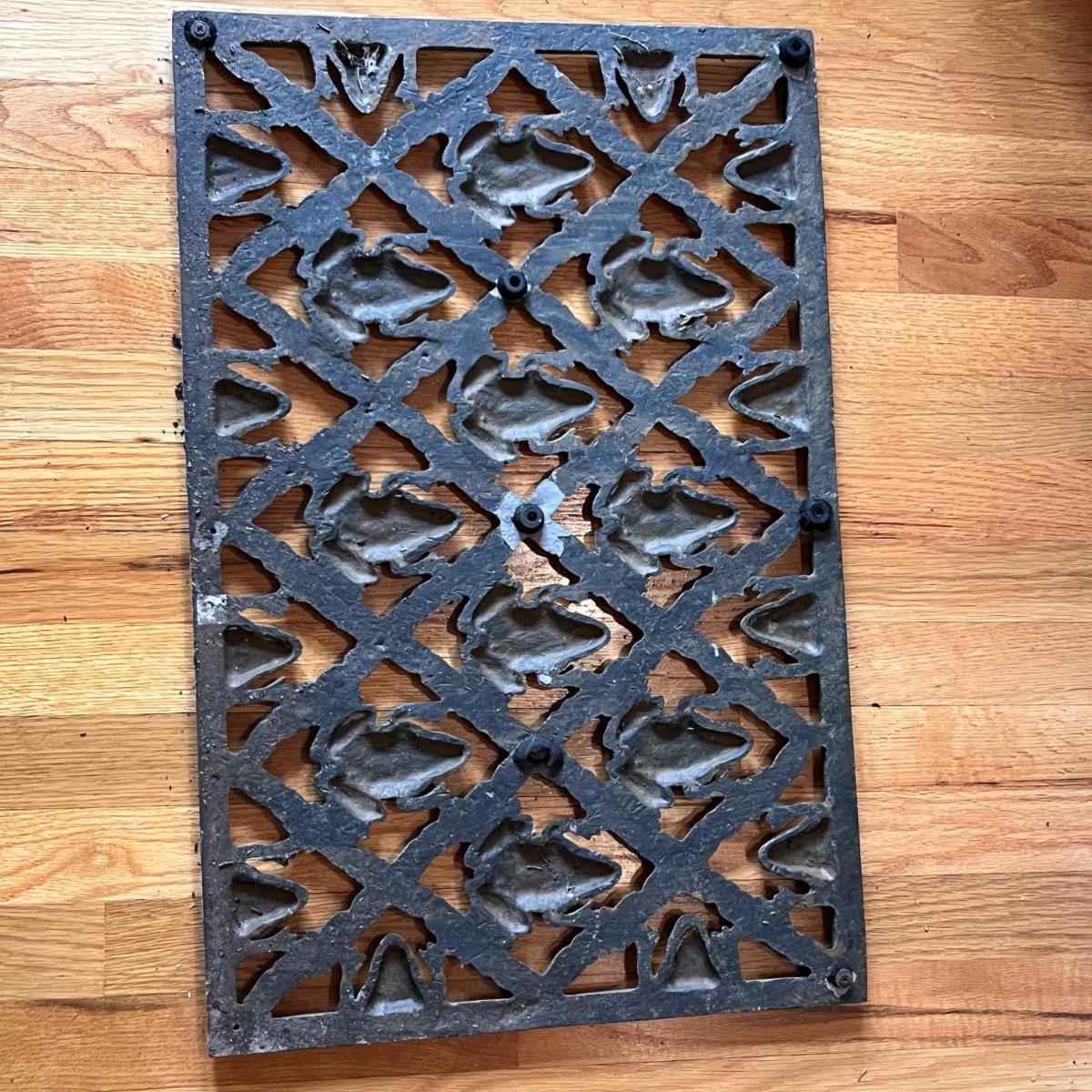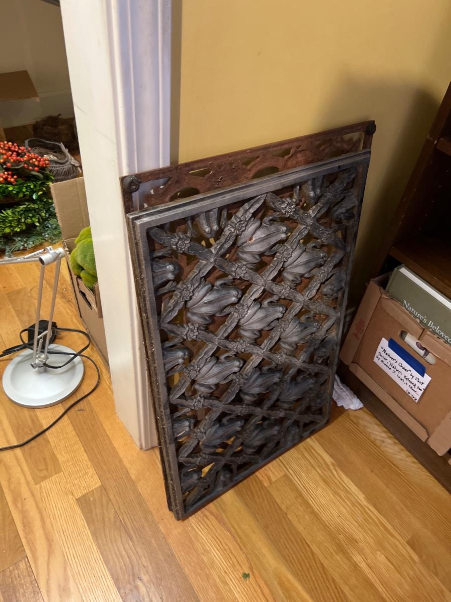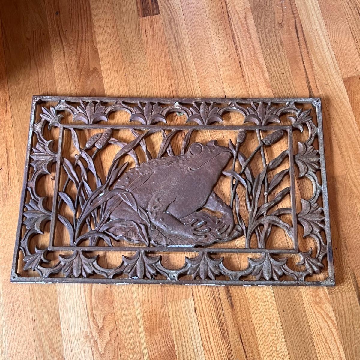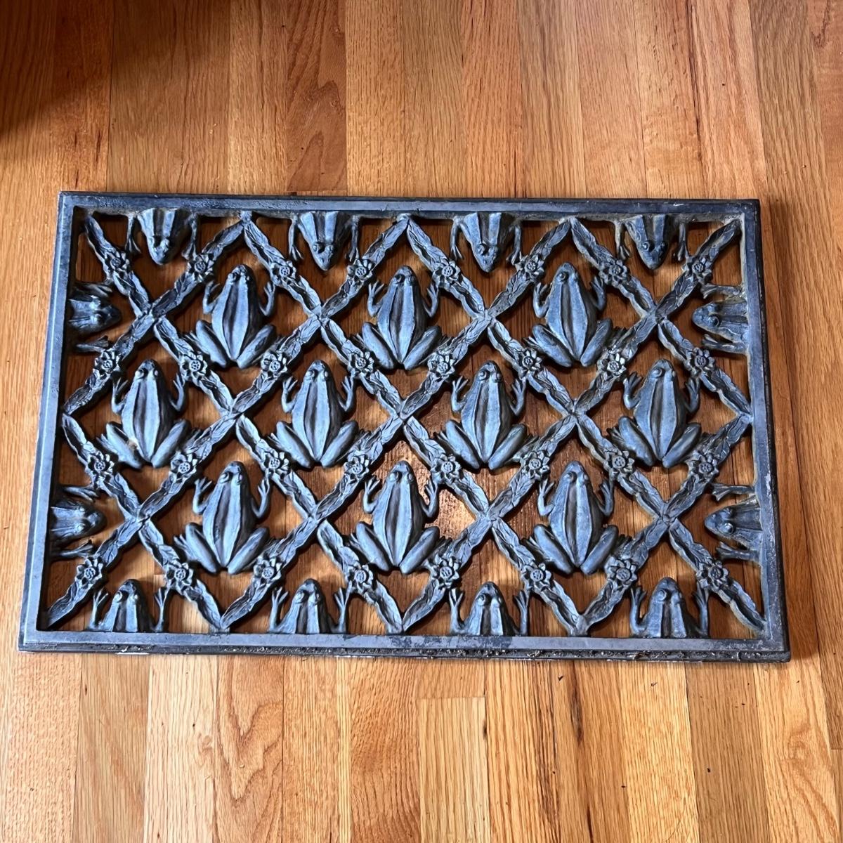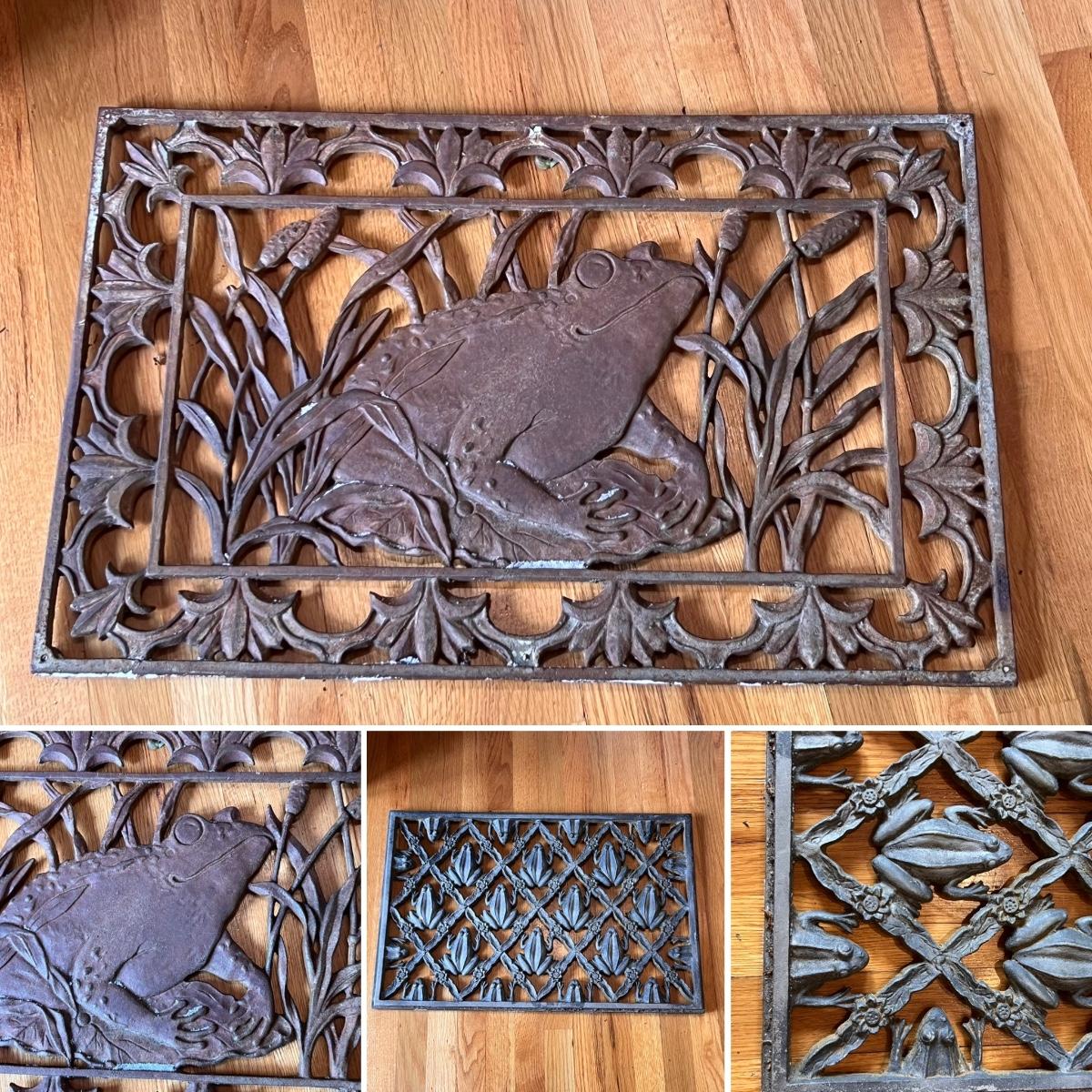 Two heavy metal door mats appear to be cast iron. One has a brownish rust patina, the other a green/blue patina.