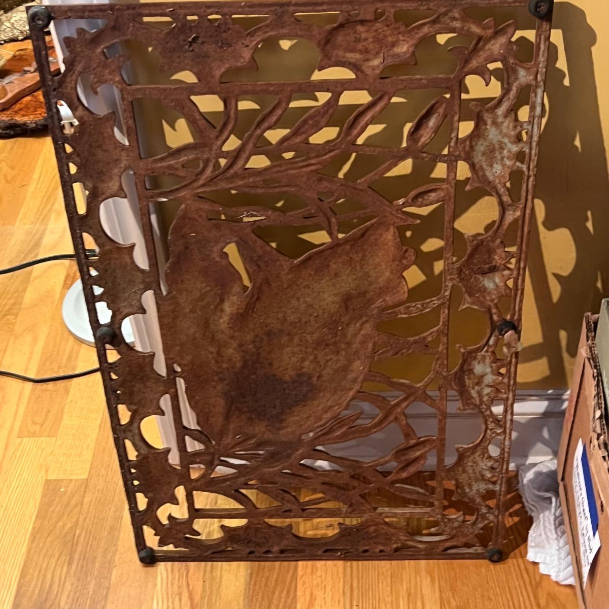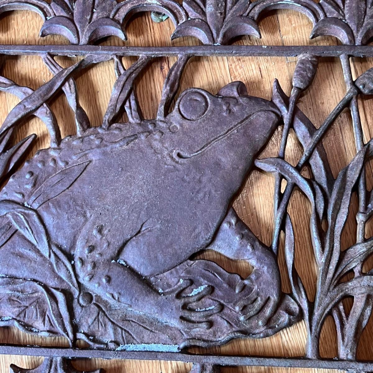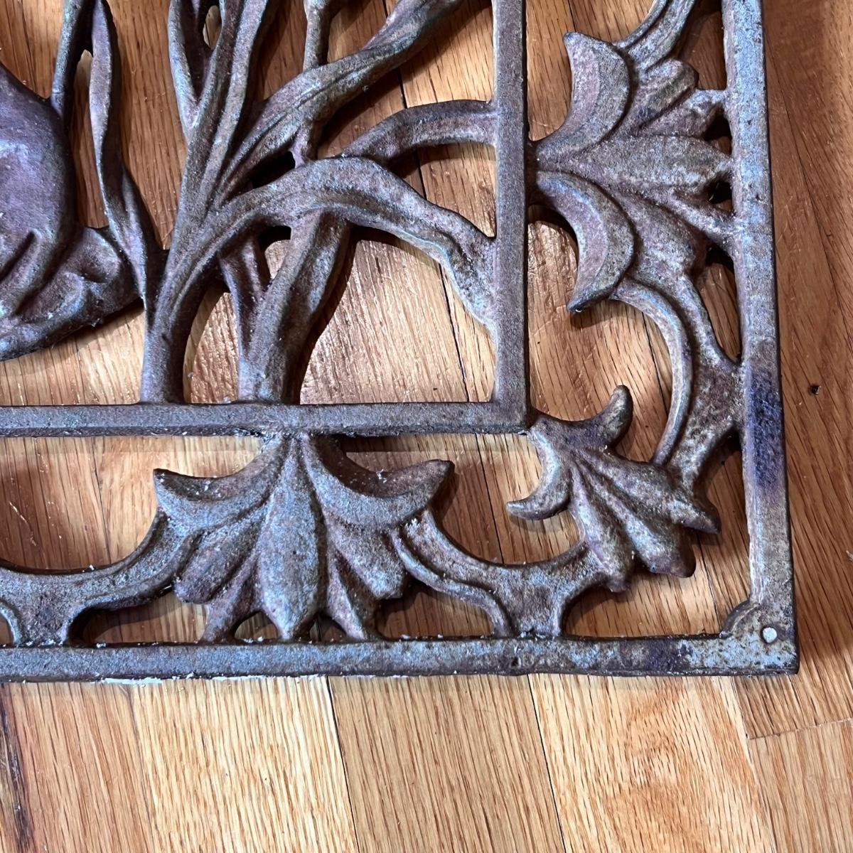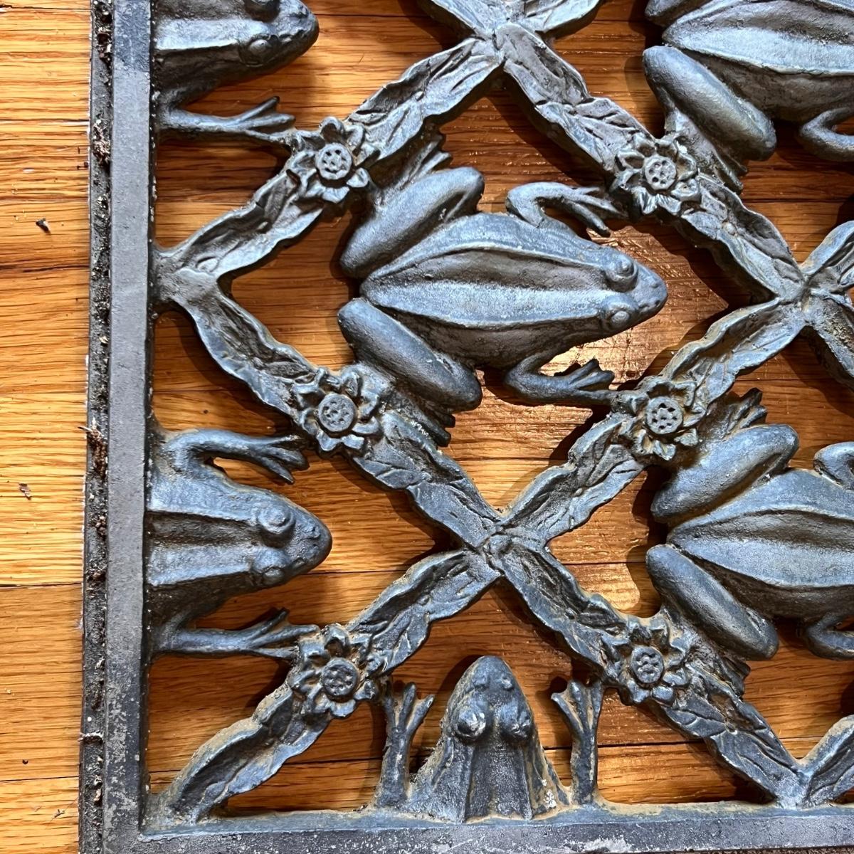 Two heavy metal door mats appear to be cast iron. One has a brownish rust patina, the other a green/blue patina.
