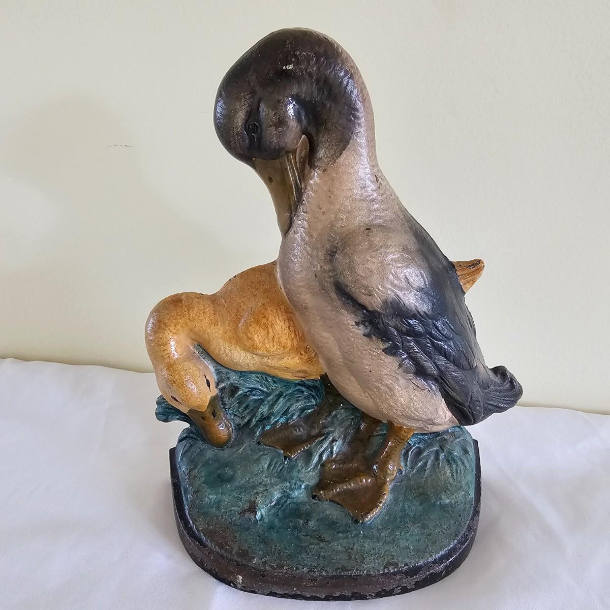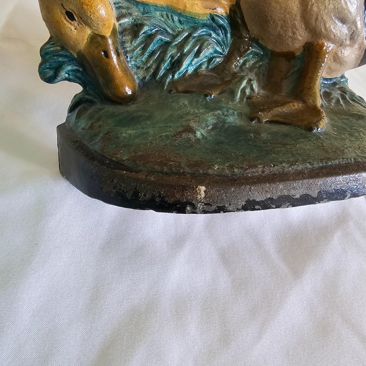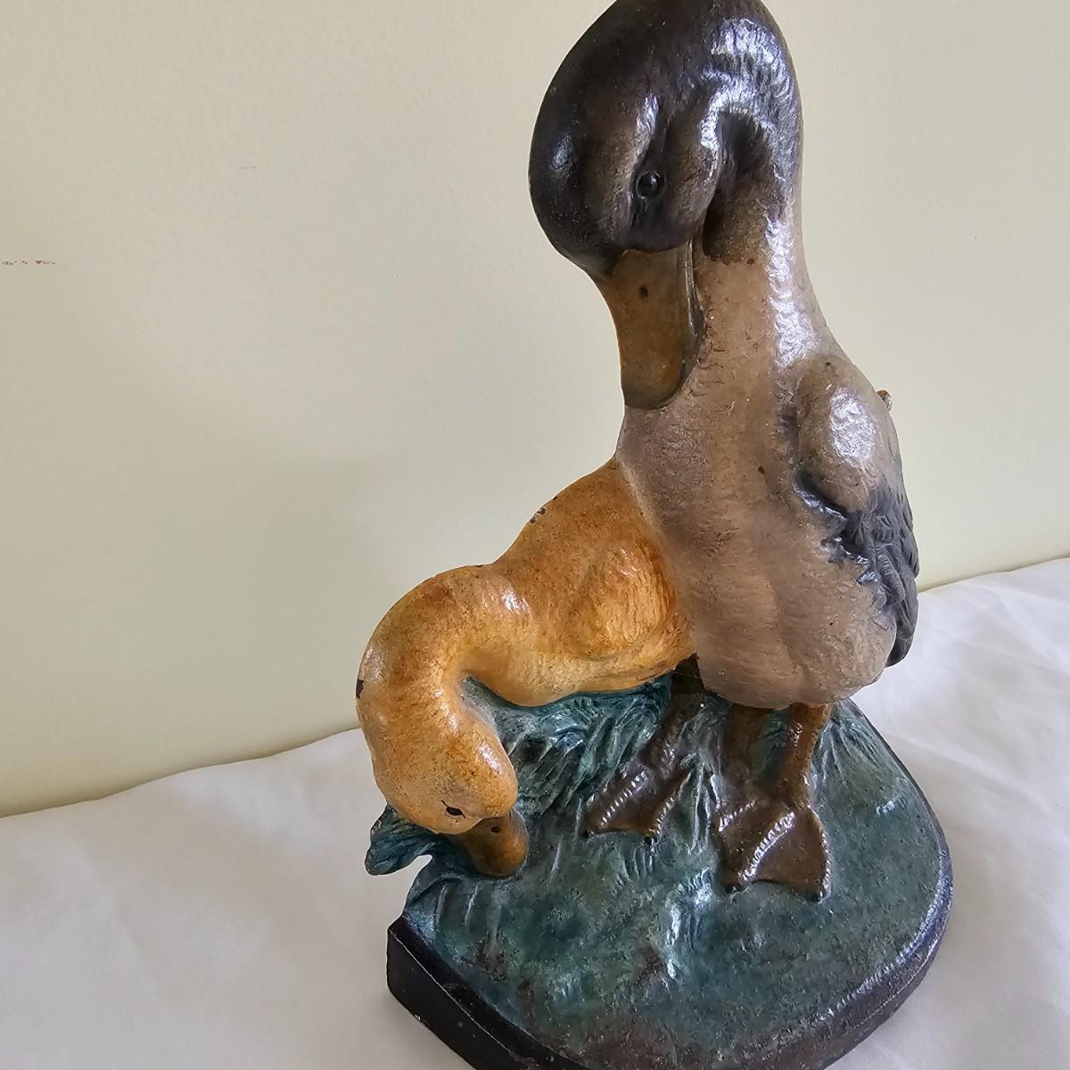 Two items includes a pair of ducks and a pig as cast iron doorstops. Painted in natural colors, the ducks measure 3" x 7" x 8.5"H. Slight wear on bottom front and near top of tall head. Pig has some wear and rust spots, measures 3.5" x 8" x 6"H. See photos for details. Shipping available.