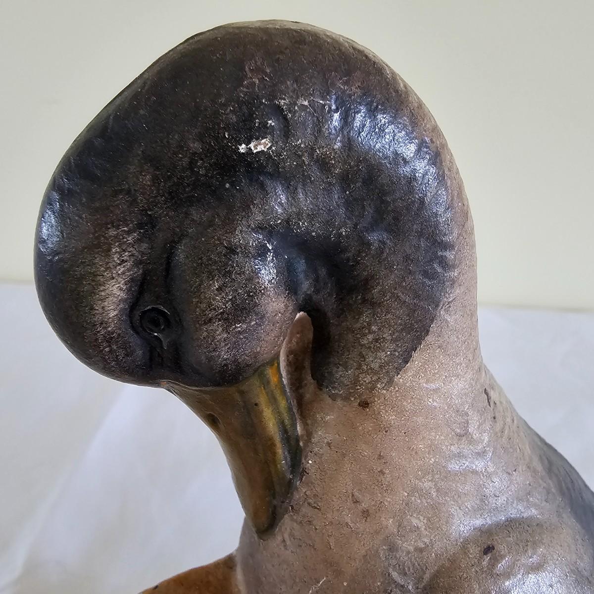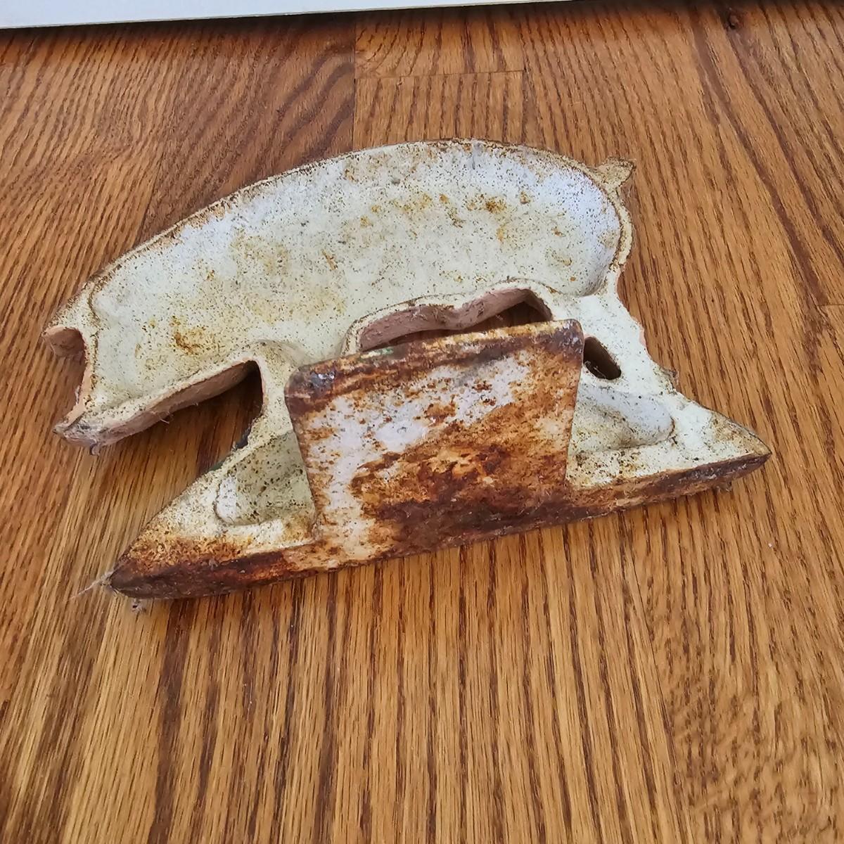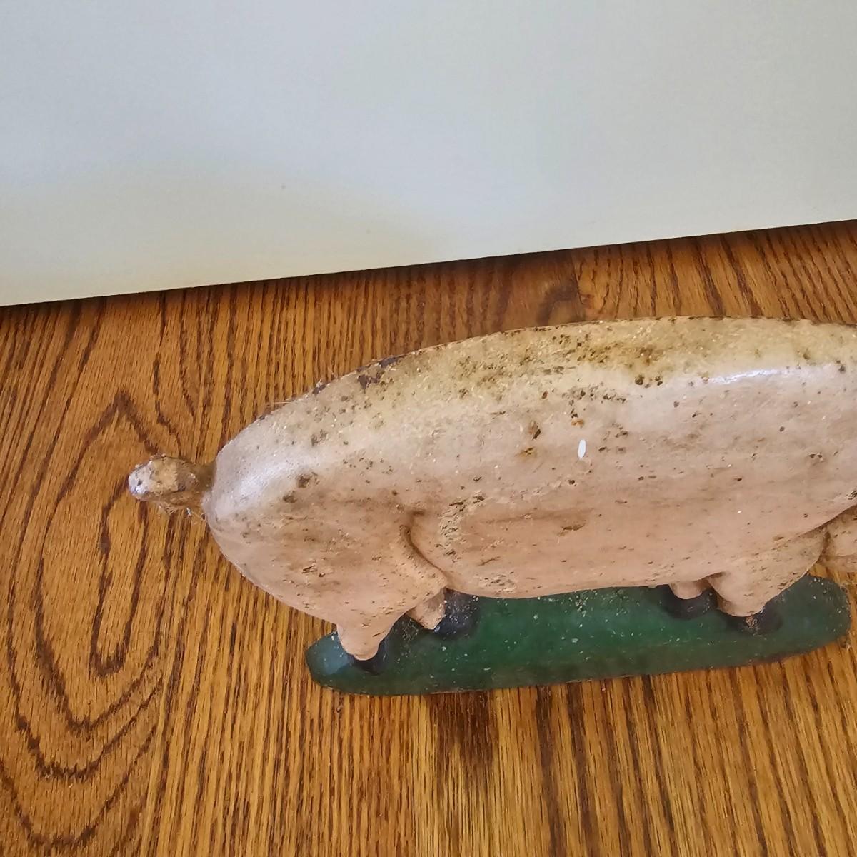Two items includes a pair of ducks and a pig as cast iron doorstops. Painted in natural colors, the ducks measure 3" x 7" x 8.5"H. Slight wear on bottom front and near top of tall head. Pig has some wear and rust spots, measures 3.5" x 8" x 6"H. See photos for details. Shipping available.
