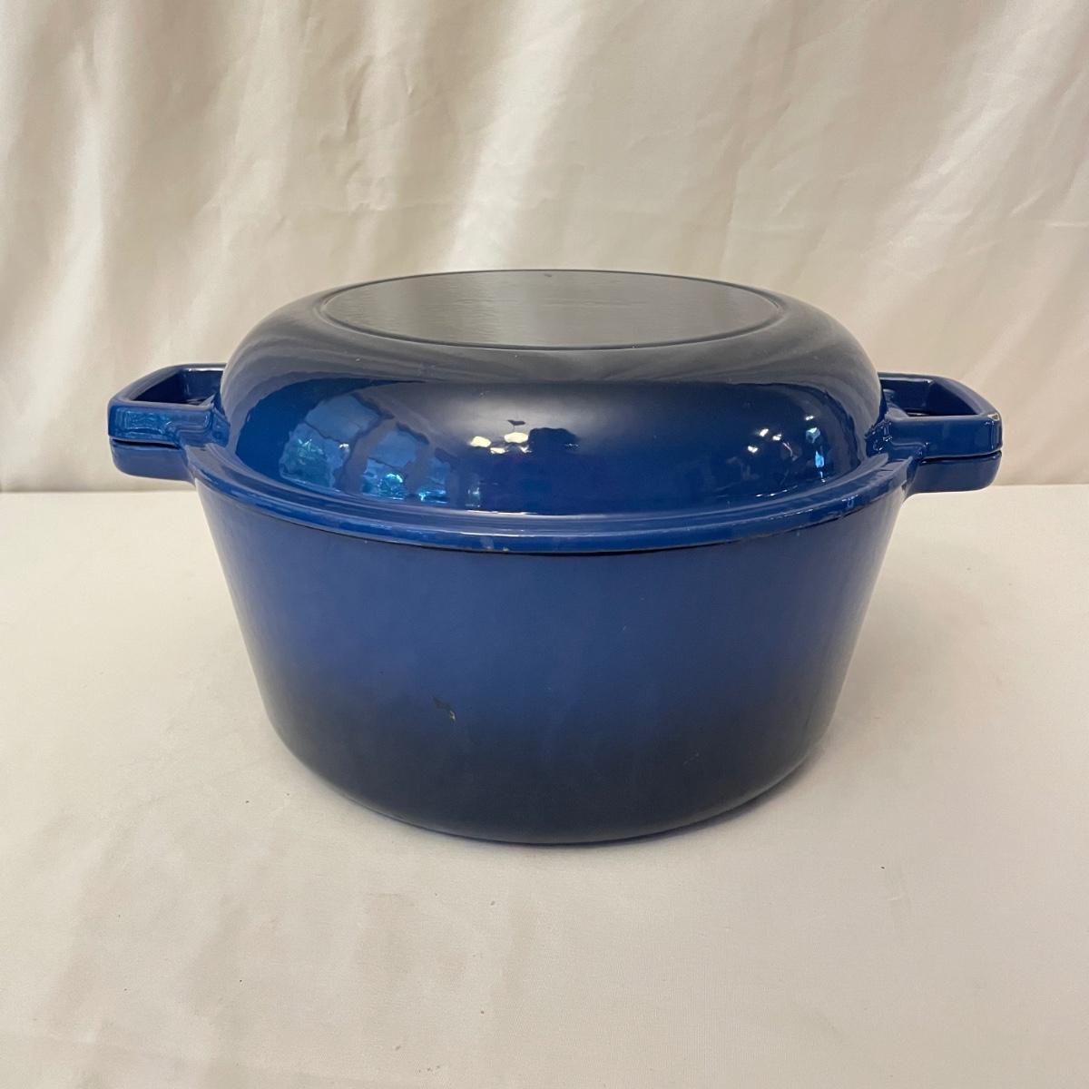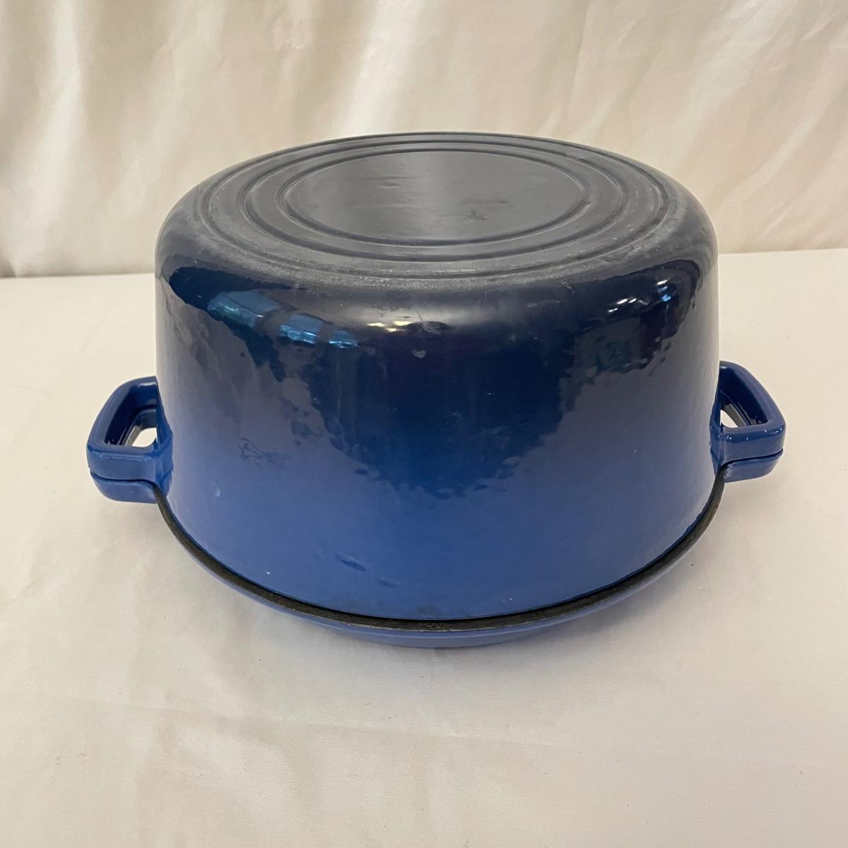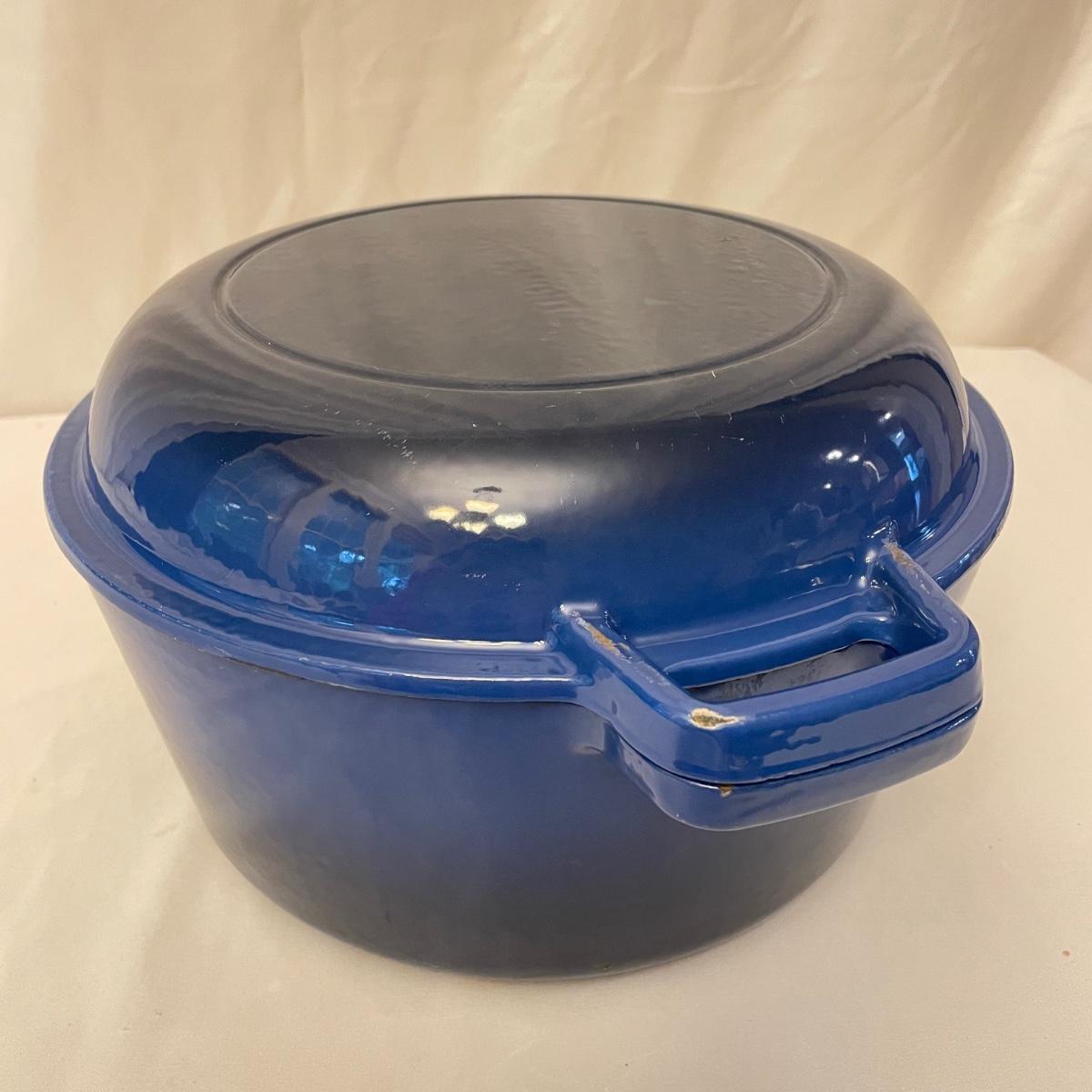 Classically ombré, deep blue enamel and cast iron Dutch oven. Lid is flat and can be used as a skillet. There are a few small chips on both pieces, plus a larger chip on the outside base of the pot. Dutch oven measures 10”D x 6.5H”.