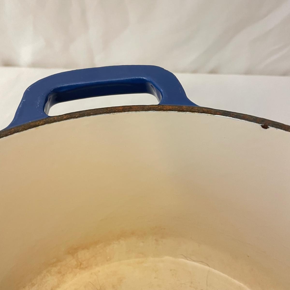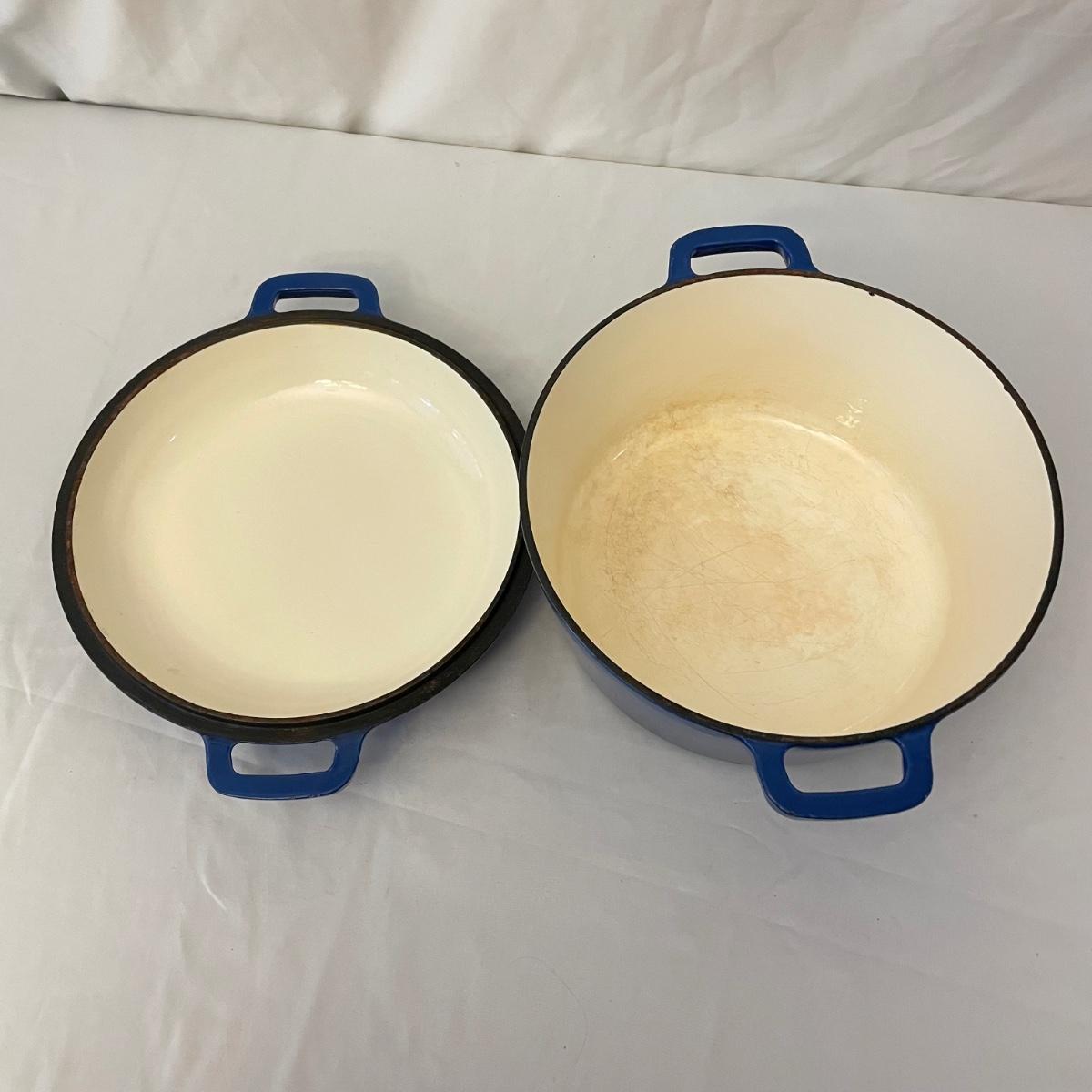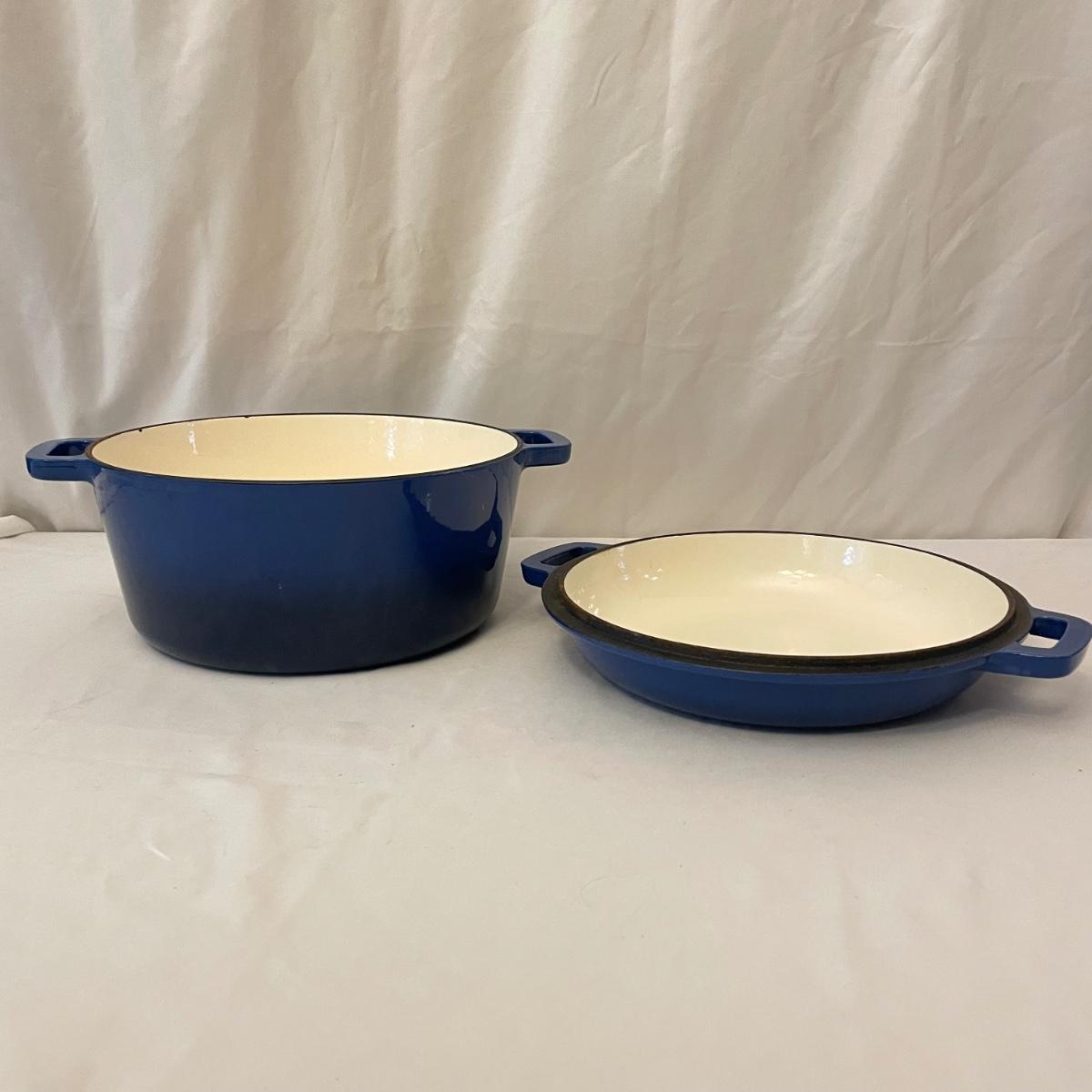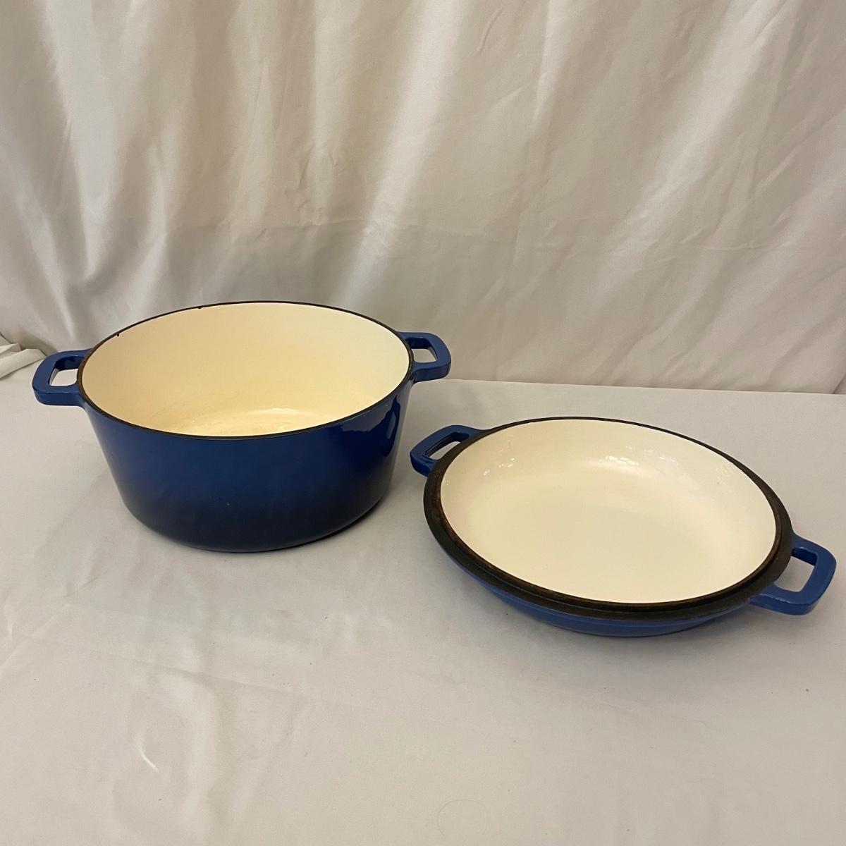 Classically ombré, deep blue enamel and cast iron Dutch oven. Lid is flat and can be used as a skillet. There are a few small chips on both pieces, plus a larger chip on the outside base of the pot. Dutch oven measures 10”D x 6.5H”.