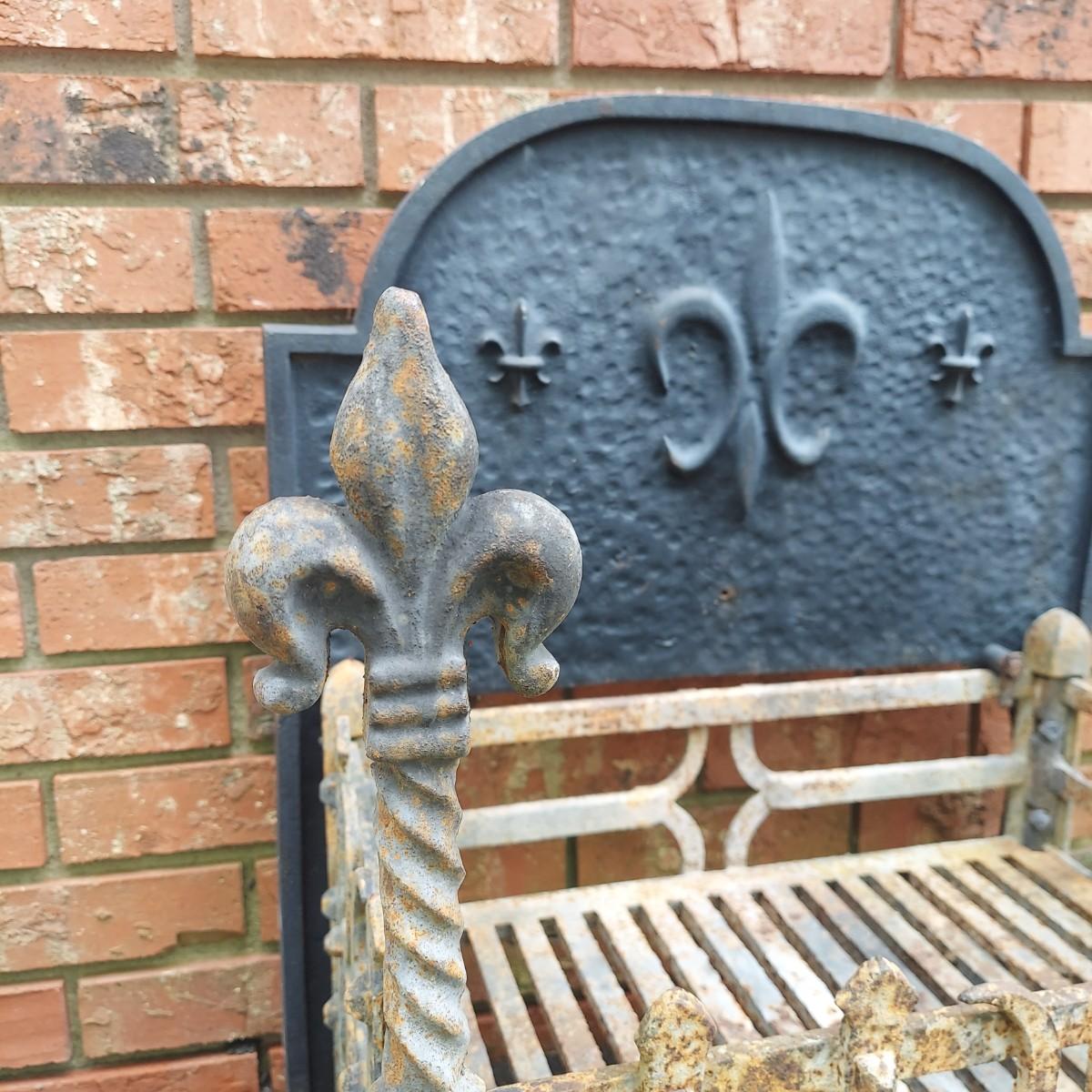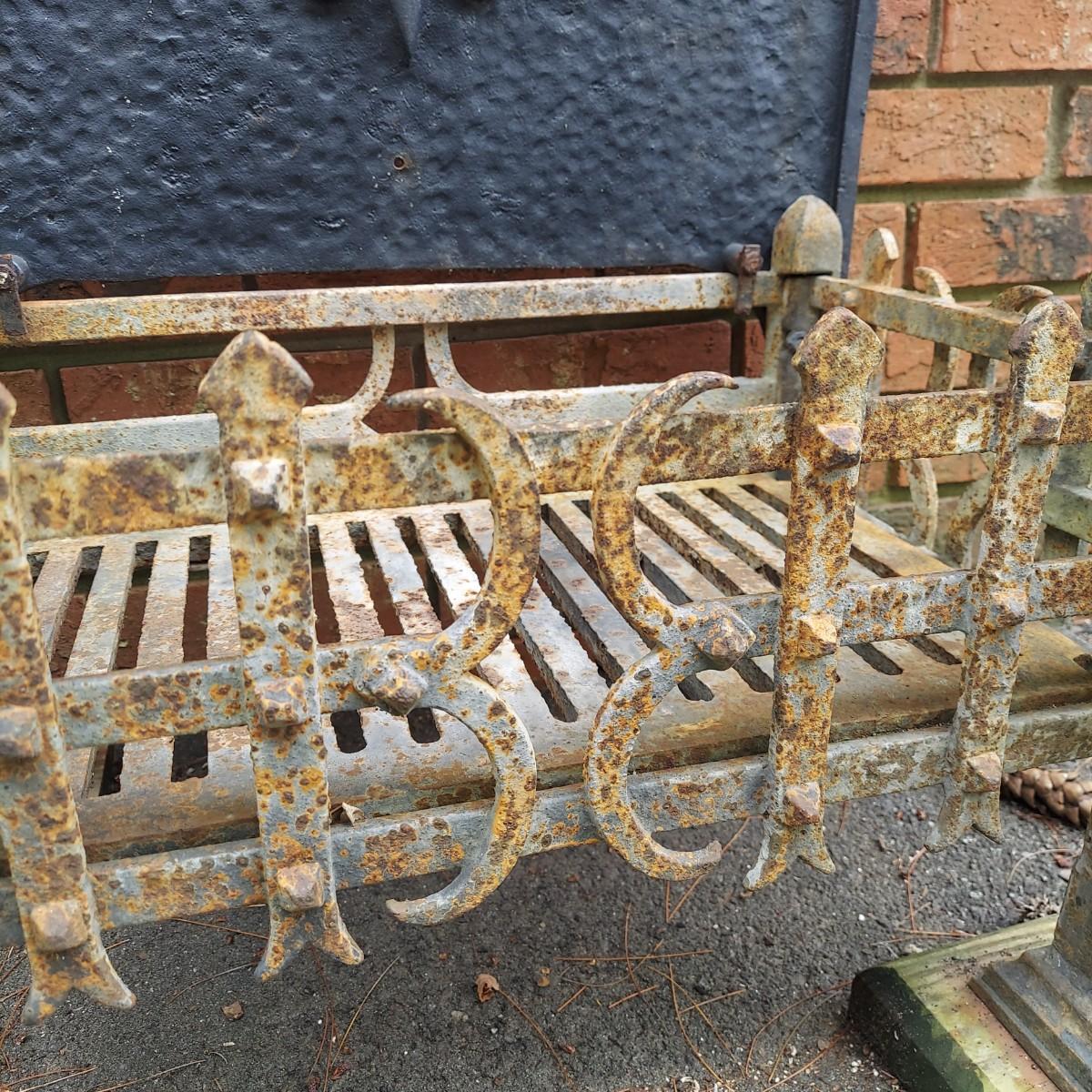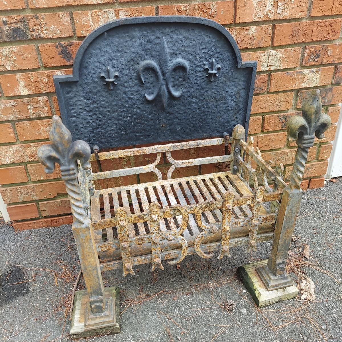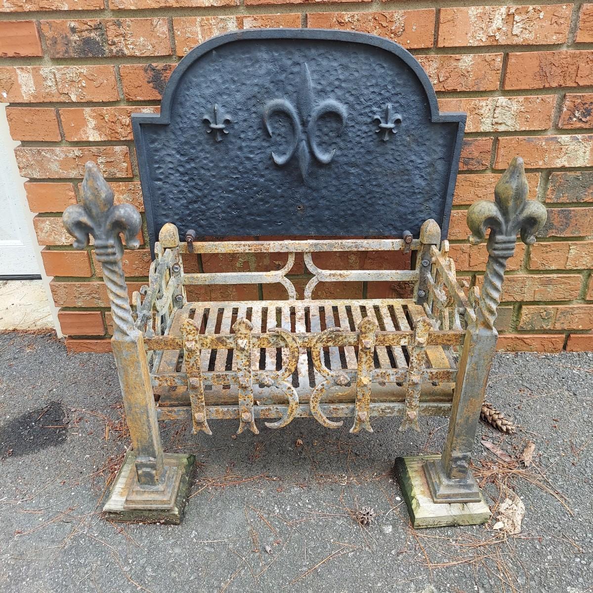 Lot includes a cast iron fire grate with backplate that appears to be vintage. Item has some rust and wear as it is currently sitting outside. Item measures 20" x 14" x 25"H. The backplate slips off into a separate piece but both items are very heavy! Local Pickup Only. Winning bidder must bring assistance to help move and load this item due to its weight and/or size.