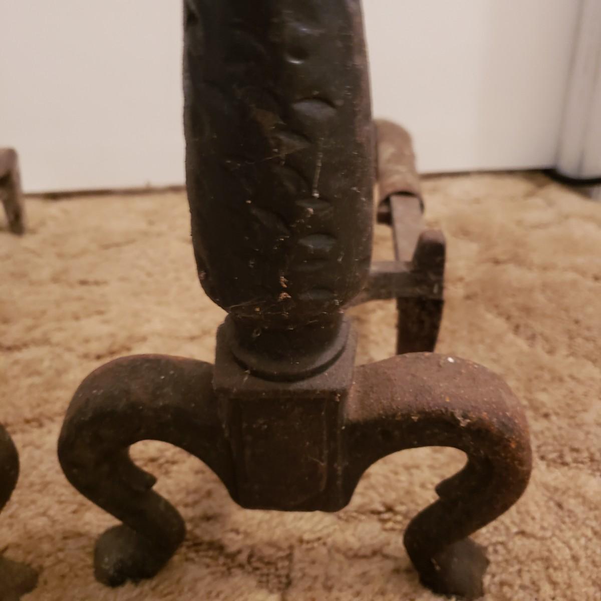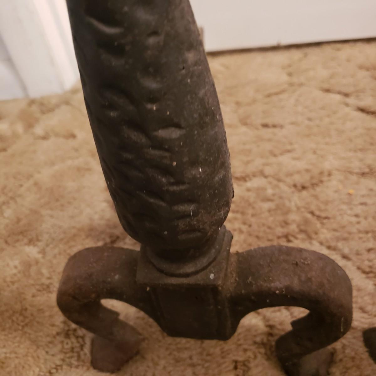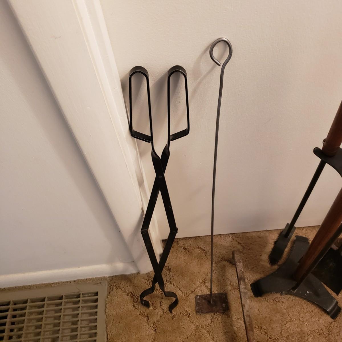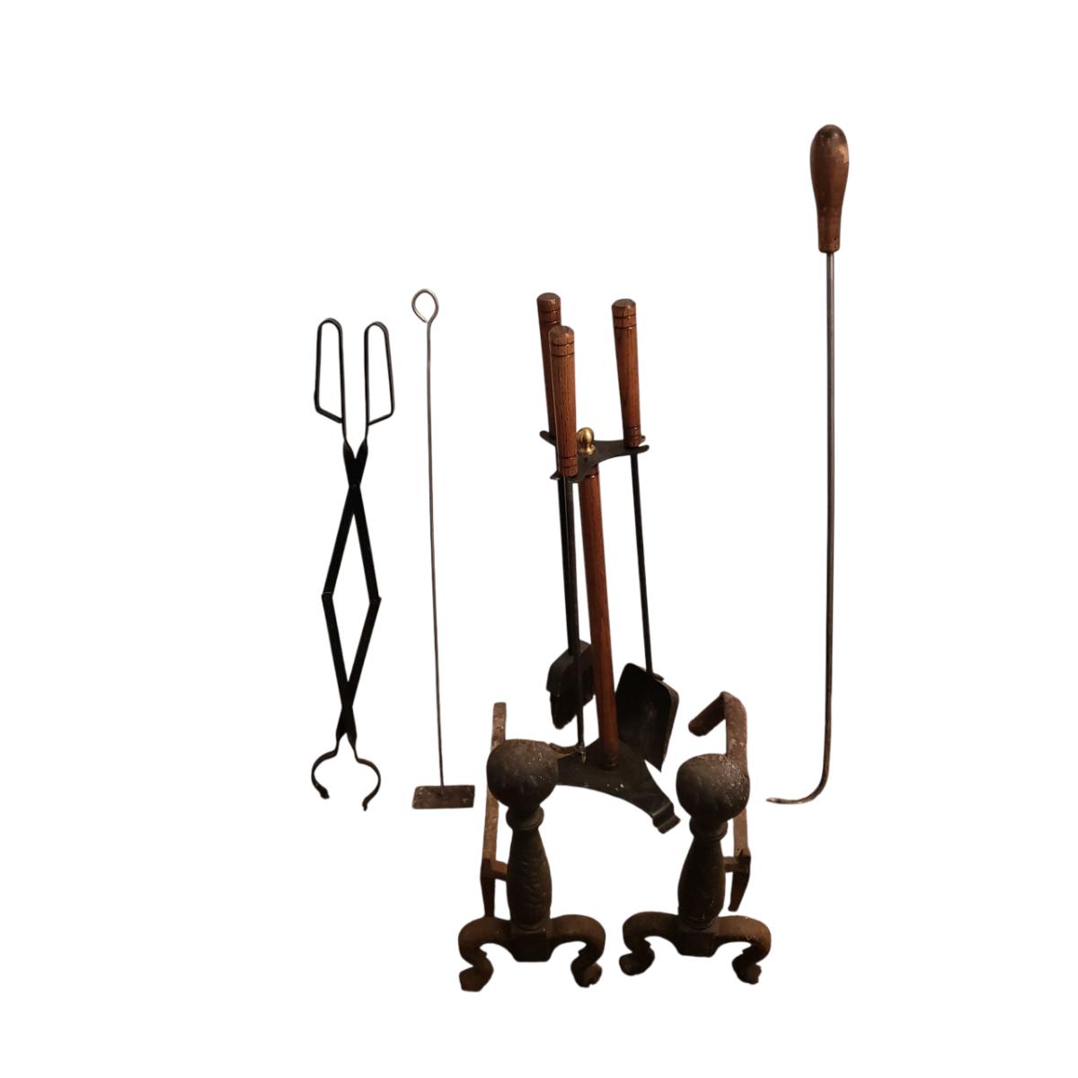 This fireplace tool lot features a pair of cast iron andirons. They are heavy to the touch and one has been repaired, yet still stands sturdy. The fireplace set (10" x 29"H) has a metal base and wood features. The three extra tools definitely come in handy. The wooden handled hook measures 36" long. Also includes a metal wood rack with tarp and canvas wood toting bag.