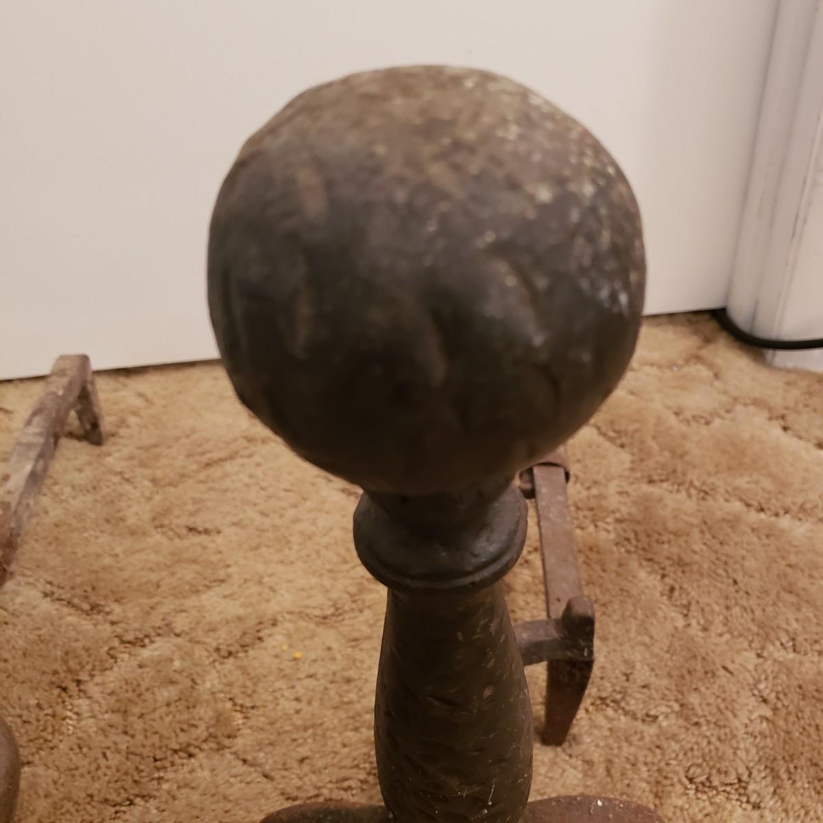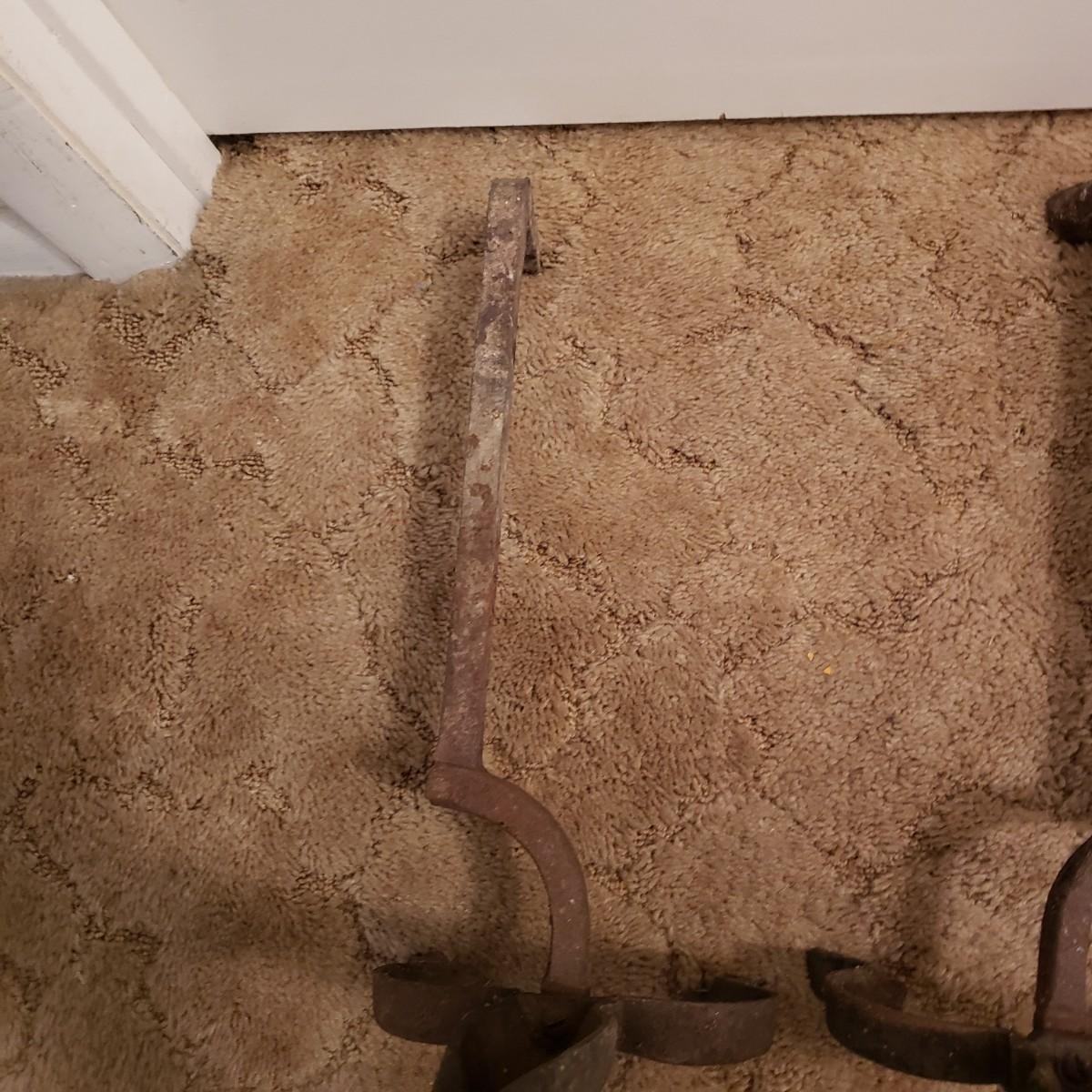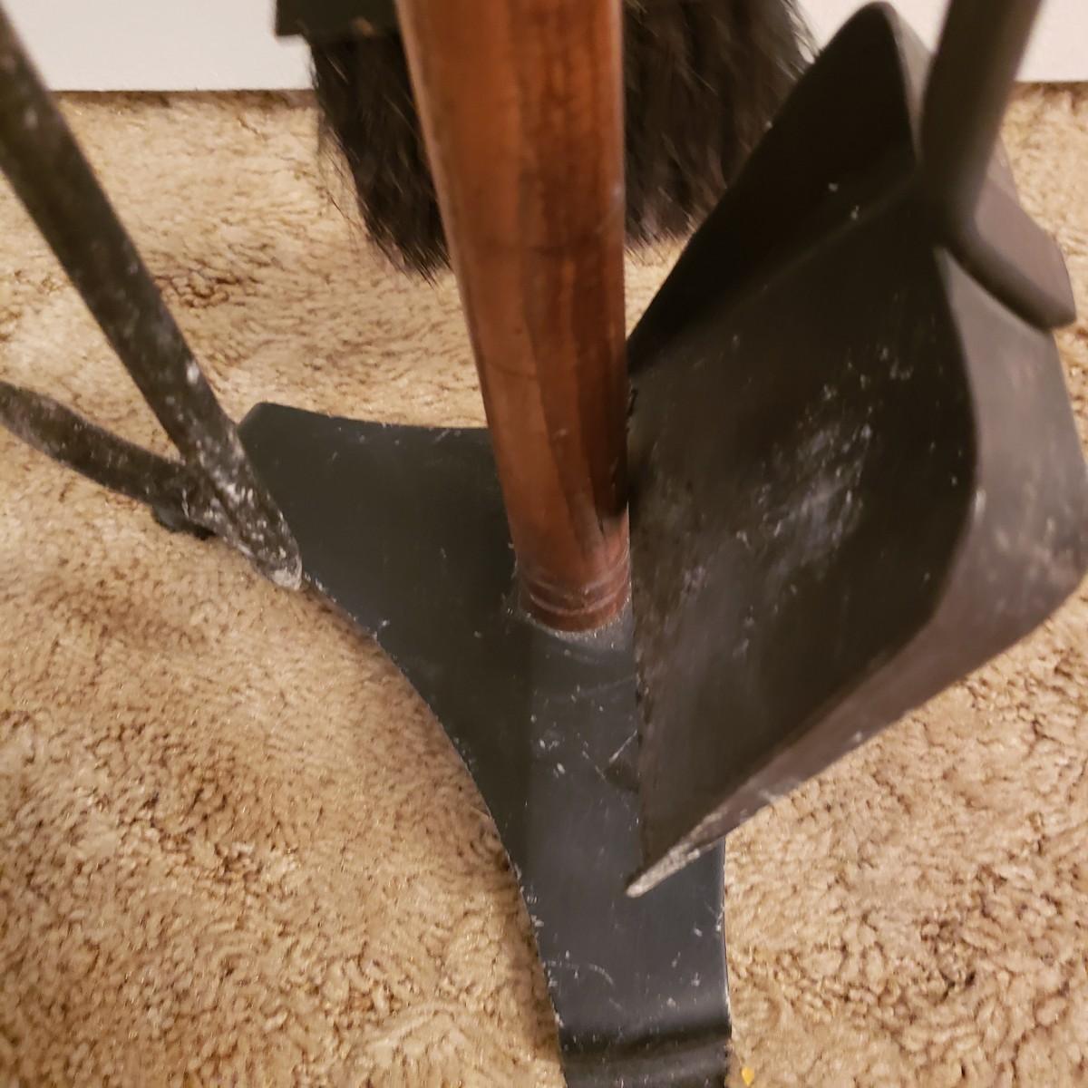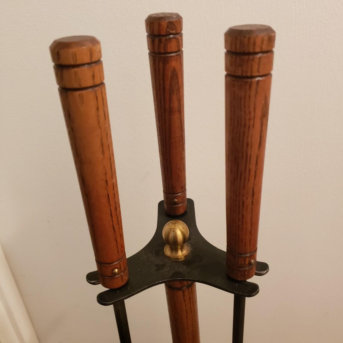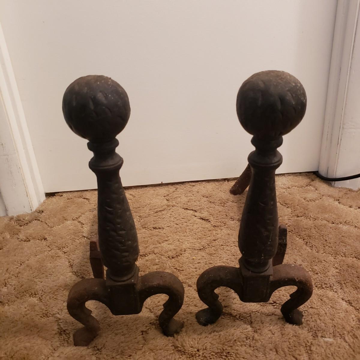 This fireplace tool lot features a pair of cast iron andirons. They are heavy to the touch and one has been repaired, yet still stands sturdy. The fireplace set (10" x 29"H) has a metal base and wood features. The three extra tools definitely come in handy. The wooden handled hook measures 36" long. Also includes a metal wood rack with tarp and canvas wood toting bag.