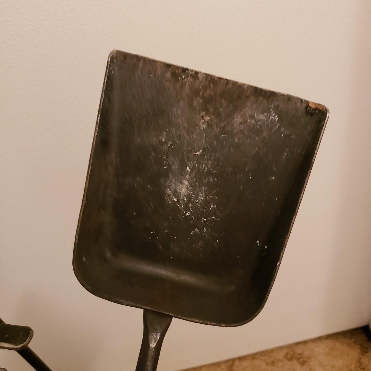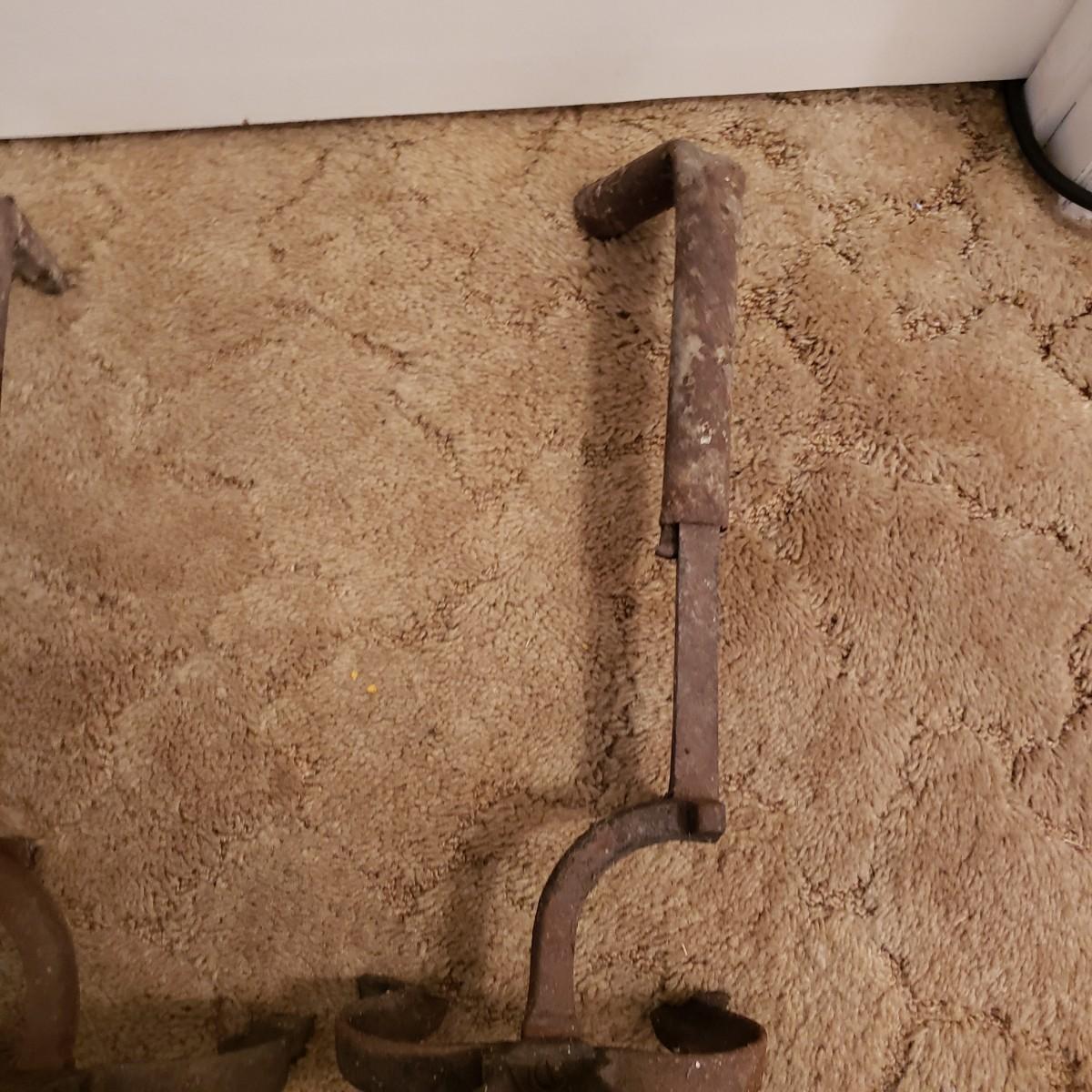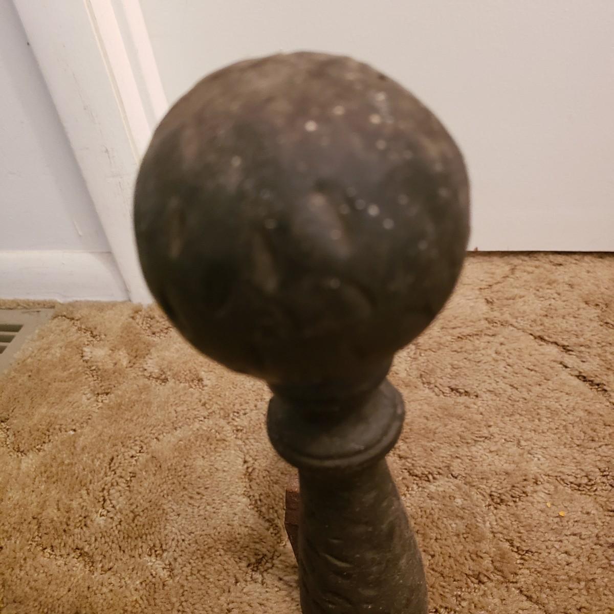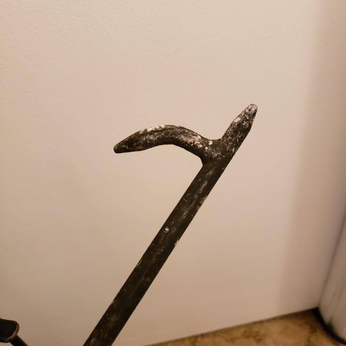This fireplace tool lot features a pair of cast iron andirons. They are heavy to the touch and one has been repaired, yet still stands sturdy. The fireplace set (10" x 29"H) has a metal base and wood features. The three extra tools definitely come in handy. The wooden handled hook measures 36" long. Also includes a metal wood rack with tarp and canvas wood toting bag.