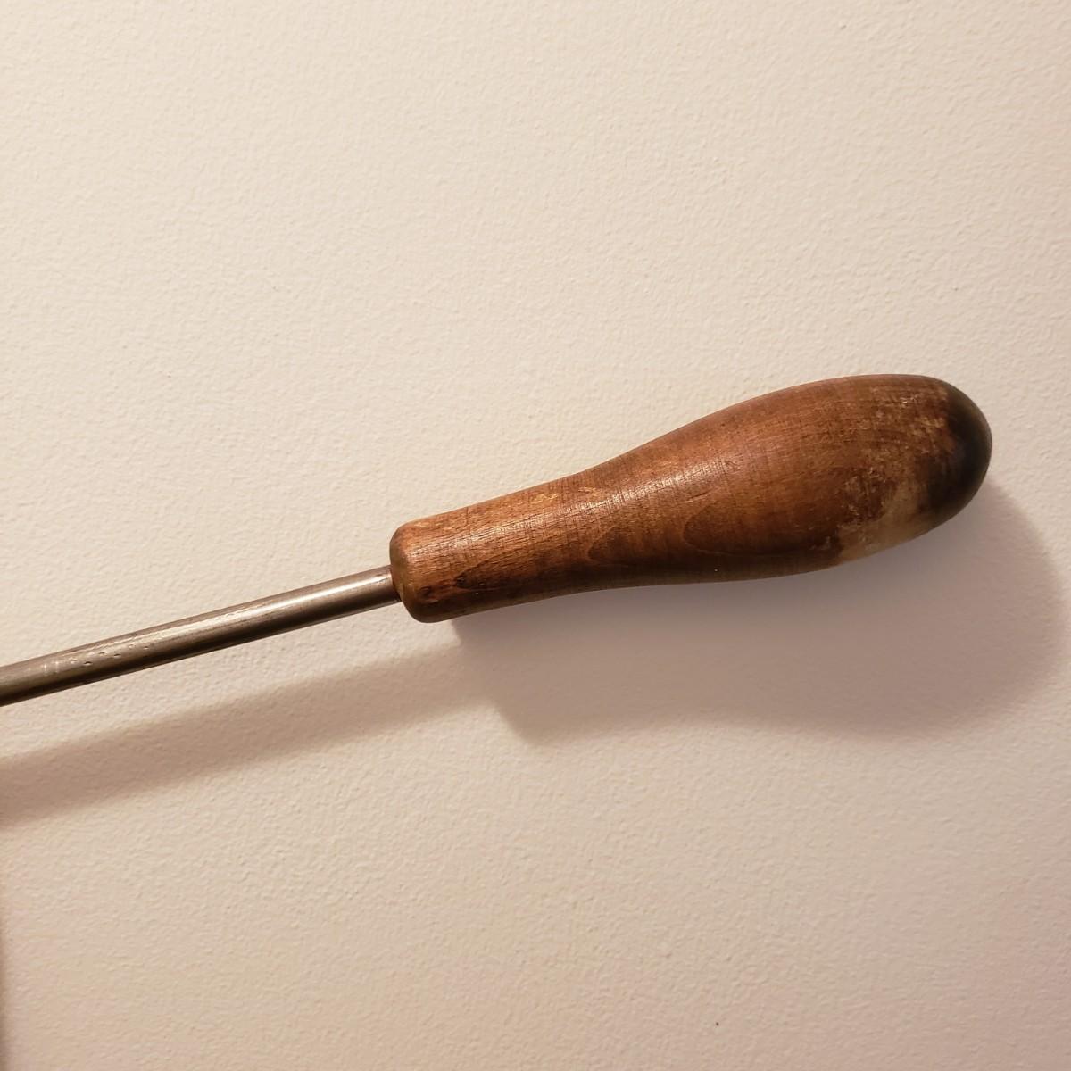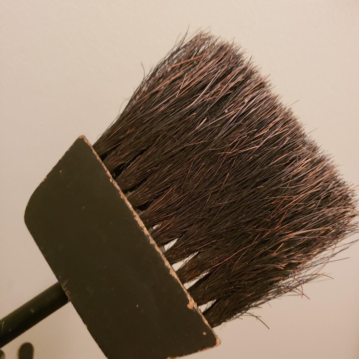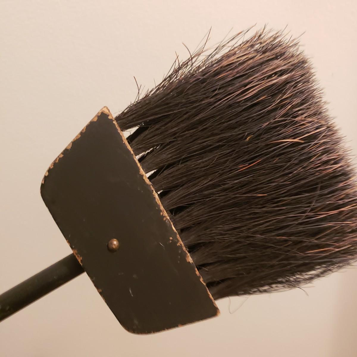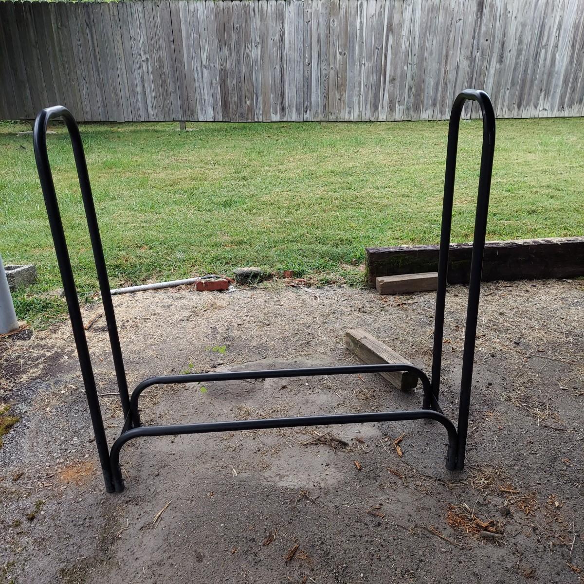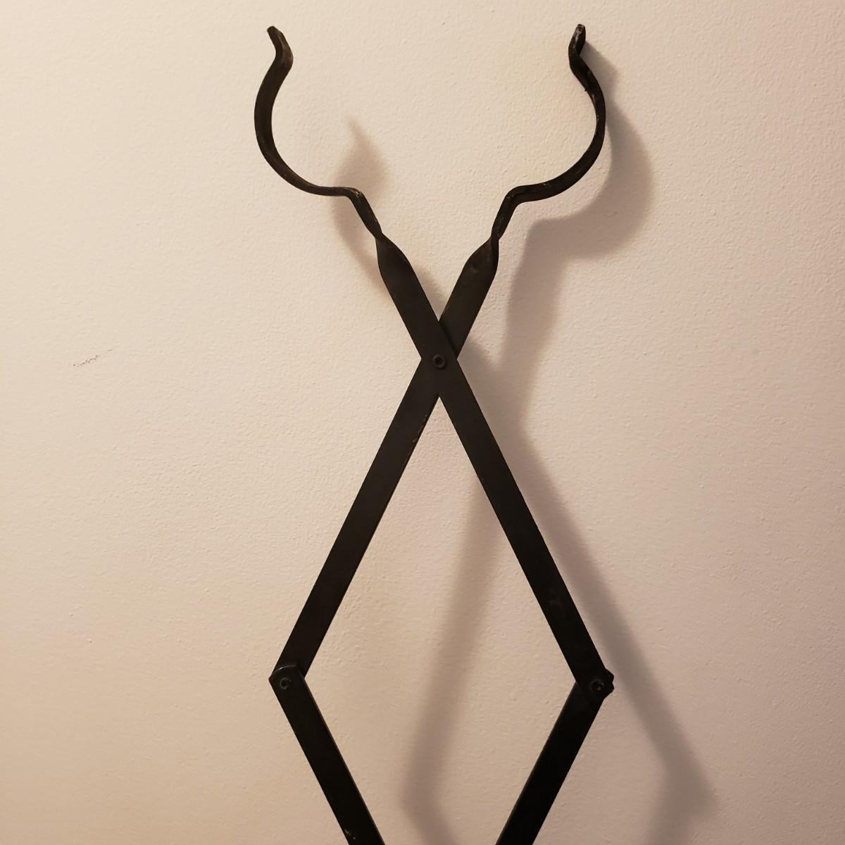 This fireplace tool lot features a pair of cast iron andirons. They are heavy to the touch and one has been repaired, yet still stands sturdy. The fireplace set (10" x 29"H) has a metal base and wood features. The three extra tools definitely come in handy. The wooden handled hook measures 36" long. Also includes a metal wood rack with tarp and canvas wood toting bag.