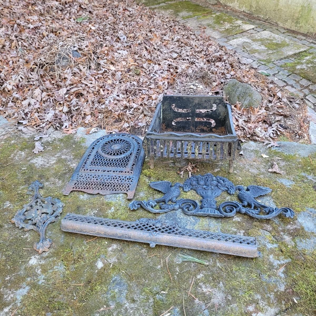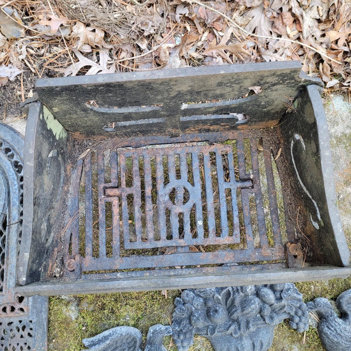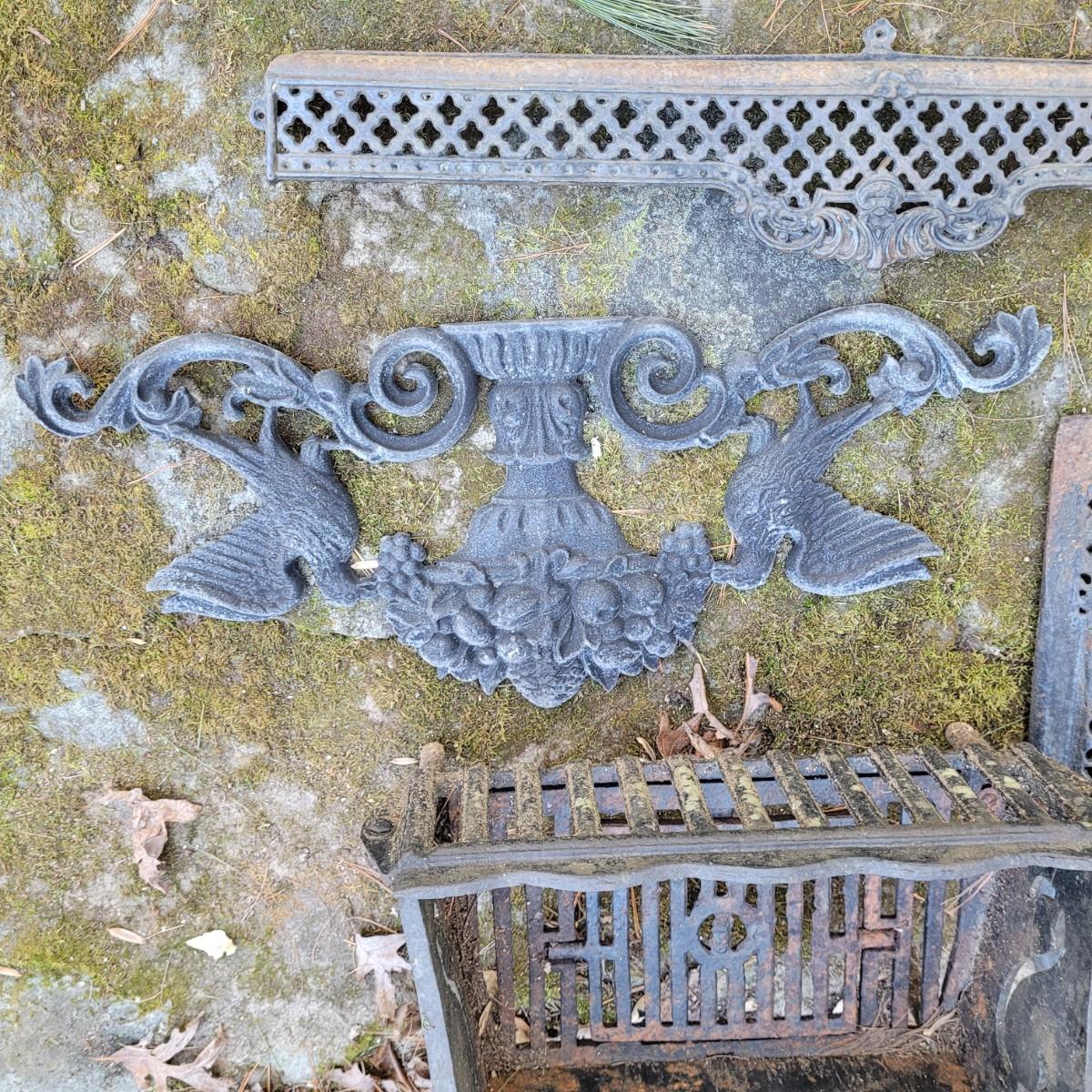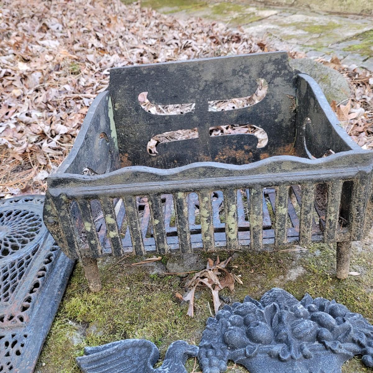 This lot of cast iron garden decor includes a fireplace basket and various wall hangings. Various rust and cracks are shown in images. Basket measures approximately 19" x 11" x 14"H. Local pickup only.