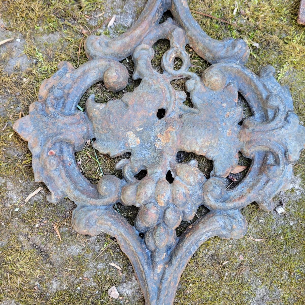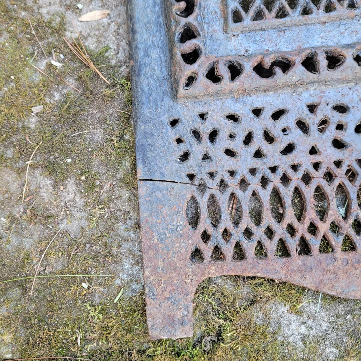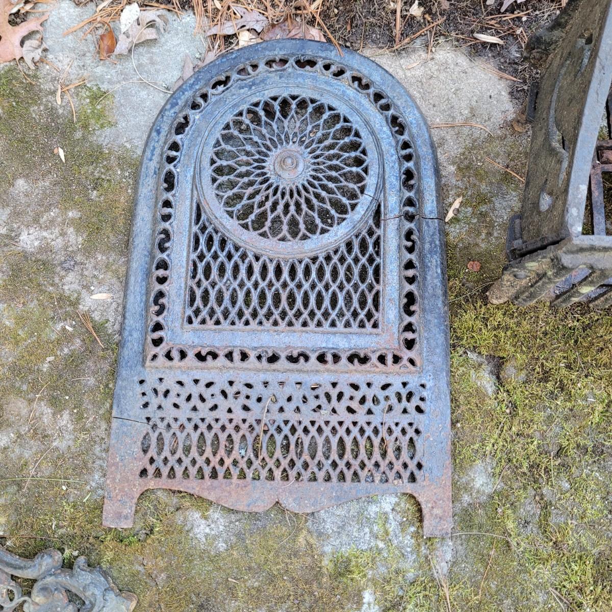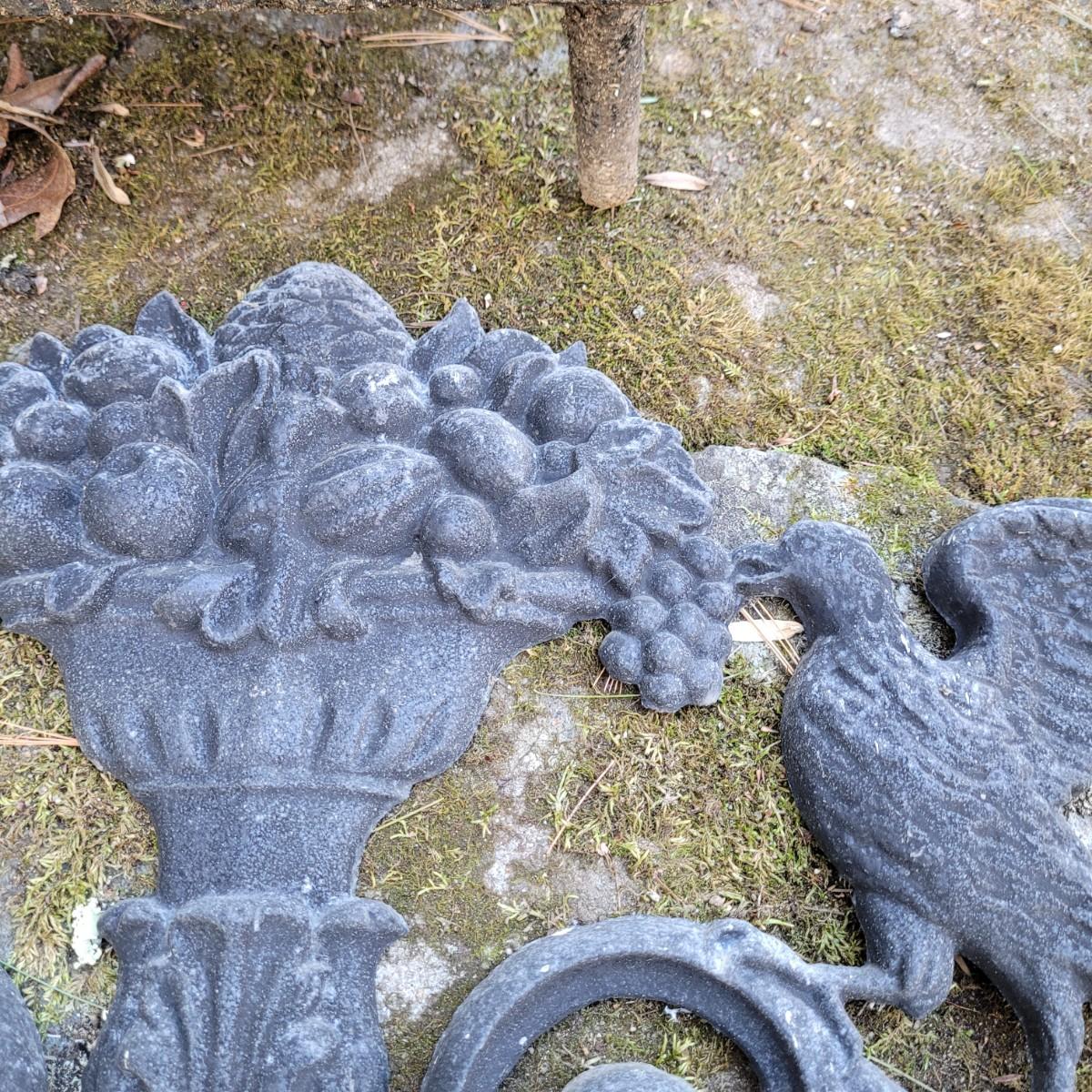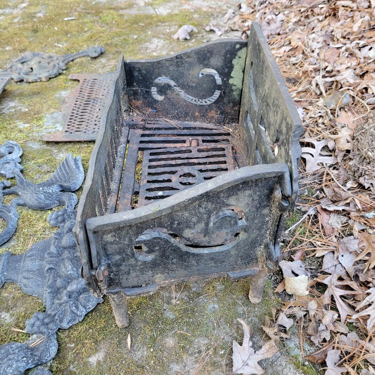 This lot of cast iron garden decor includes a fireplace basket and various wall hangings. Various rust and cracks are shown in images. Basket measures approximately 19" x 11" x 14"H. Local pickup only.