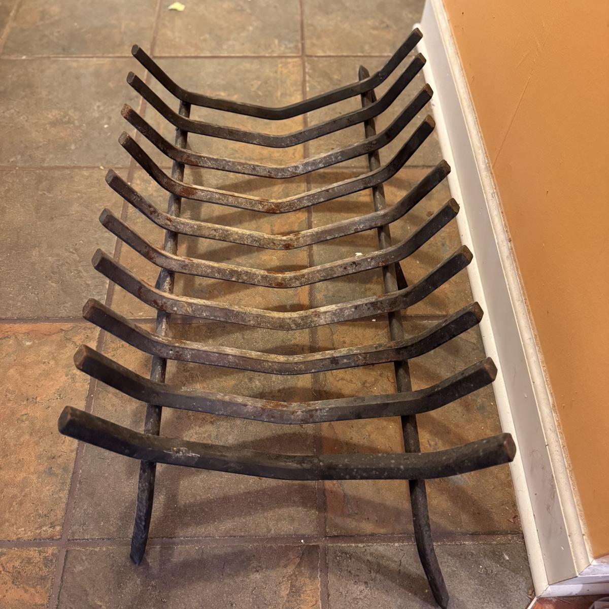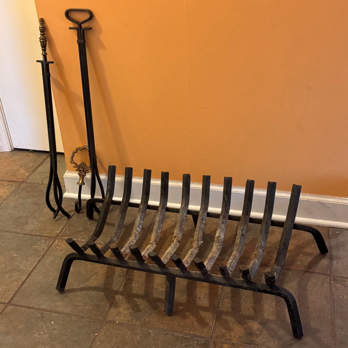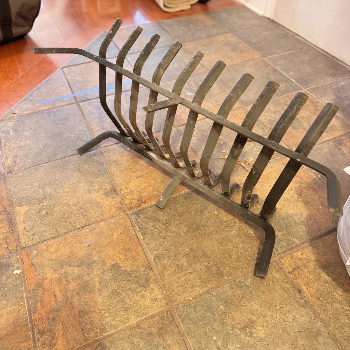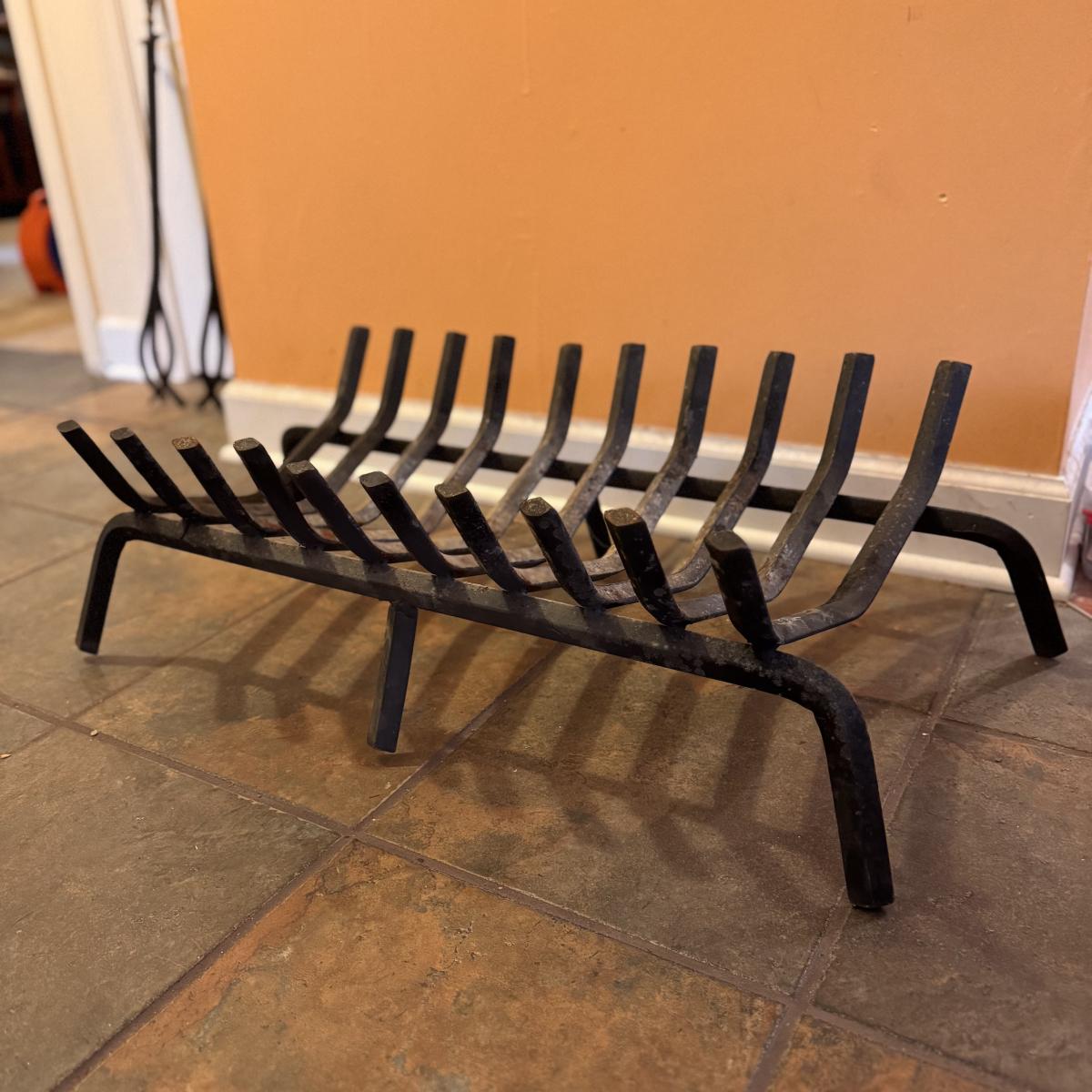 Lot includes one cast iron fireplace grate, along with two cast iron fireplace tongs, one fireplace damper pull, and one L.L. bean firewood storage bag. The fireplace grate measures 28.5” x 14” x 6”H. Local pickup only.
