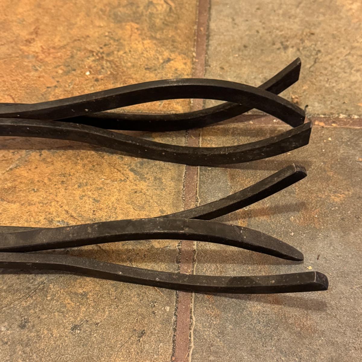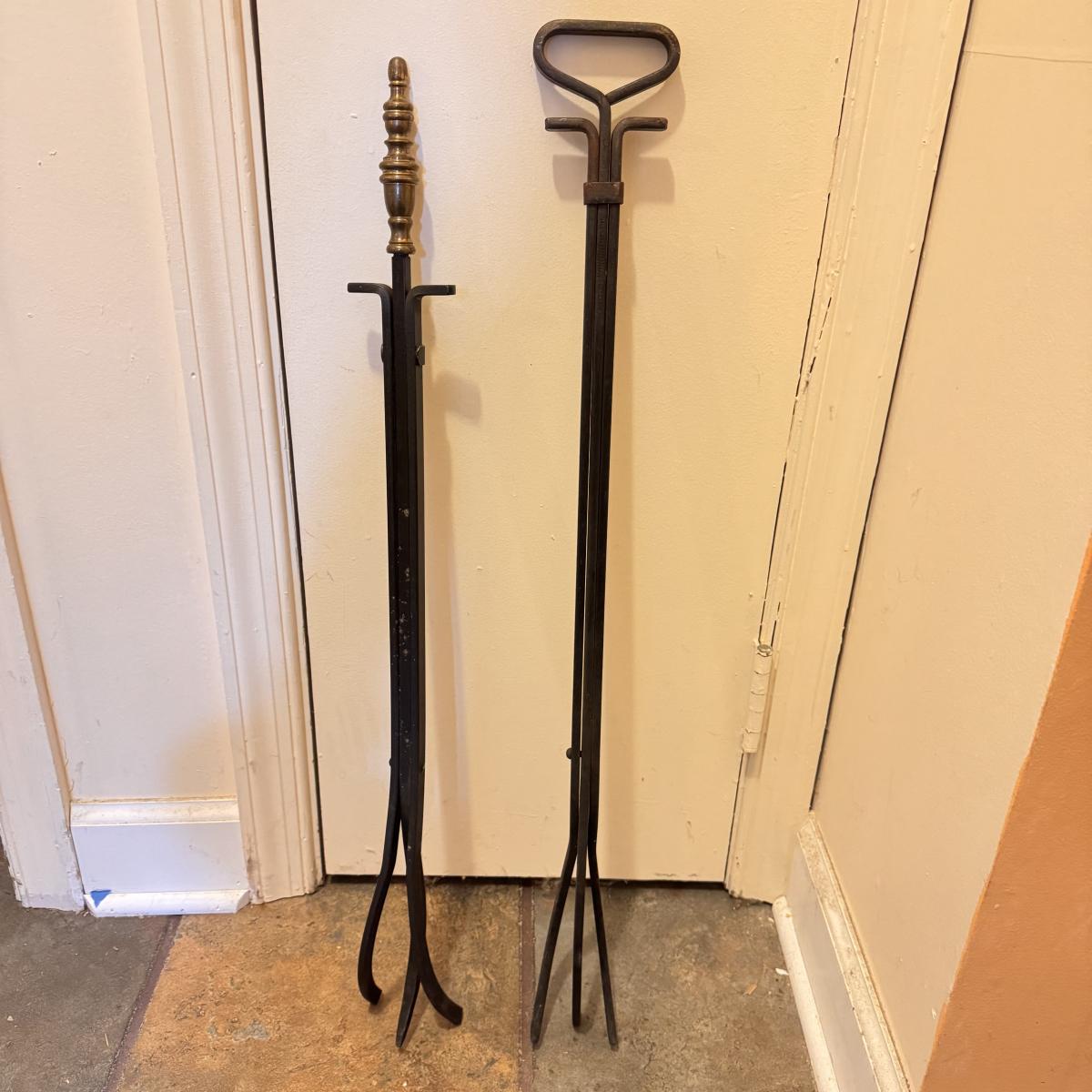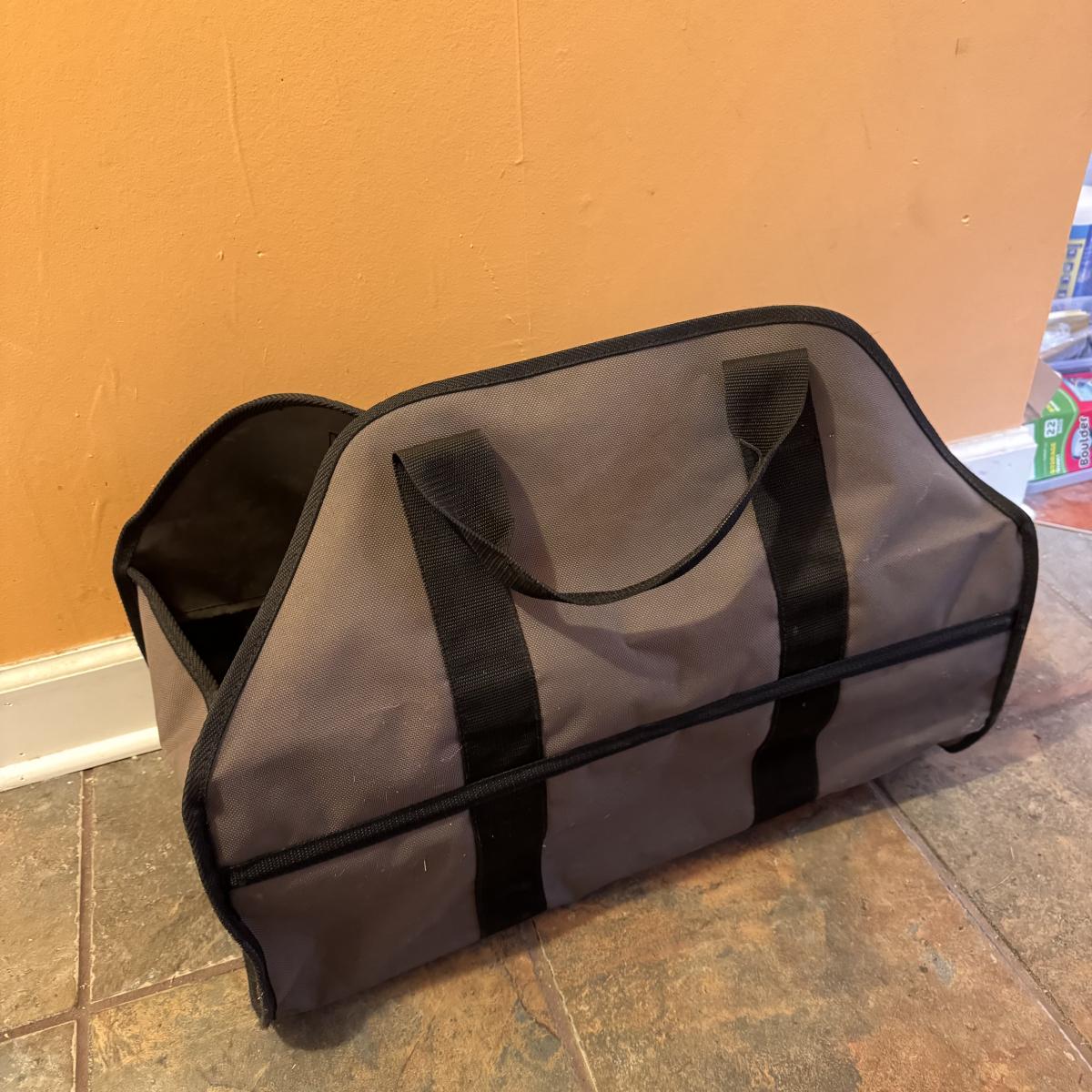 Lot includes one cast iron fireplace grate, along with two cast iron fireplace tongs, one fireplace damper pull, and one L.L. bean firewood storage bag. The fireplace grate measures 28.5” x 14” x 6”H. Local pickup only.