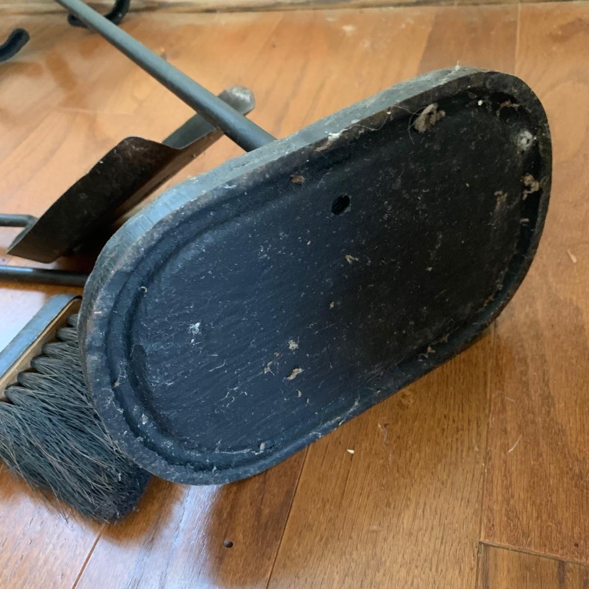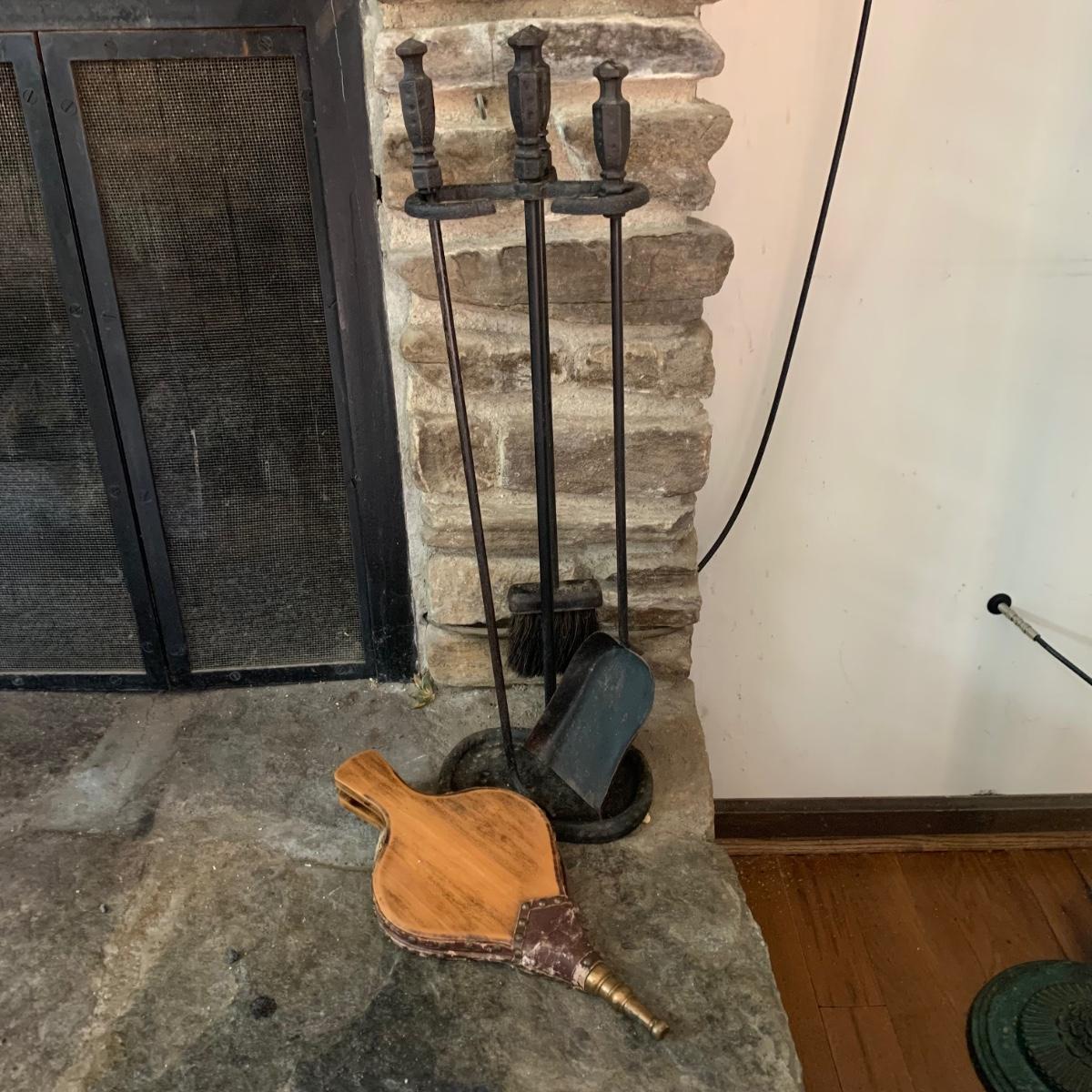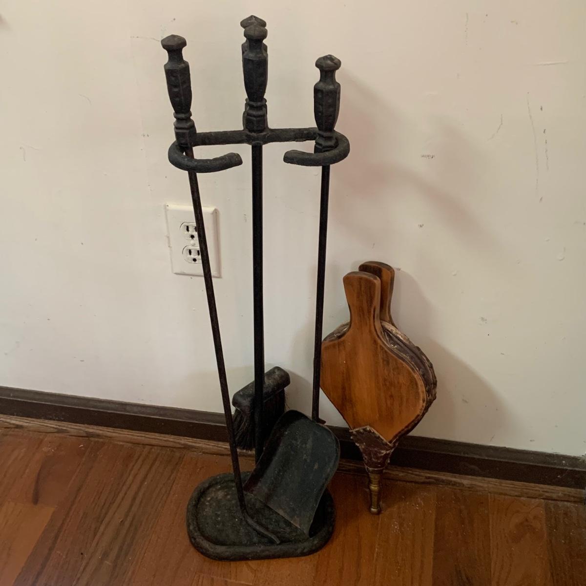 Fireplace tools featuring a cast iron stand and cast iron handles. Three tools are included plus a wooden bellows. Stand measures 8.5” x 6” x 29”H. All items are a bit dusty and show wear, see photos.