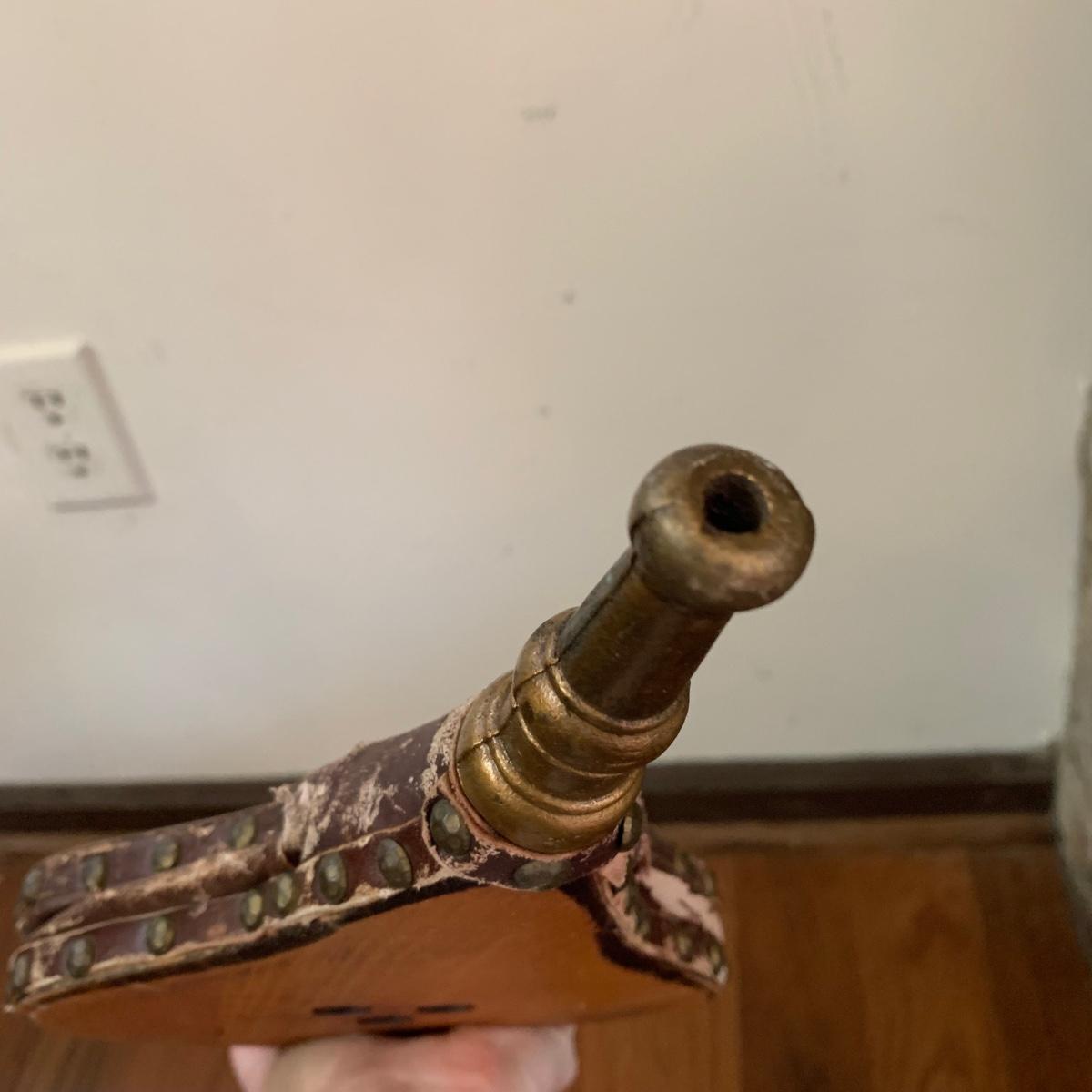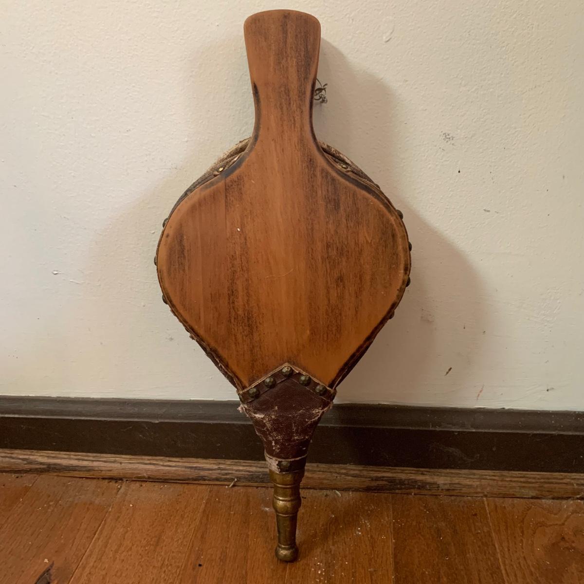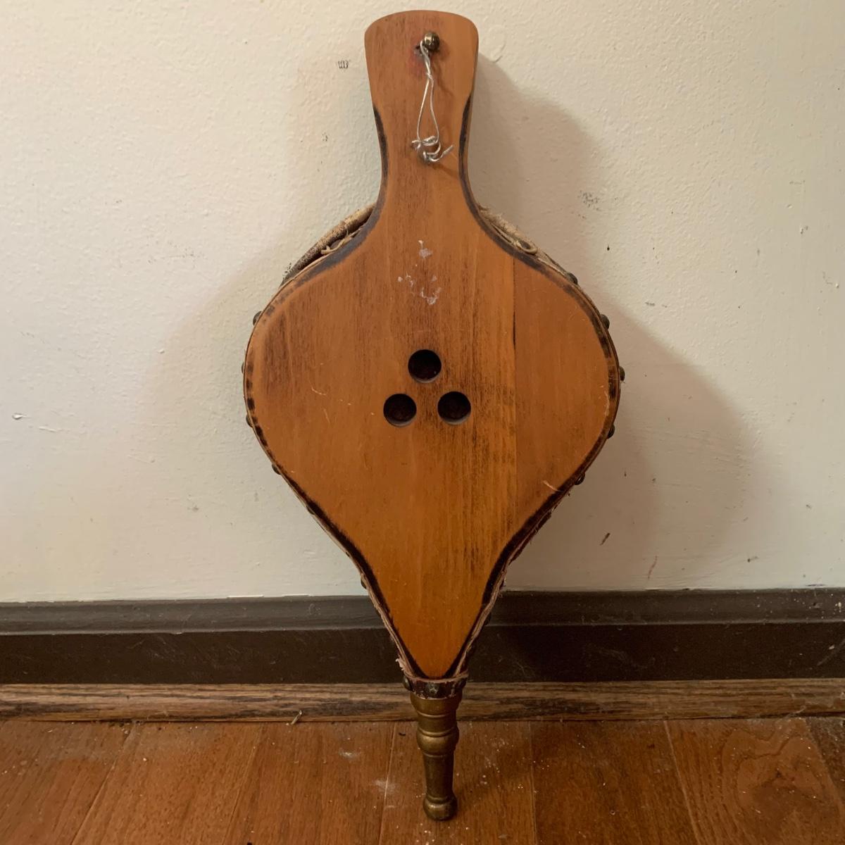 Fireplace tools featuring a cast iron stand and cast iron handles. Three tools are included plus a wooden bellows. Stand measures 8.5” x 6” x 29”H. All items are a bit dusty and show wear, see photos.