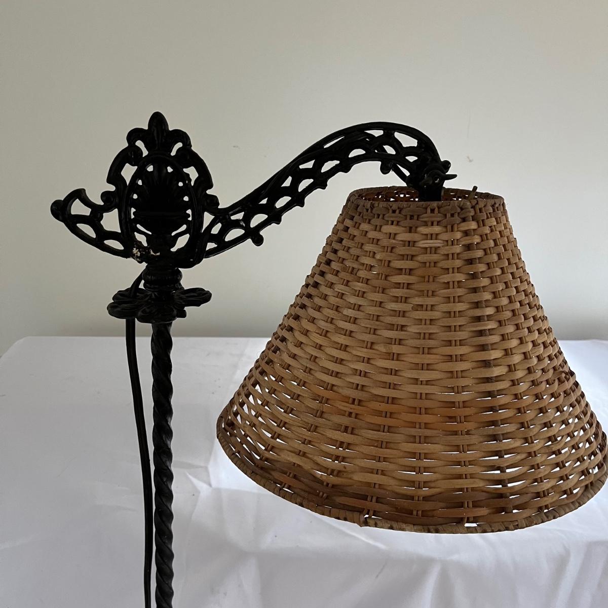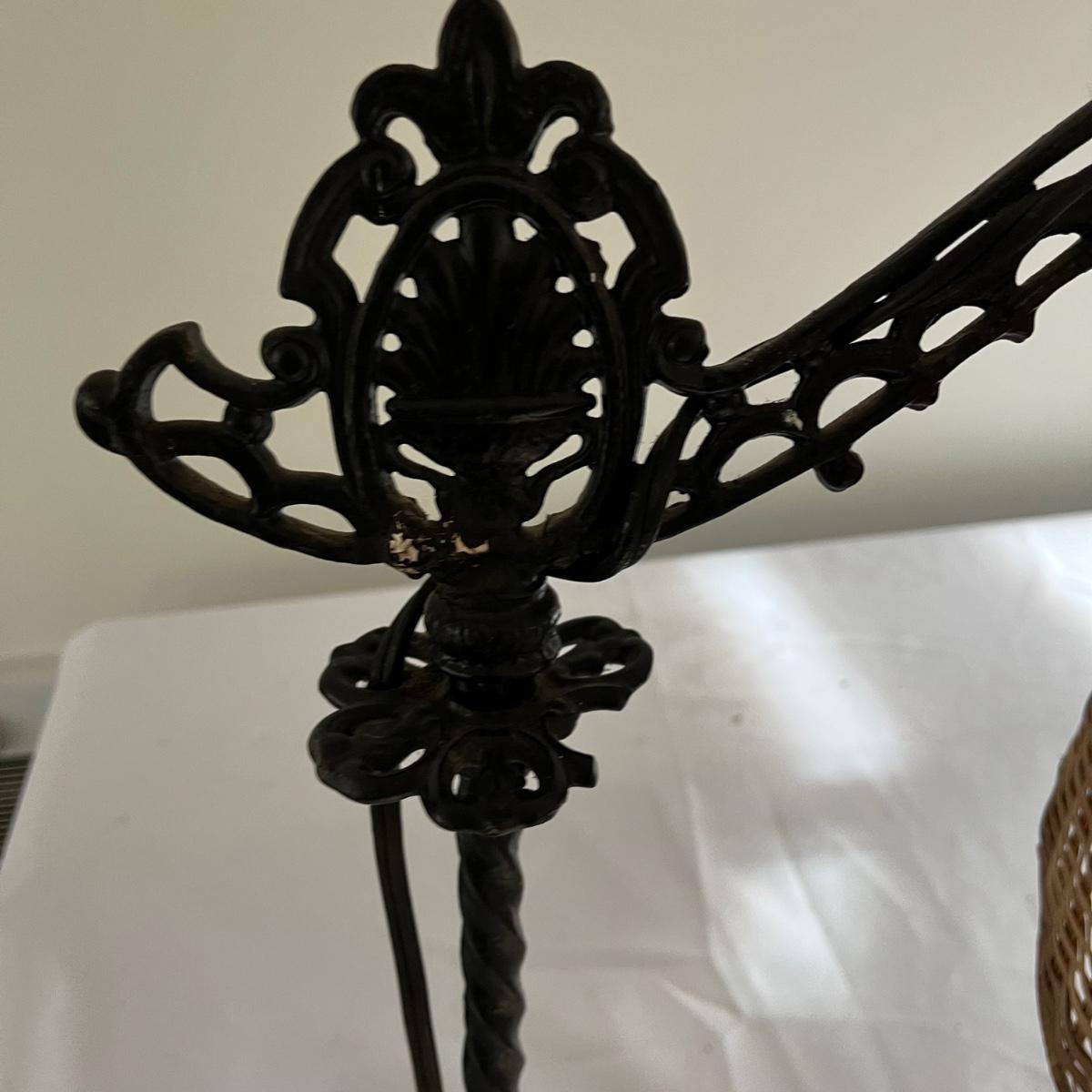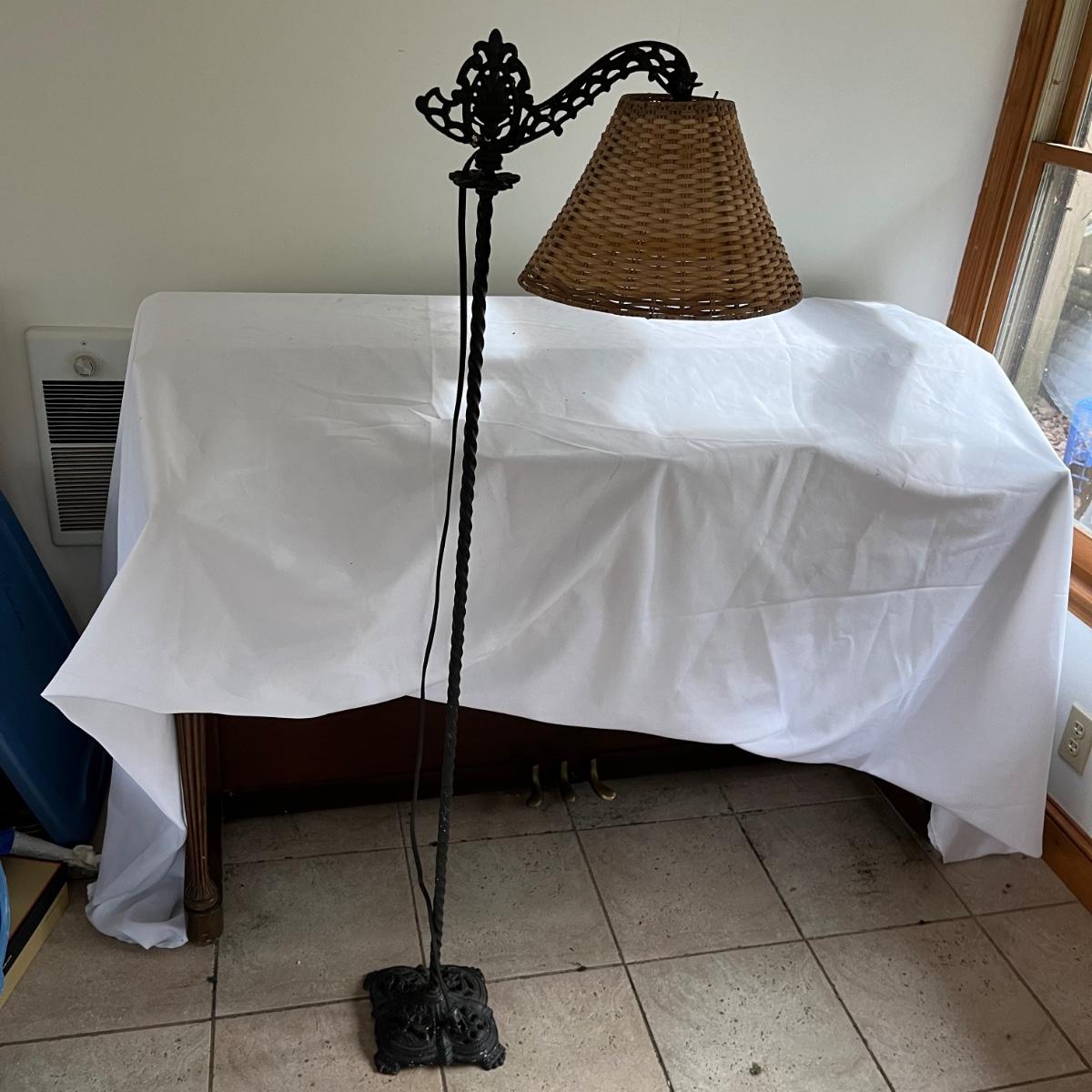 This cast iron floor lamp worked when tested and measures 55” tall with a 7.5” x 7.5” base.