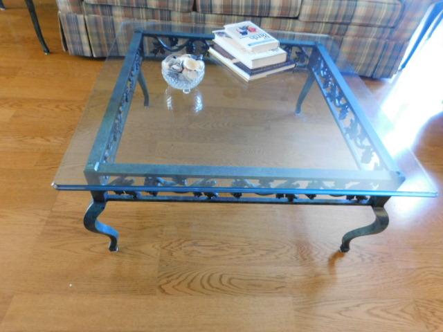 Cast Iron Frame Verdigris Glass Top Coffee Table 36" x 16". This is beautifully patina finished iron. Very heavy and sturdy built. Tempered glass