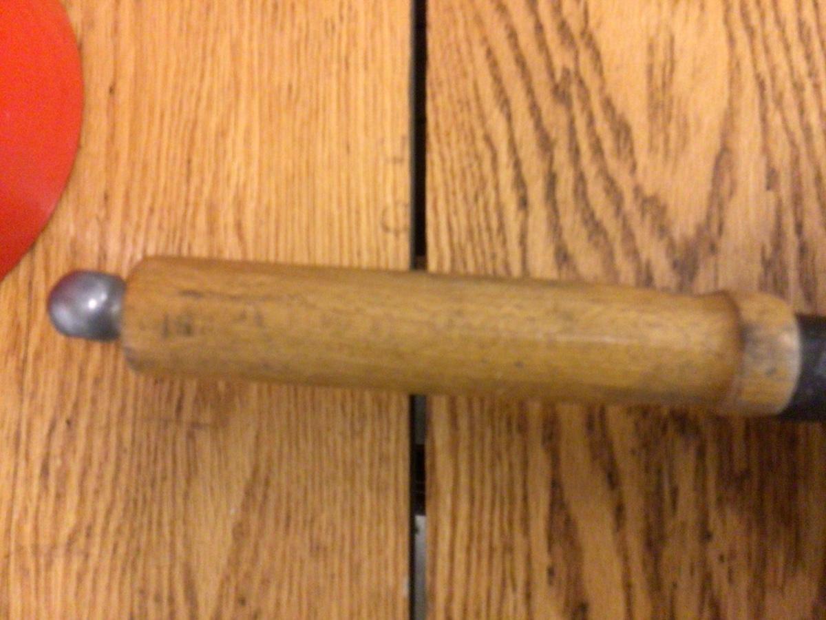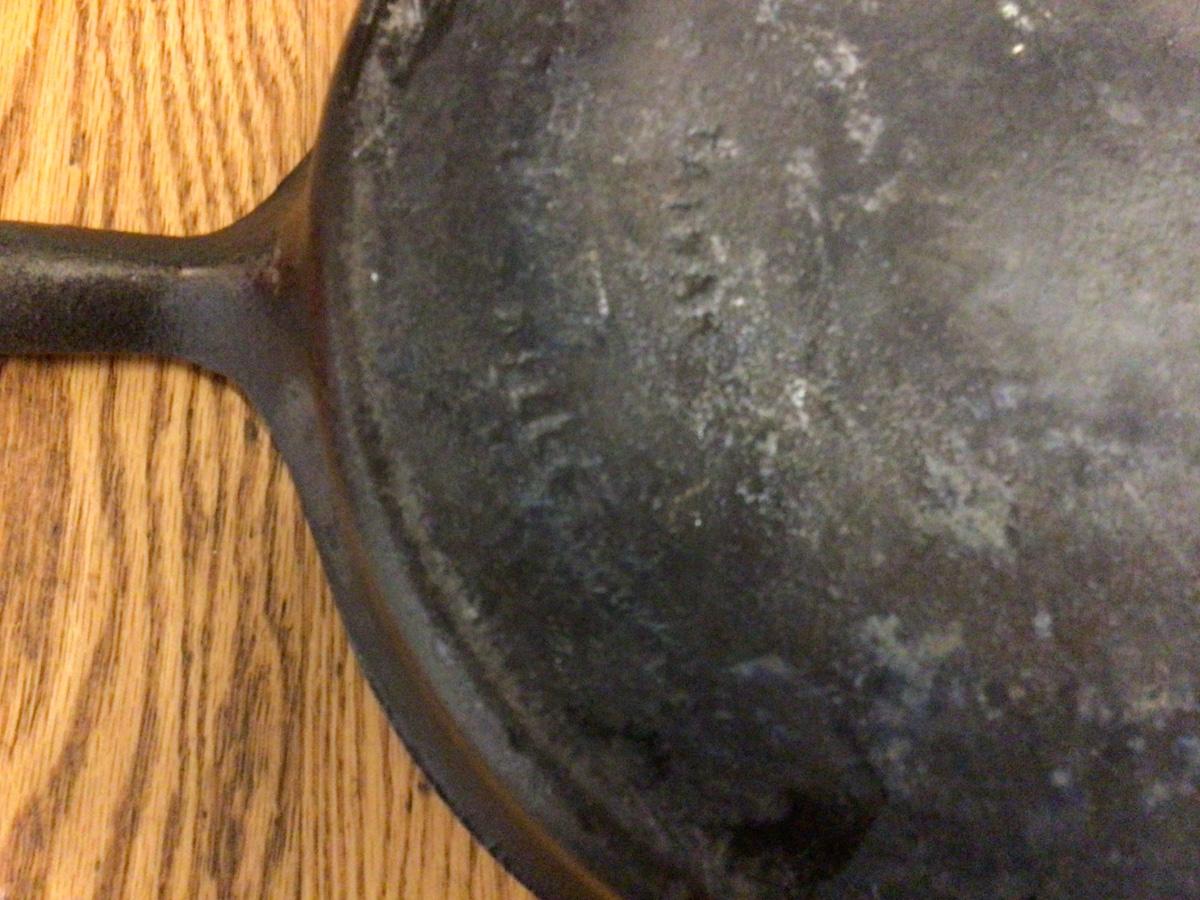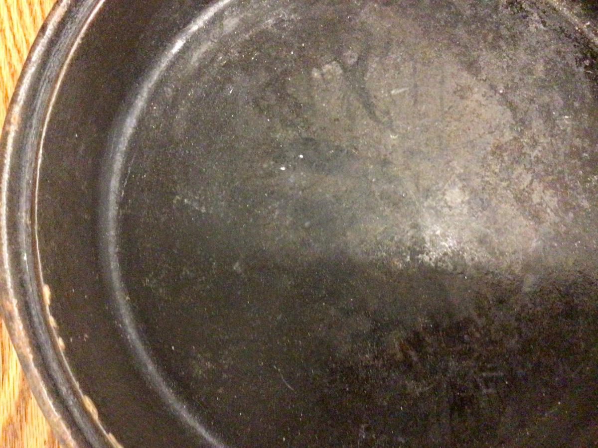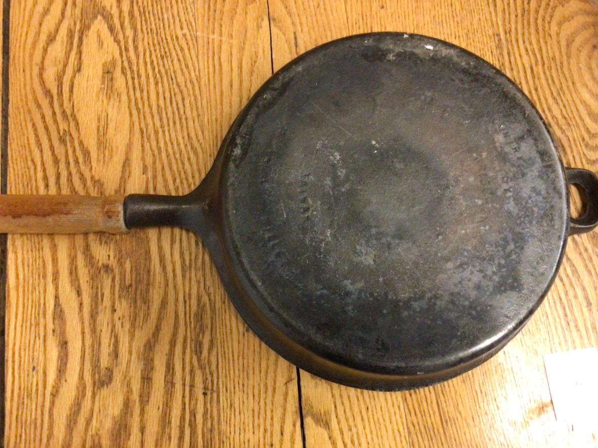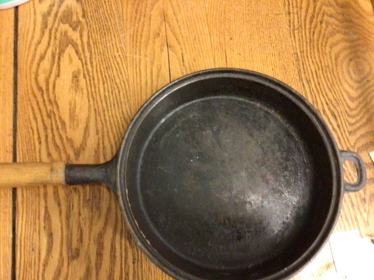 This is a great cast iron frying pan with wood handle. It was made in Tiawan, in good condition.