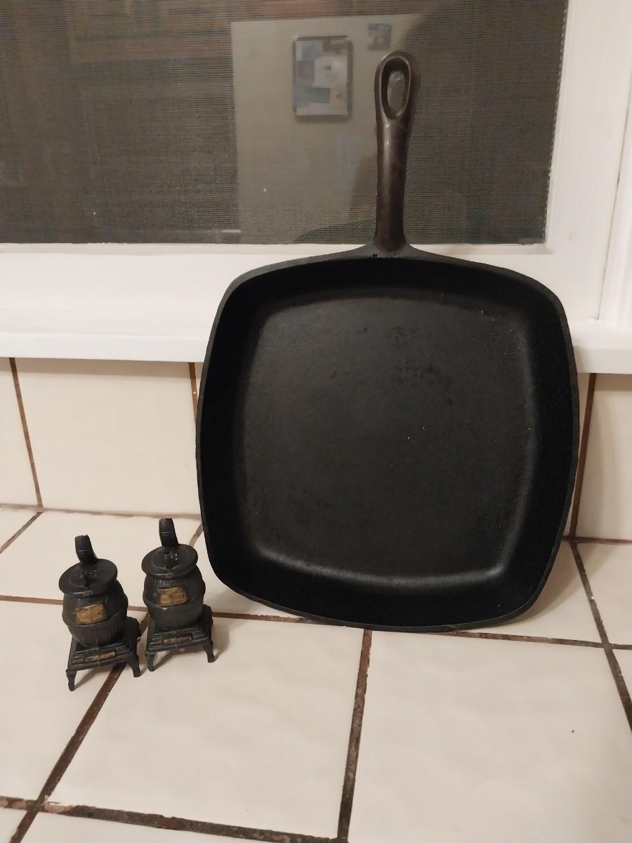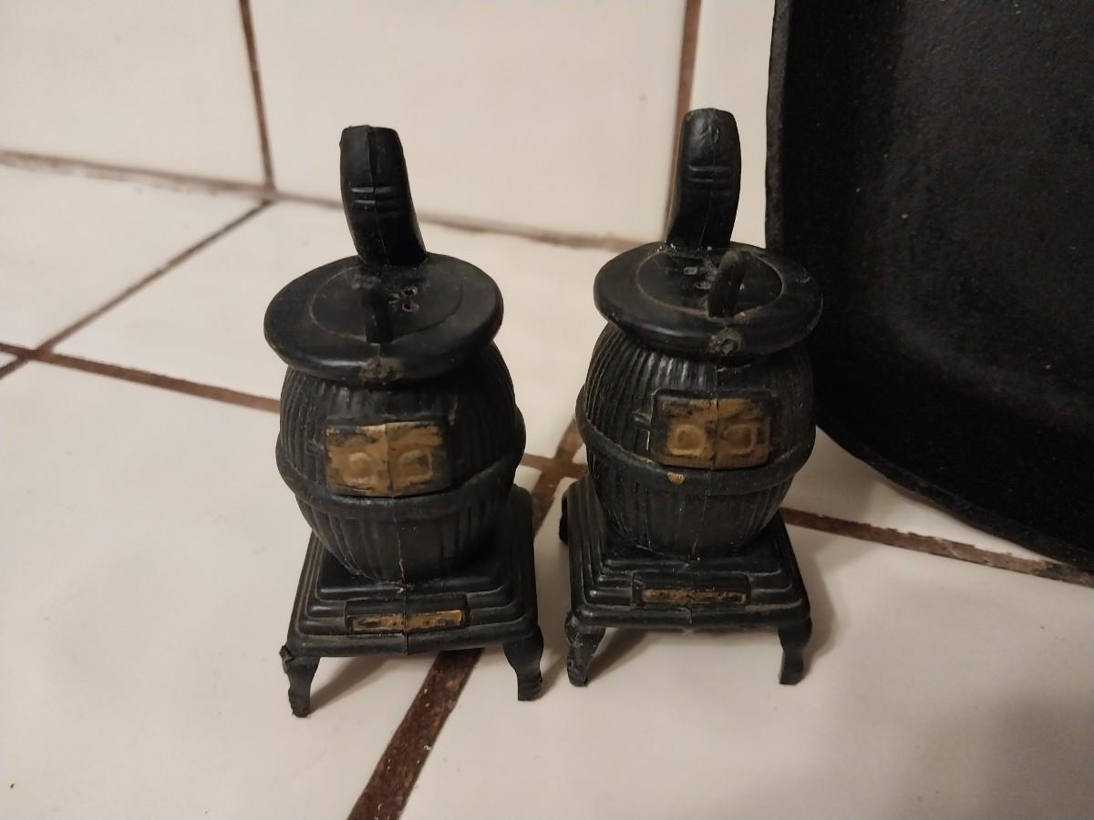 CAST IRON FRYING PAN AND VINTAGE SALT & PEPPER SHAKERS