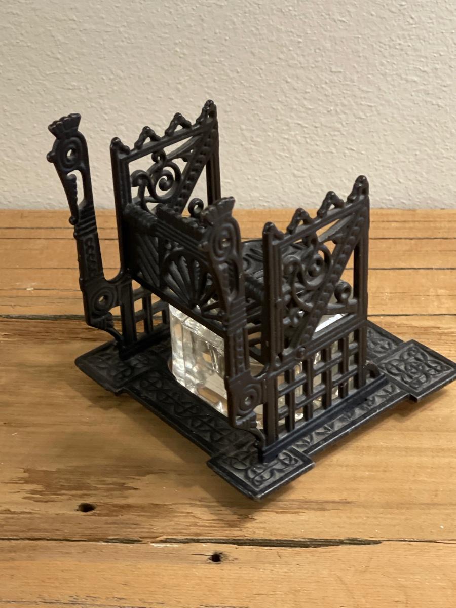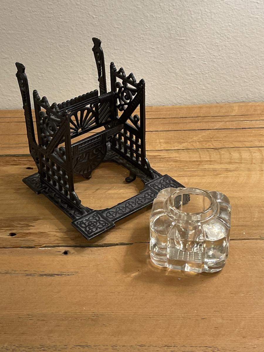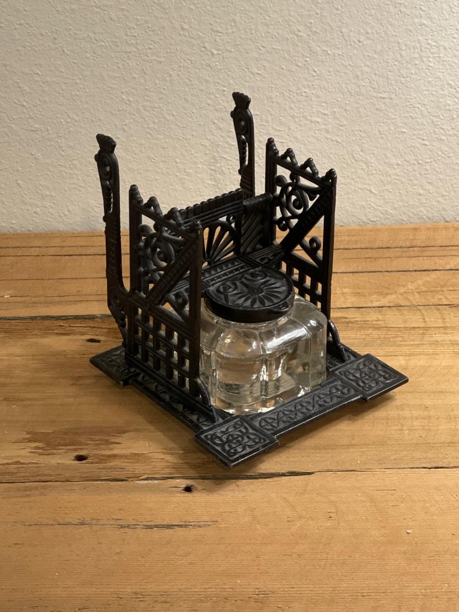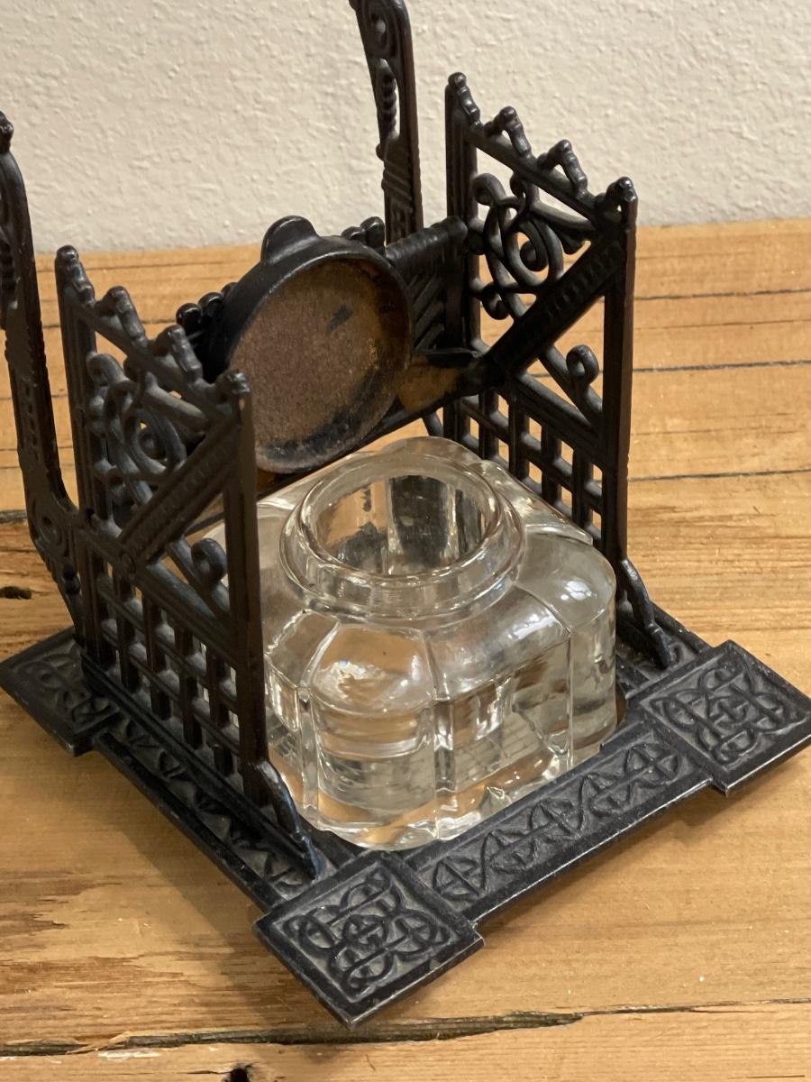 Cast Iron & Glass Inkwell Stand & Pen Holder