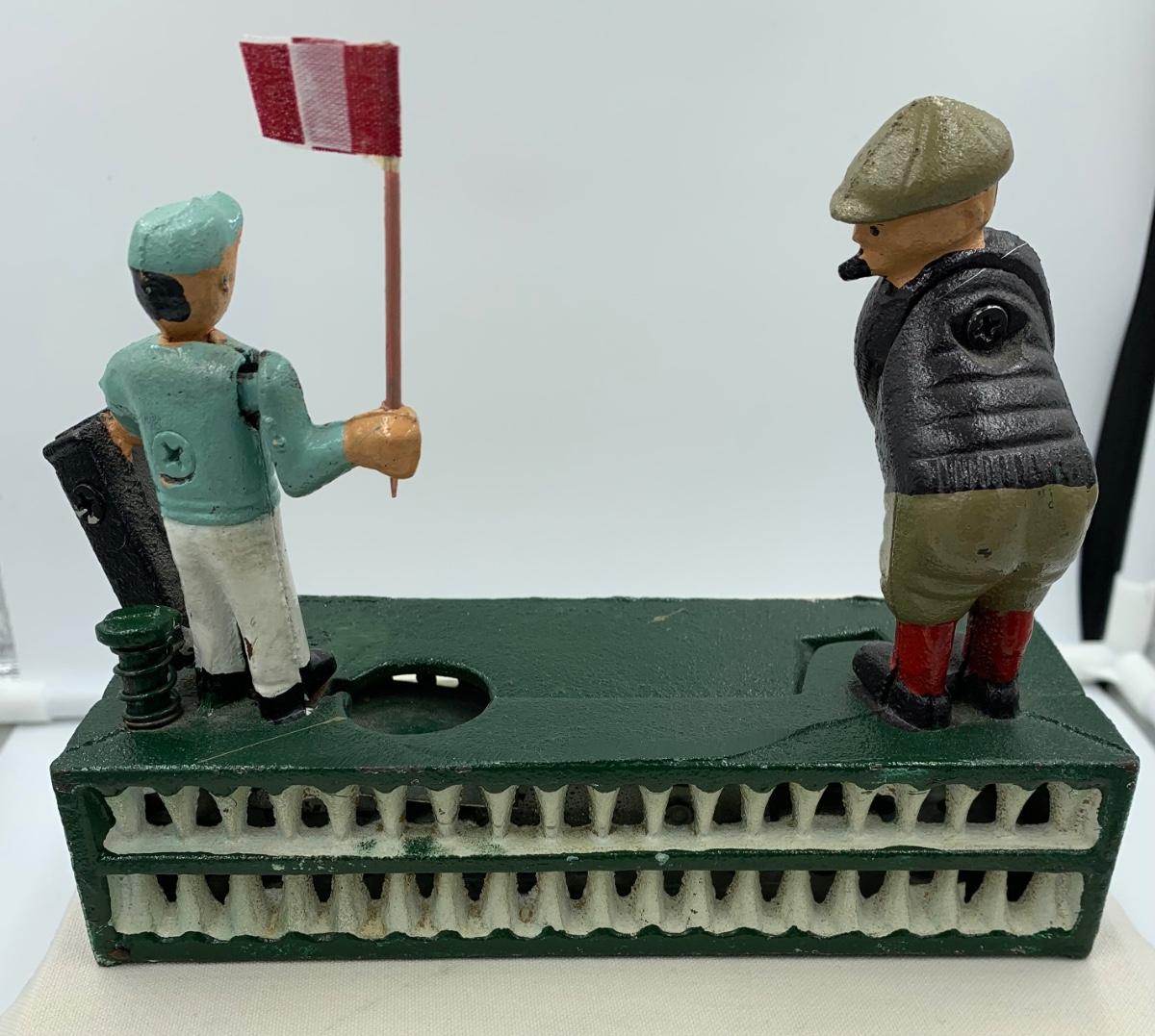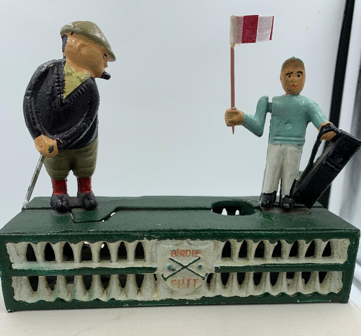 Fun antique piggy bank in cast iron. Measures 7” W x 6” tall. Great gift for collectors!