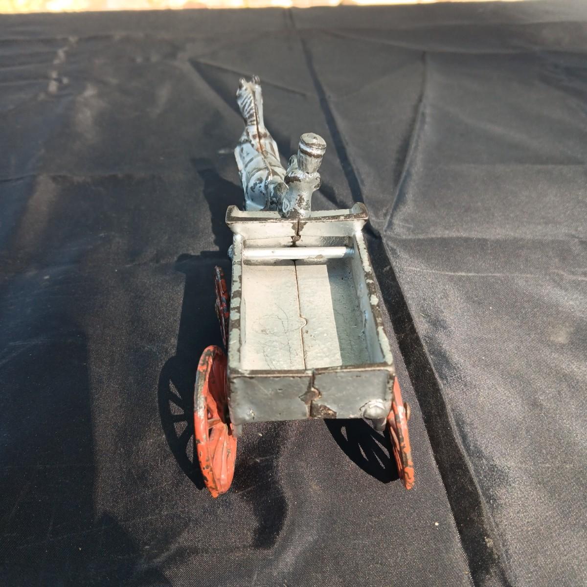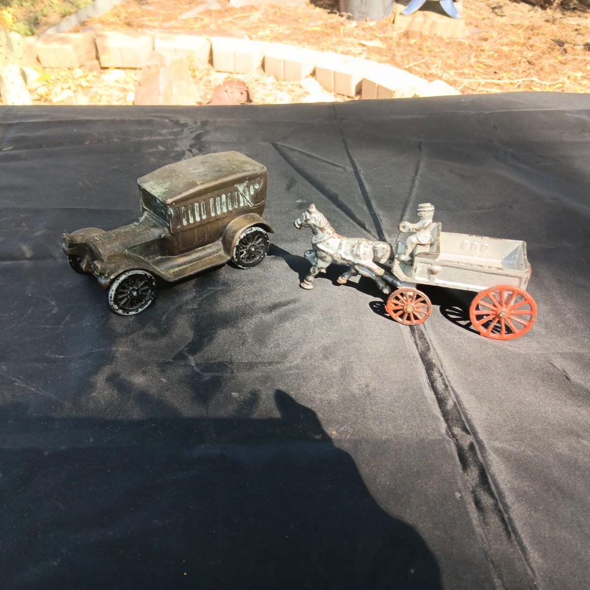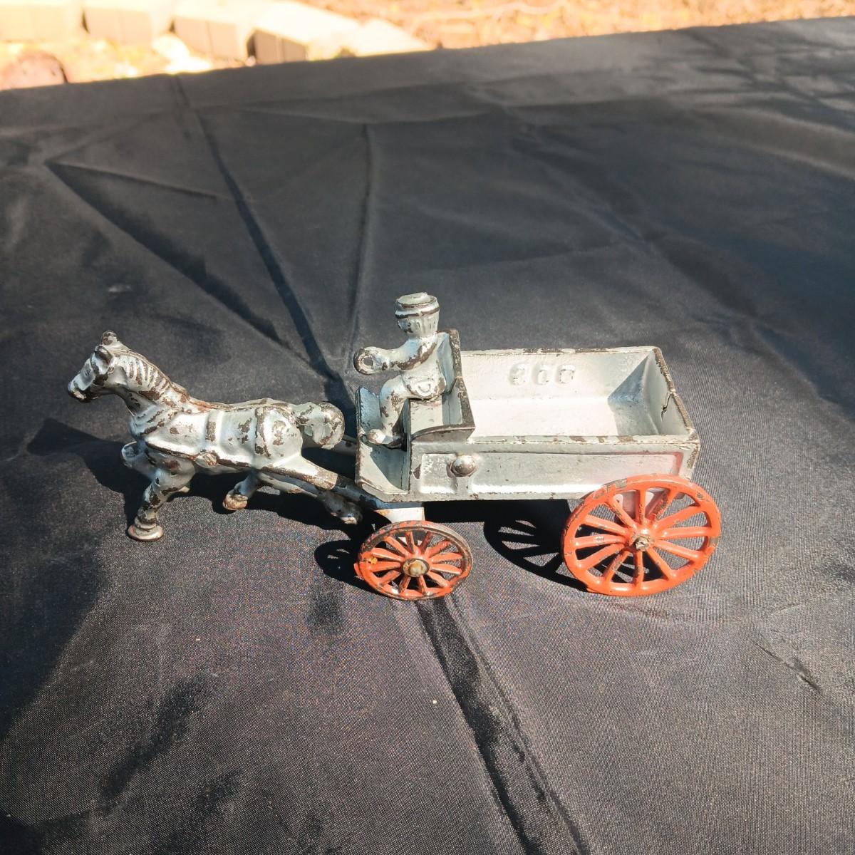 CAST IRON HORSE DRAWN WAGON AND AN OLD METAL COIN BANK (NO KEY)