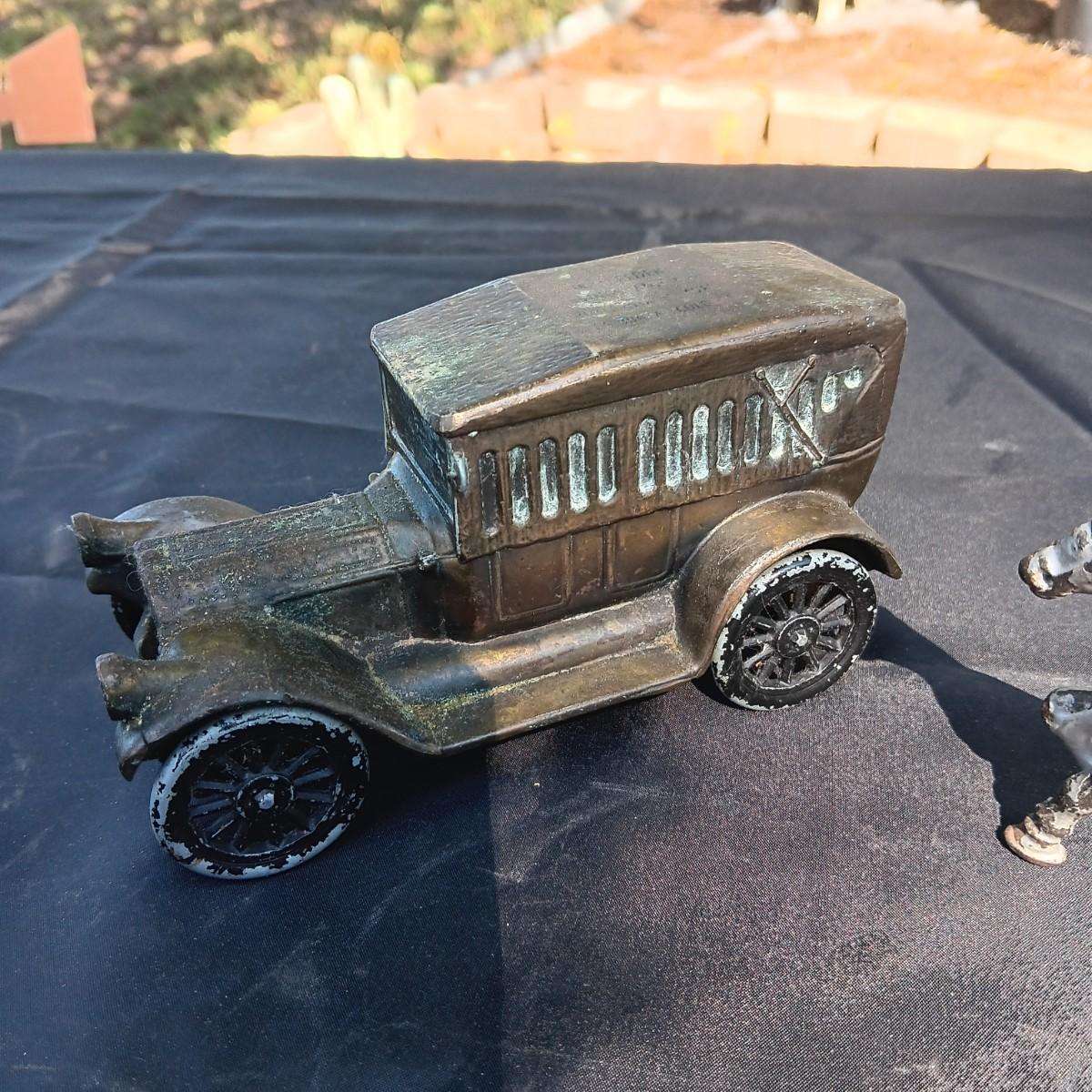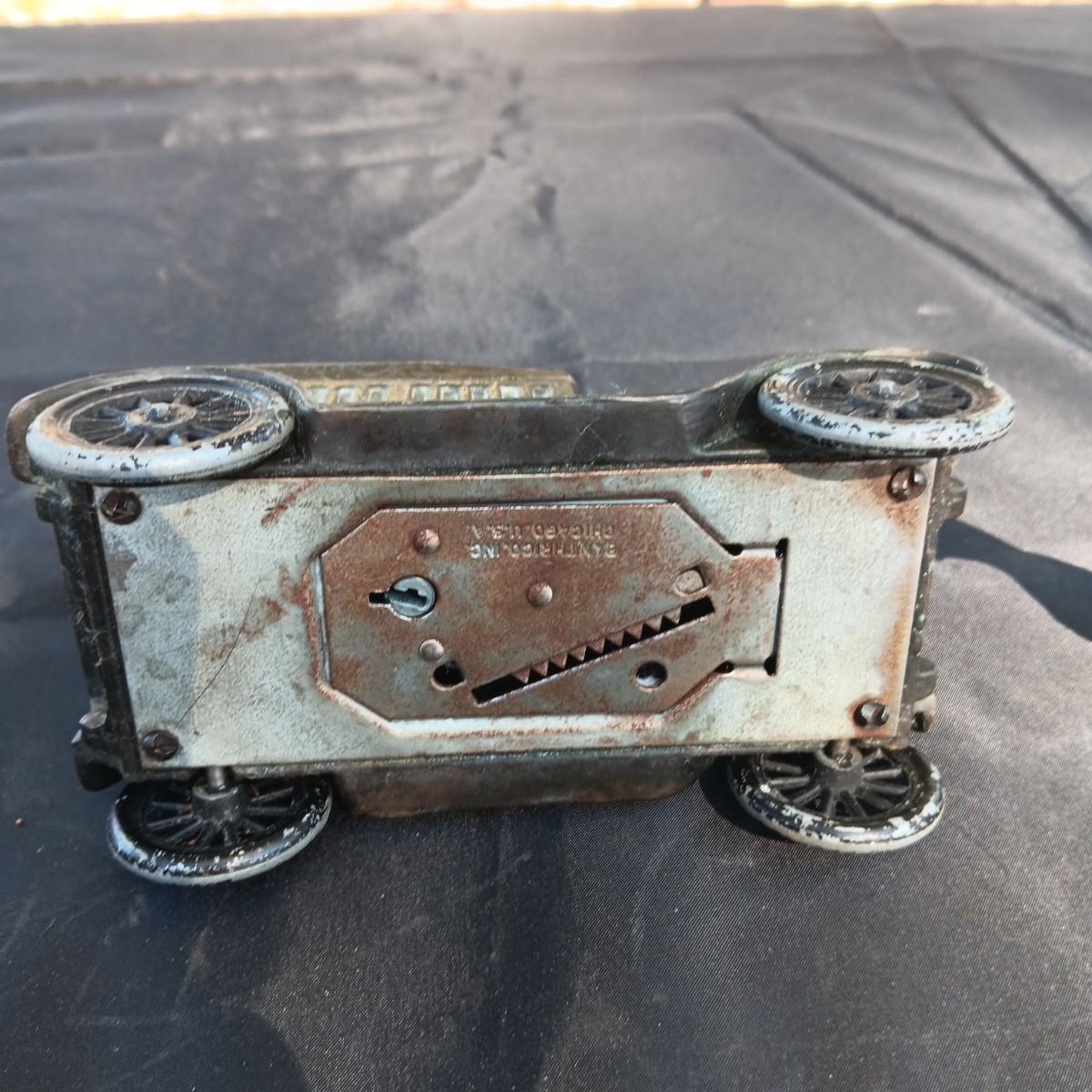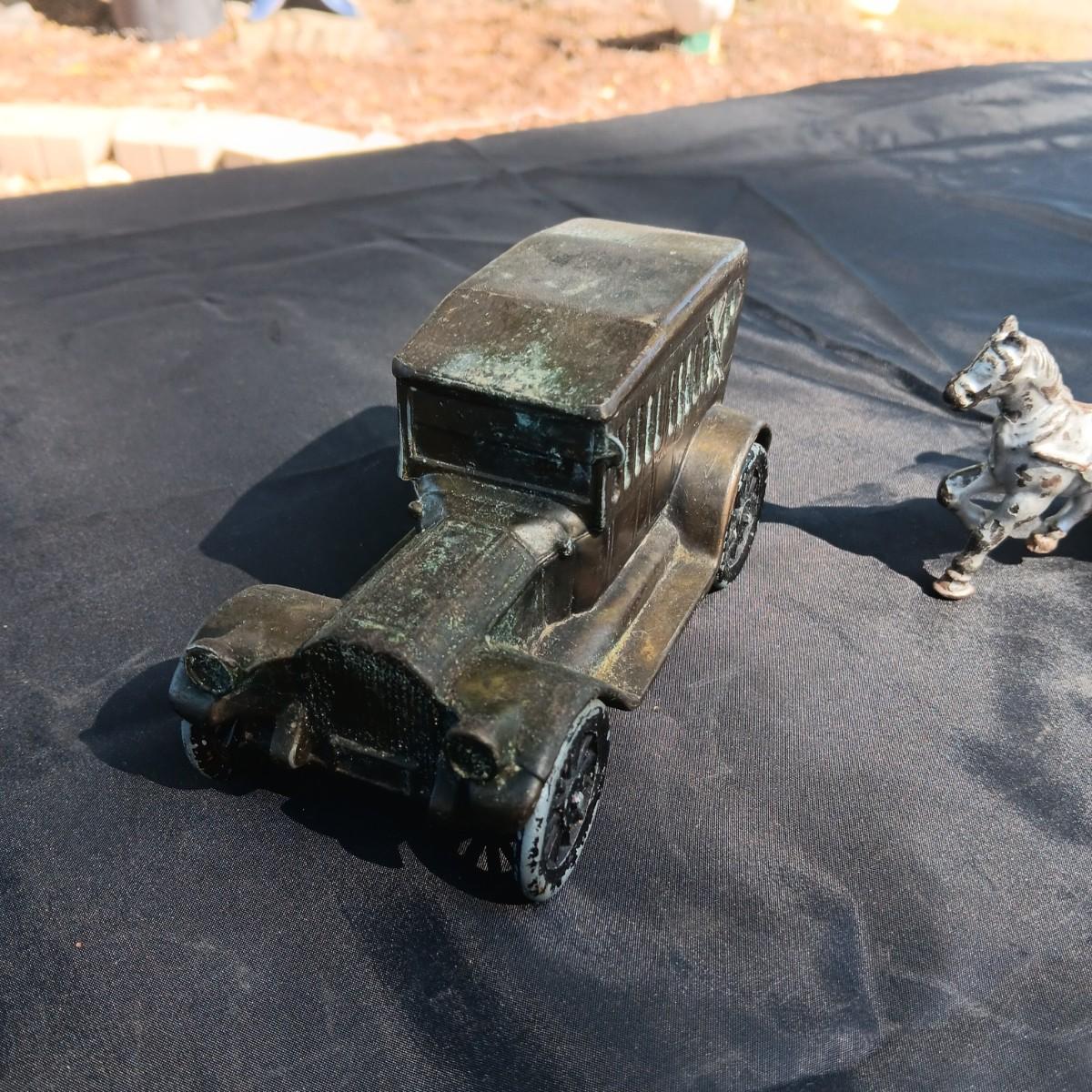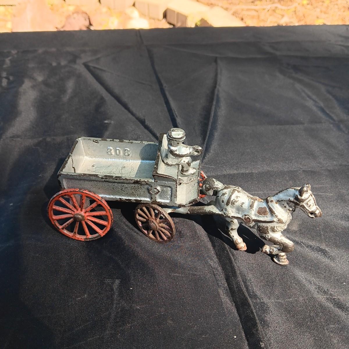 CAST IRON HORSE DRAWN WAGON AND AN OLD METAL COIN BANK (NO KEY)