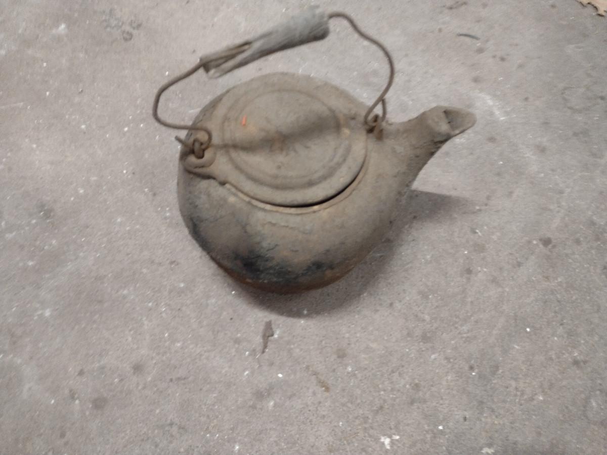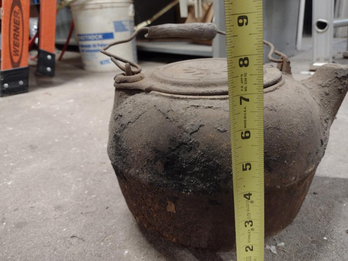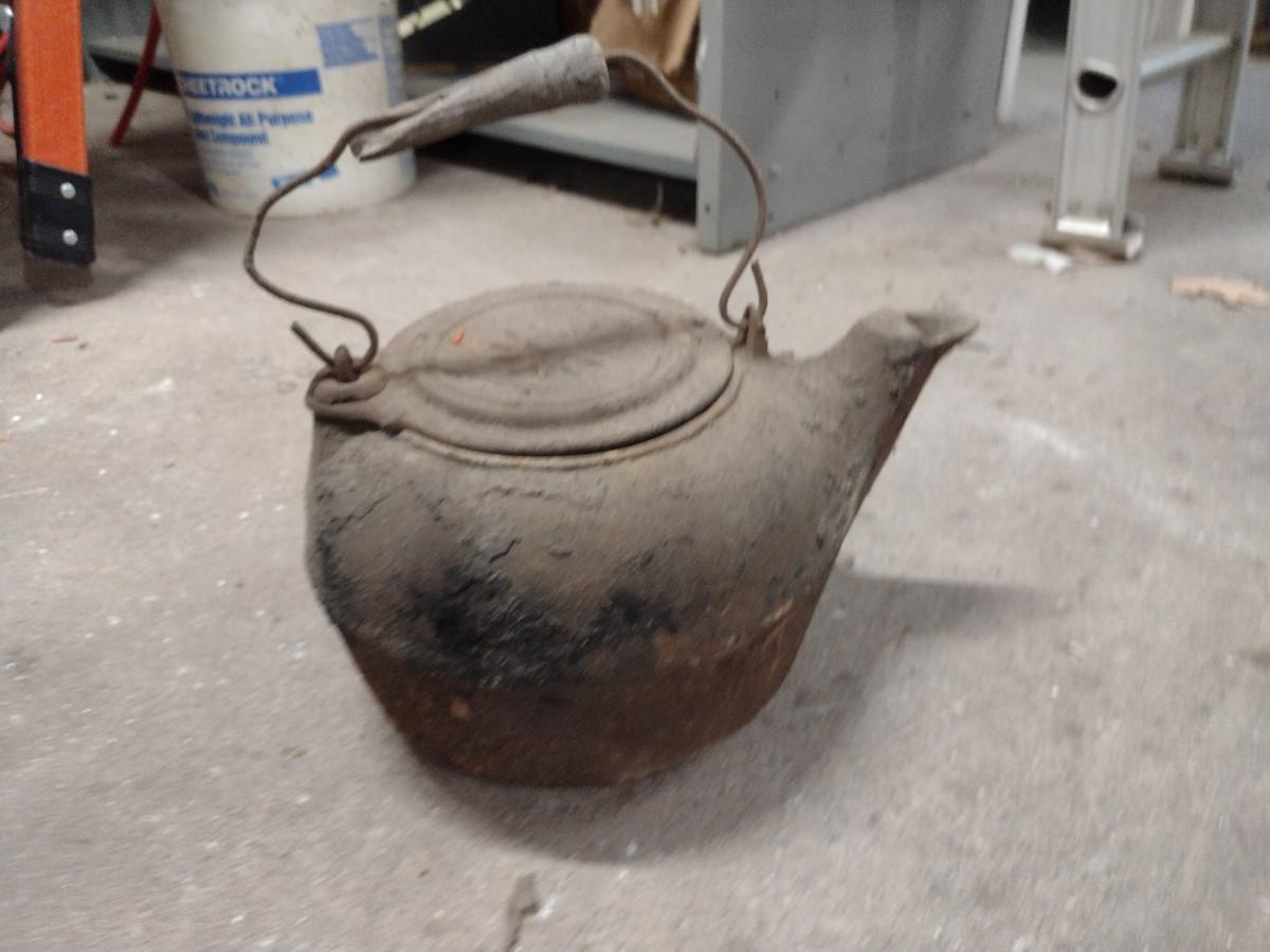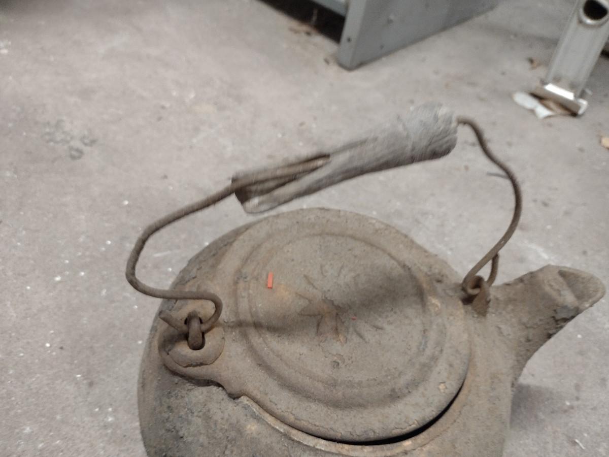 Cast Iron Kettle Humidifier. Item has rust and damage to handle- please see all pictures.