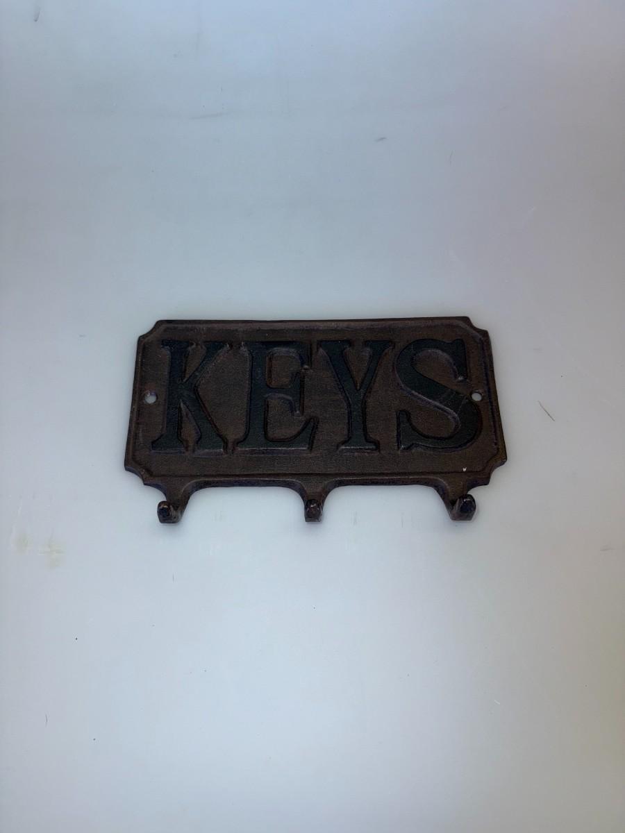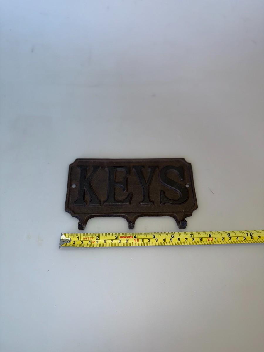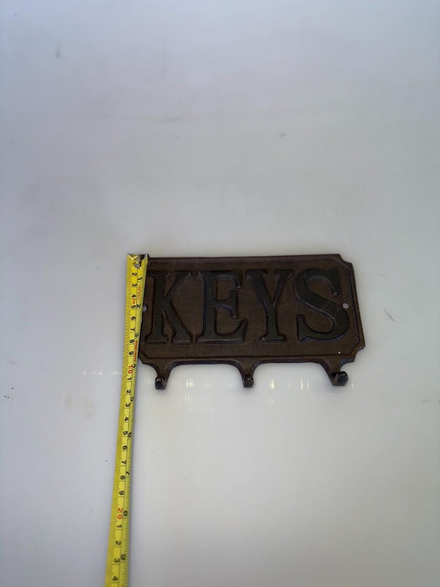 Heavy-duty three-hook key holder with rustic finish. Wall mountable.