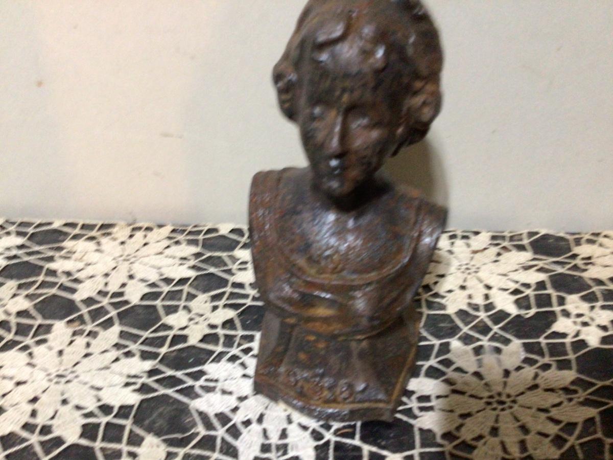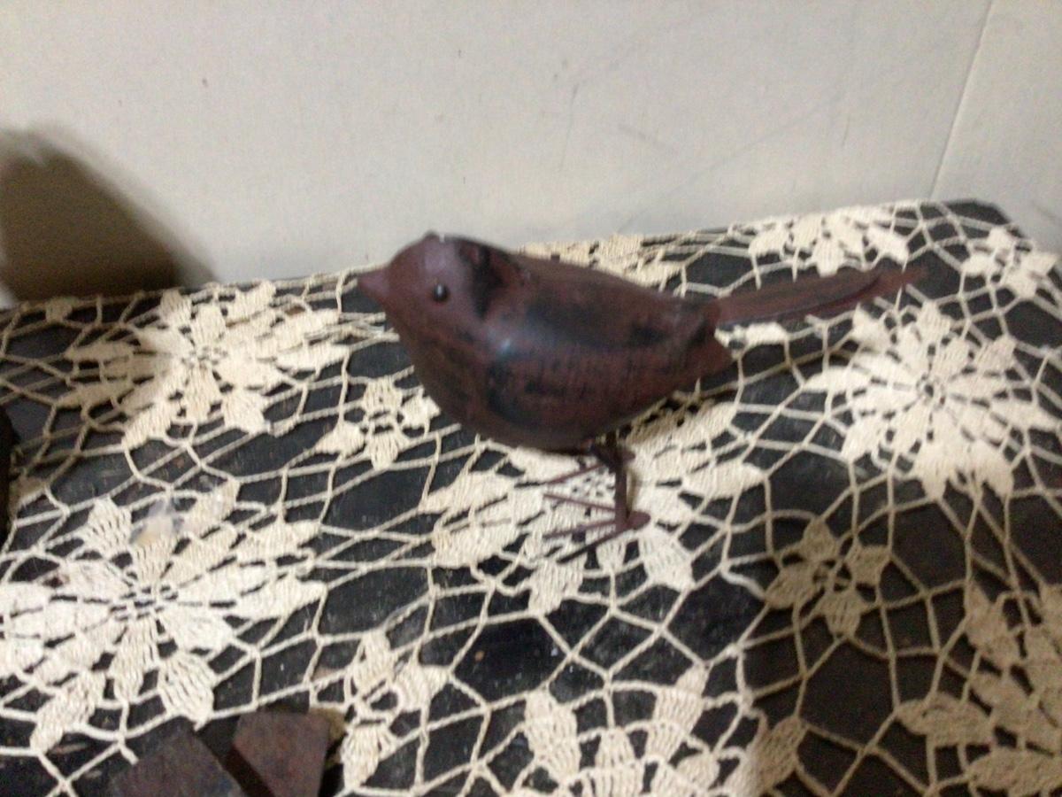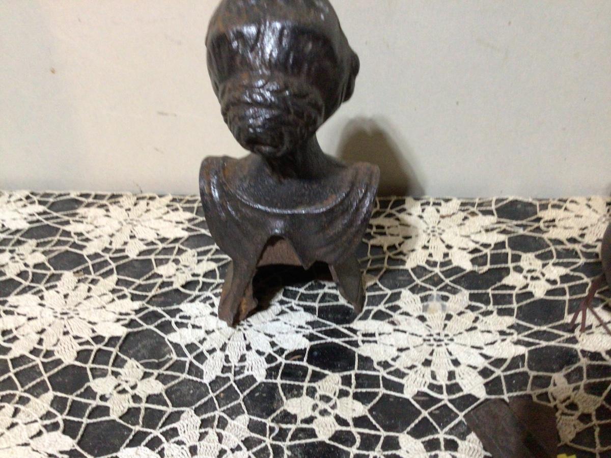 This is a great lot of metal items. You get a great lady cast iron door stop that is damaged. You also get a nice metal bird figurine and a set of two oxen hoof shoes.