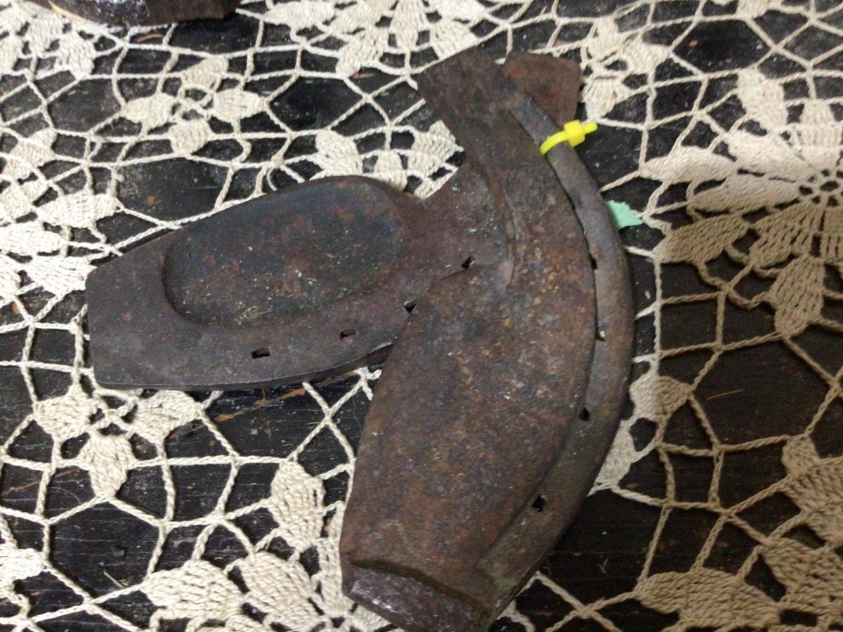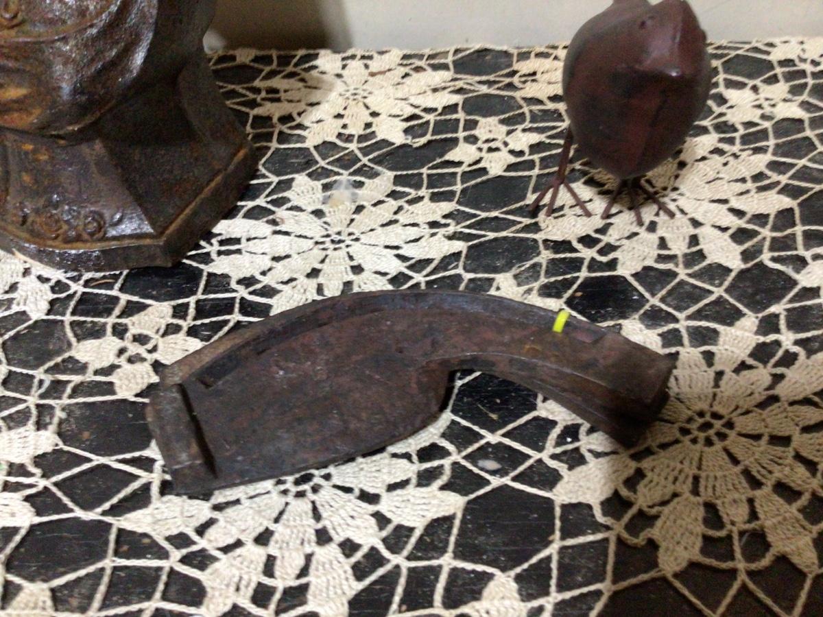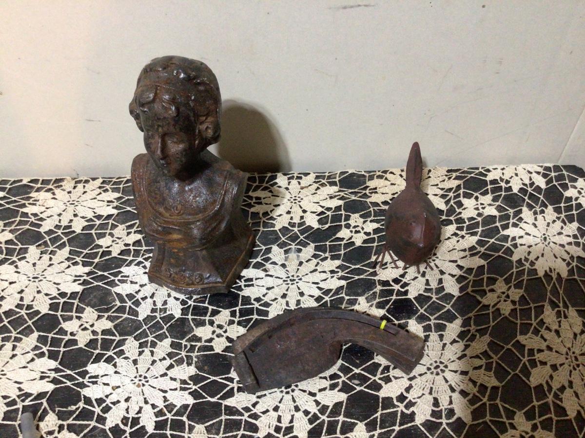Cast Iron Lady Door Stop, Metal Bird, and Oxen Hoof Shoes.