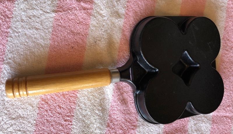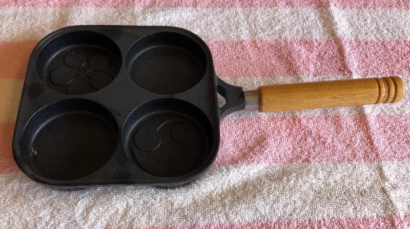 Cast Iron pan. Has 4 circle openings. For eggs or biscuits. Have different designs in the bottom. Good condition.