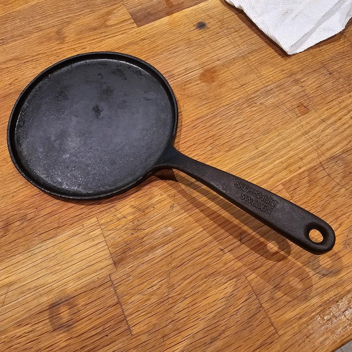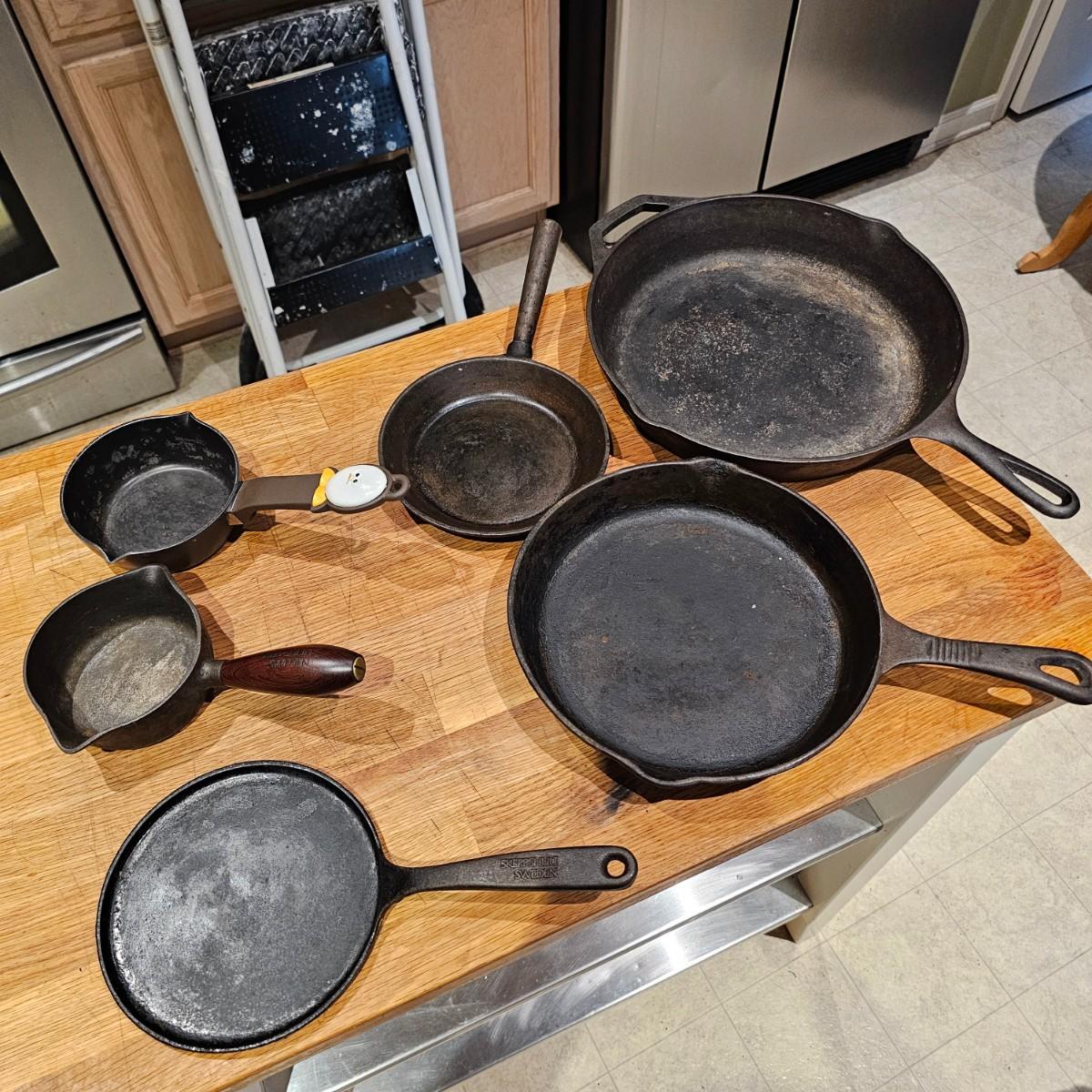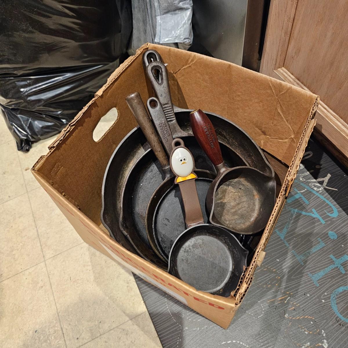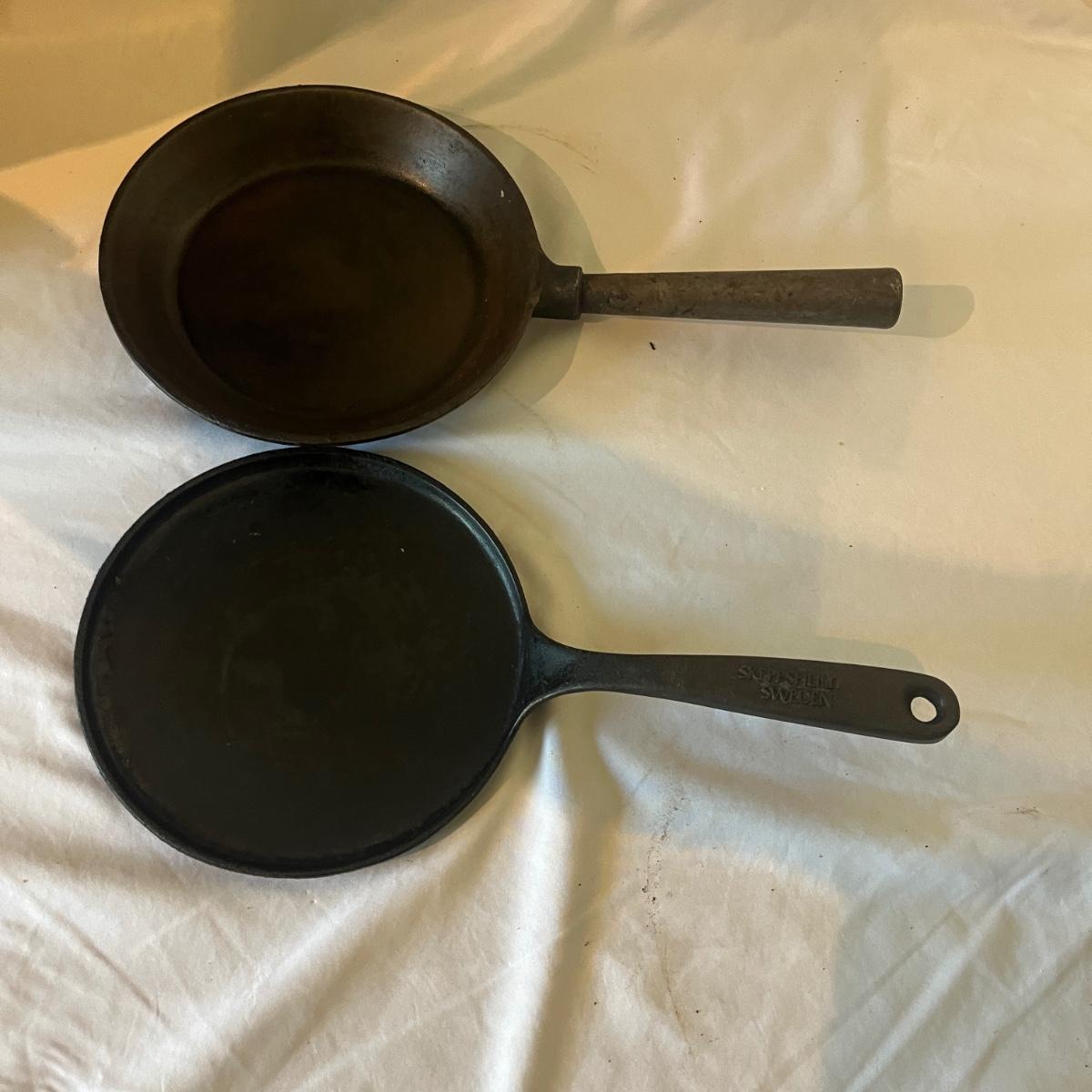 Cast iron skillets and small cook pans. One large Lodge 12" D fry pan. One medium 10"D pan. Smallest fry pan is 7"D, and flat griddle is 6.5"D. Two of the pans are made by Skeppshult. Many items are from Sweden and are stamped as such. See photos for details. Local pickup only.