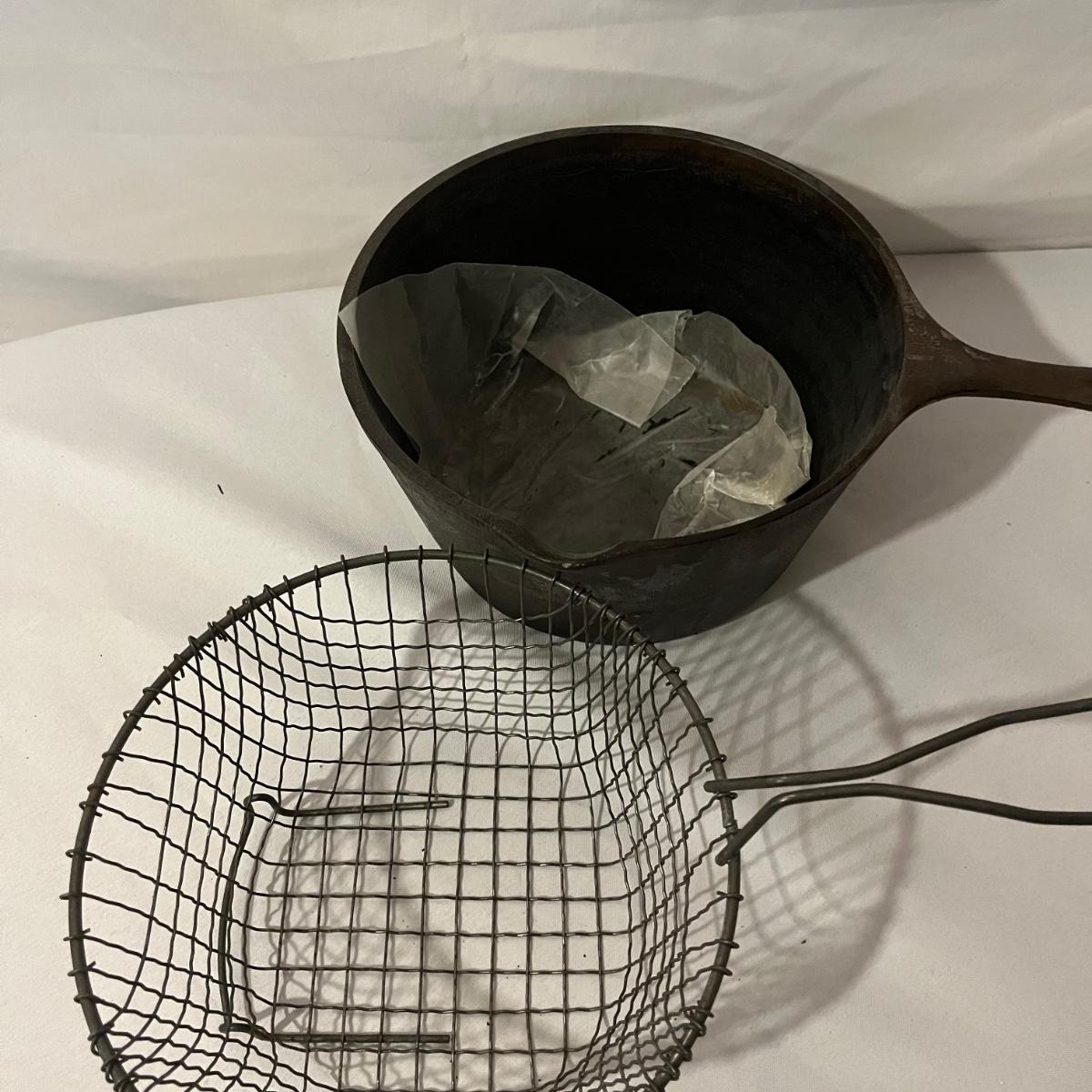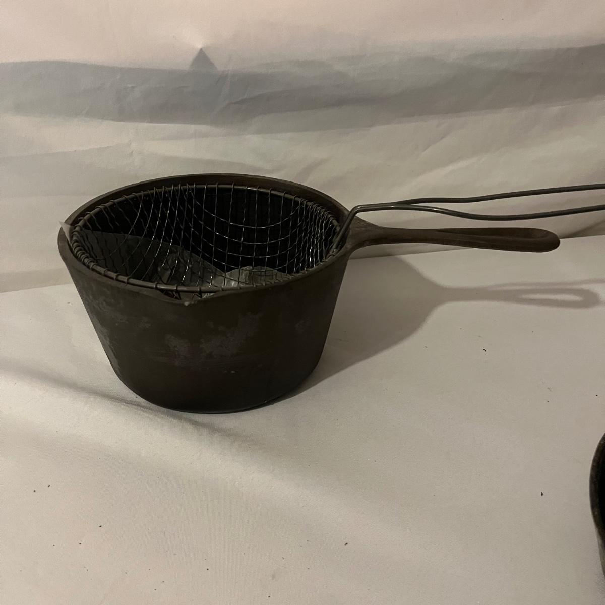 Lot includes a Wagner’s 8” pan, two #3 pans, two # 6 pans and two #8 pans, pot with basket, flat pan and a 10.5” pan. All are in good condition.