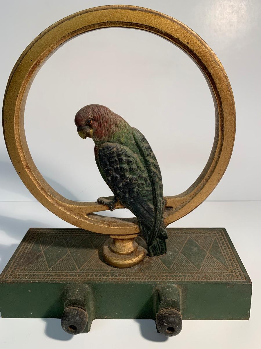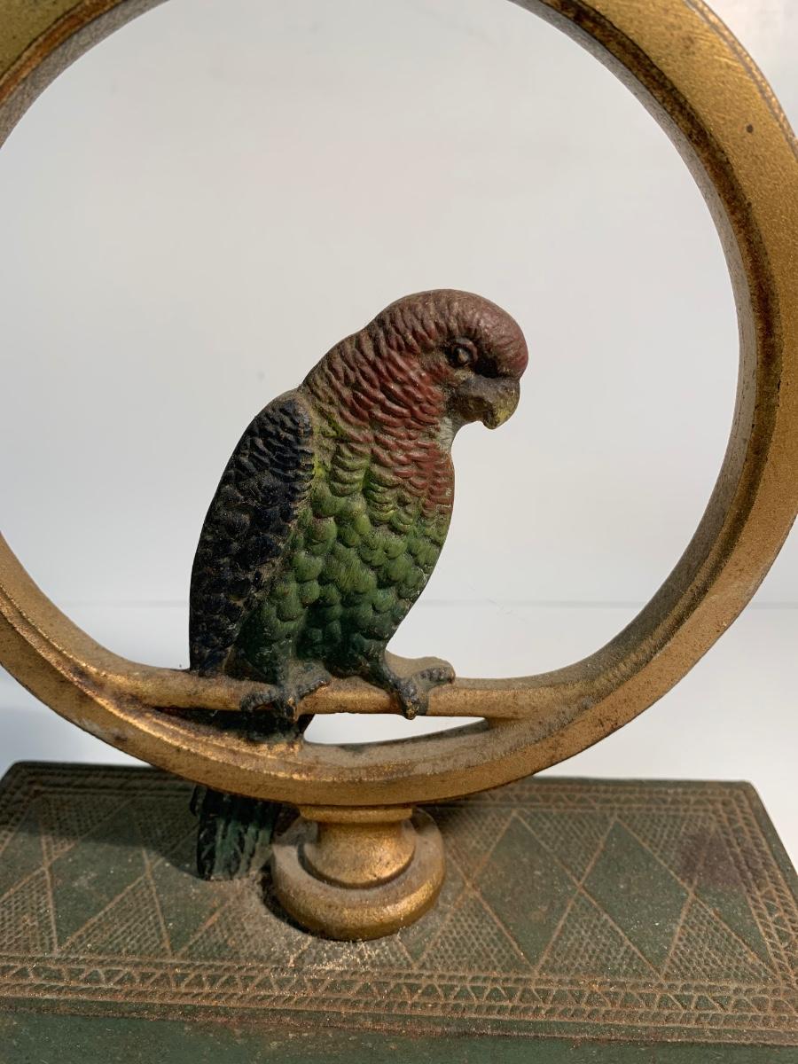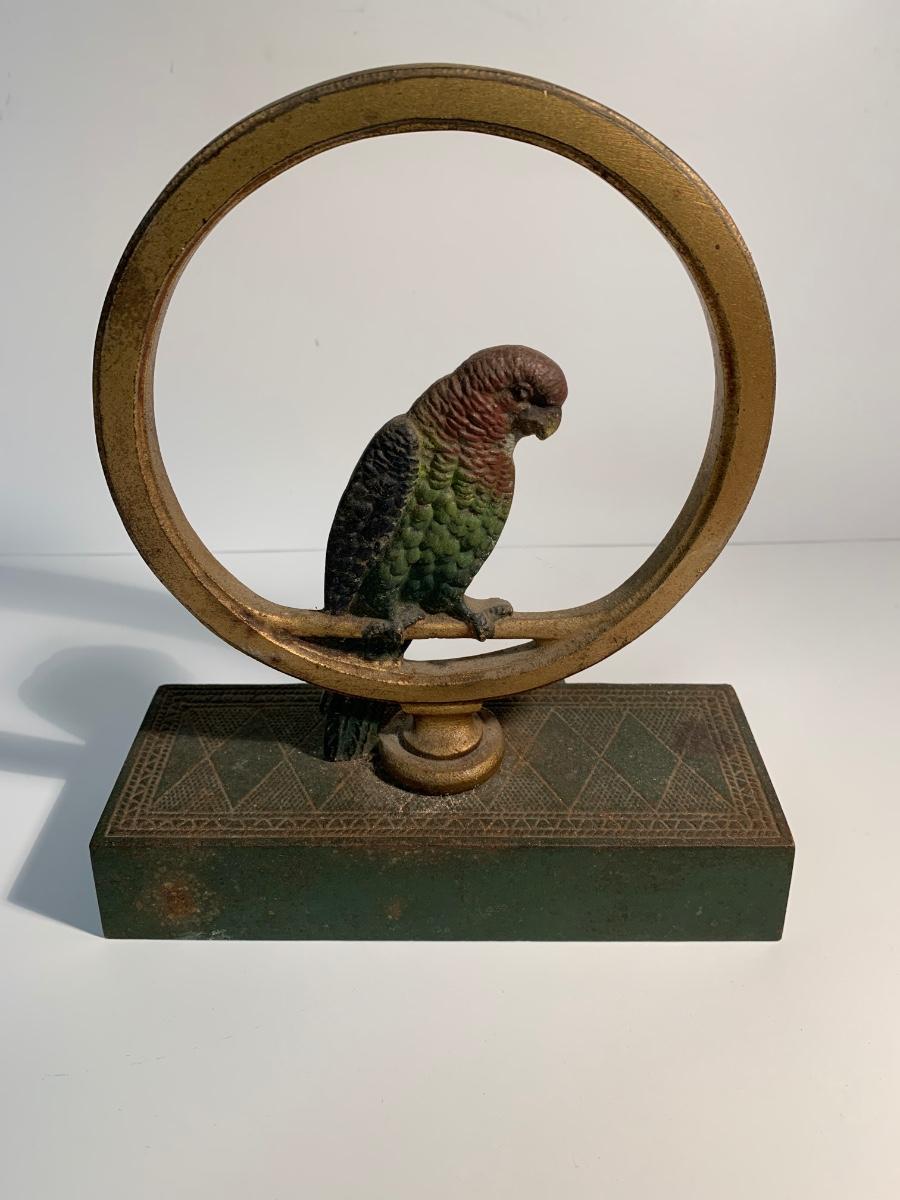 Cast iron antique parrot on his perch, great quality casting and the color under the dust looks good