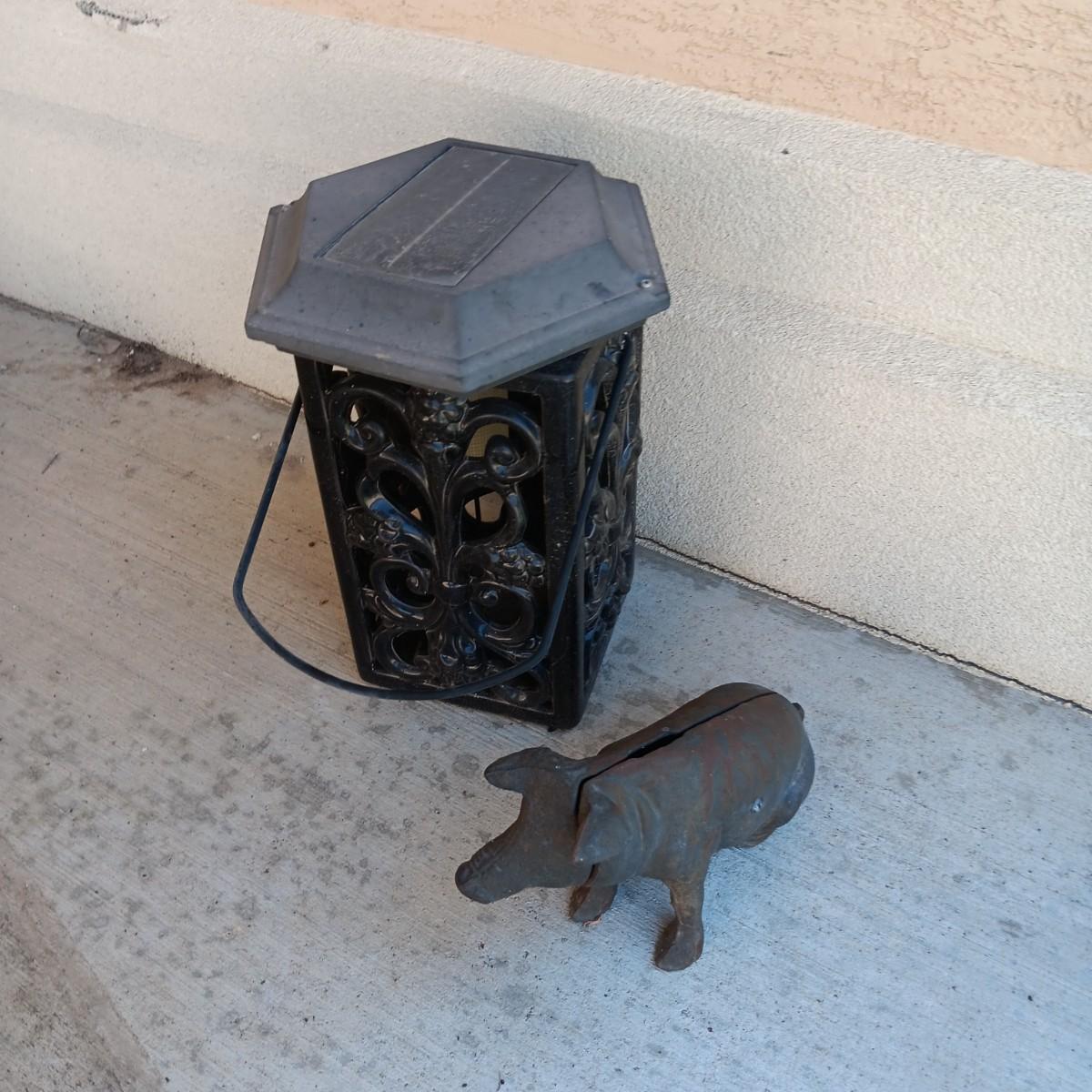 CAST IRON PIG BANK AND METAL CANDLE LANTERN
