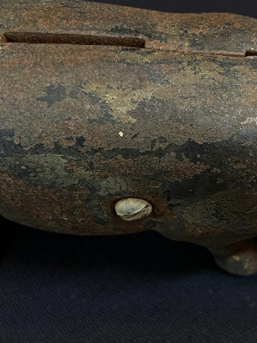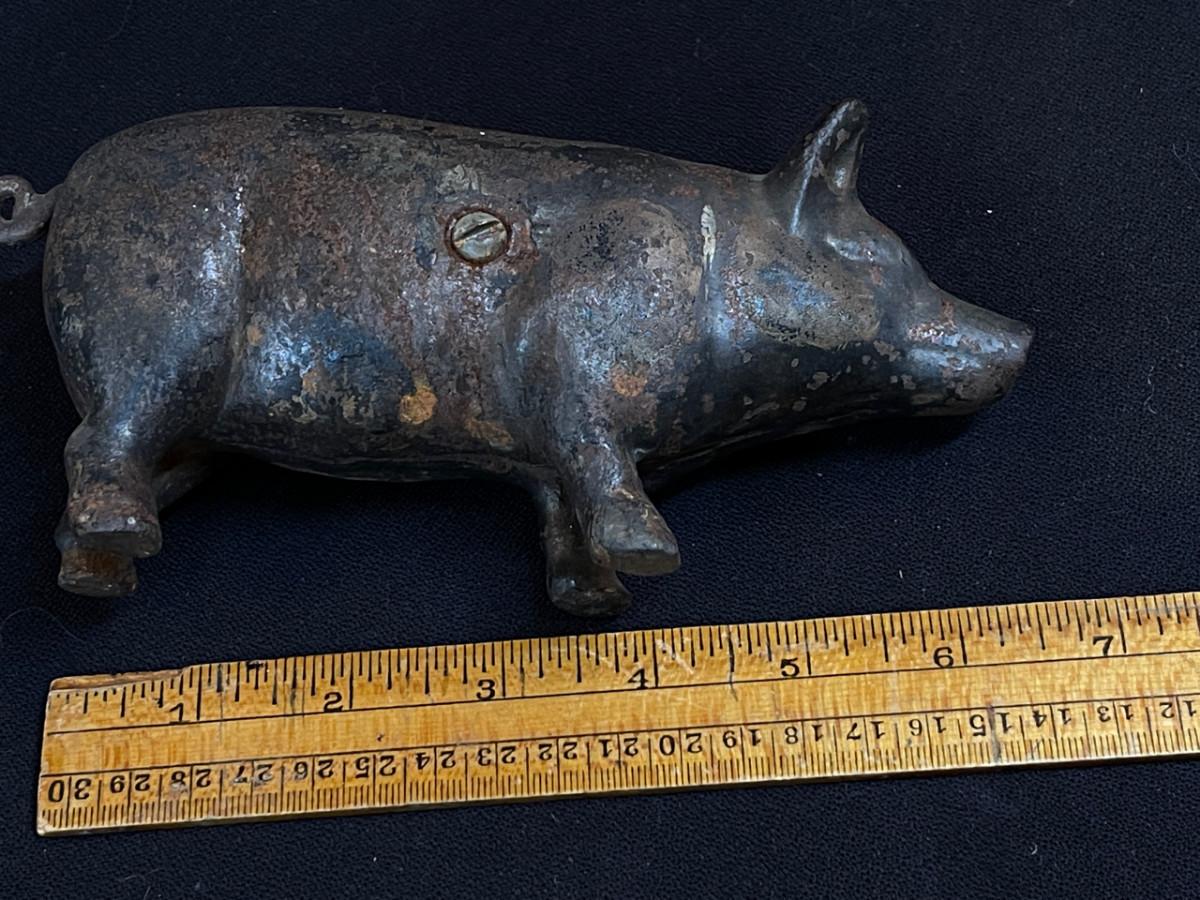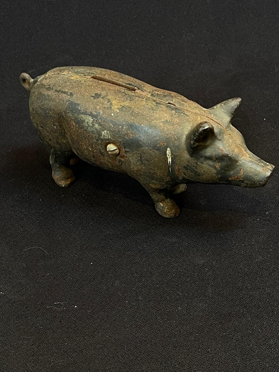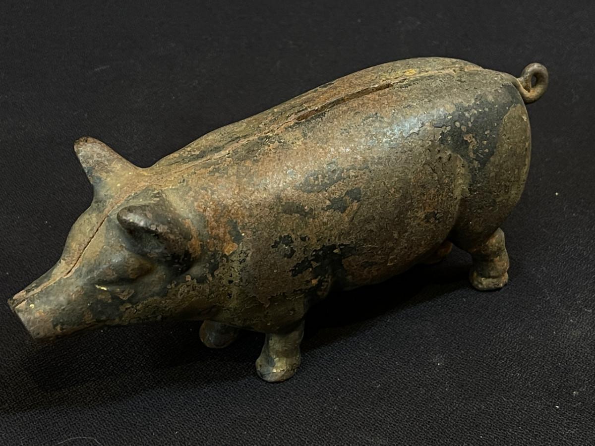 The subject item is a small, cast iron piggy bank, faithfully rendering the pig in anatomical detail, including the curly tail. The coin slot follows the spine at the center of its back. There is some remnant of black paint and rusting patina to the surface
