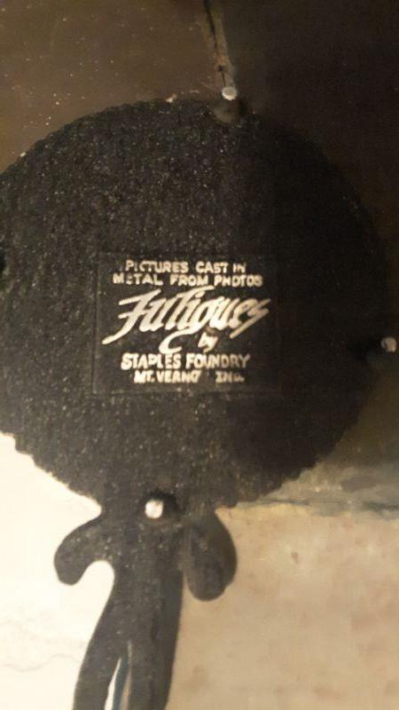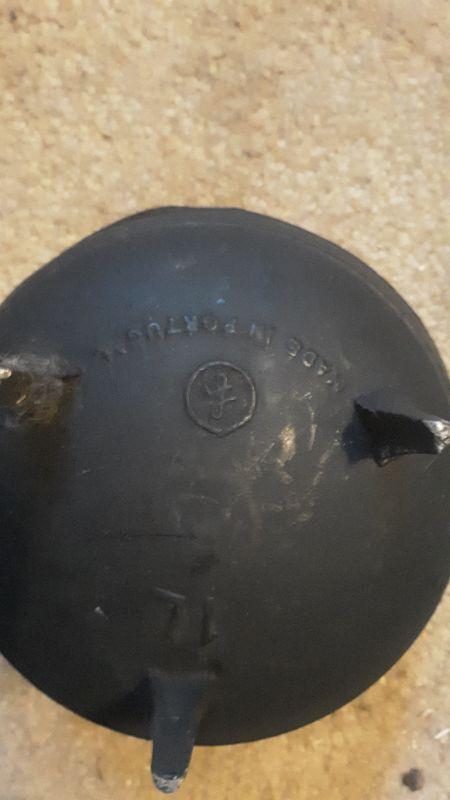 FUTIGUES BY STAPLES FOUNDRY FORT WAYNE INDIANA CAST IRON ADVERTISING, SMALL CAST IRON POT WITH HANDLE, MADE IN PORTUGAL STAMPED ON OTHER POT