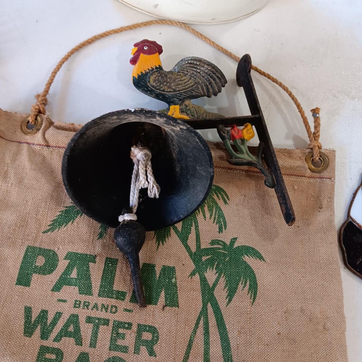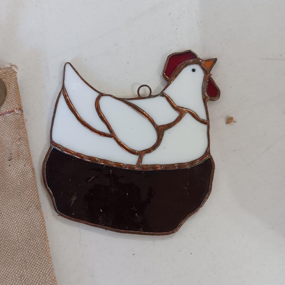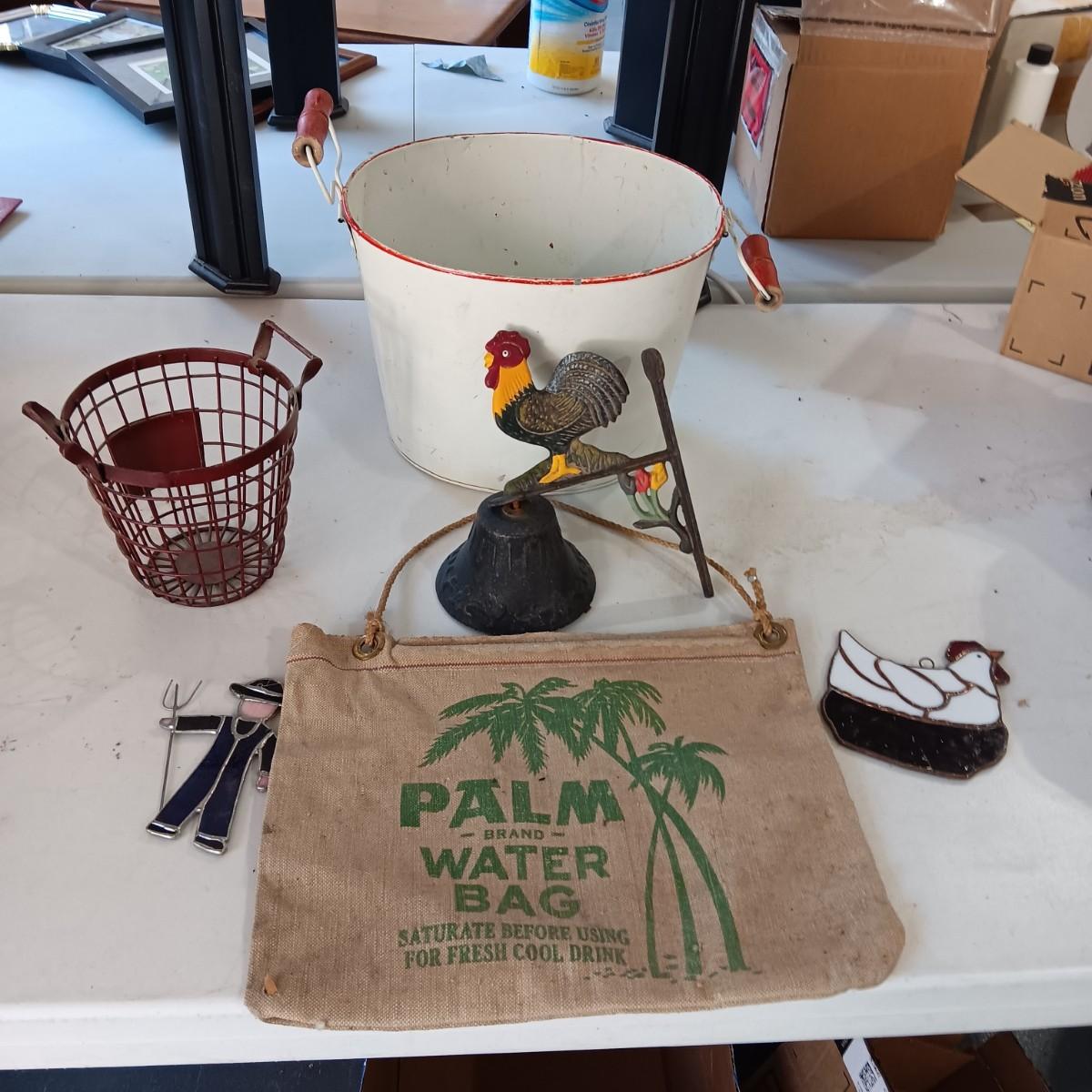 CAST IRON ROOSTER BELL, WATER BAG, 2 STAINED GLASS AND MORE