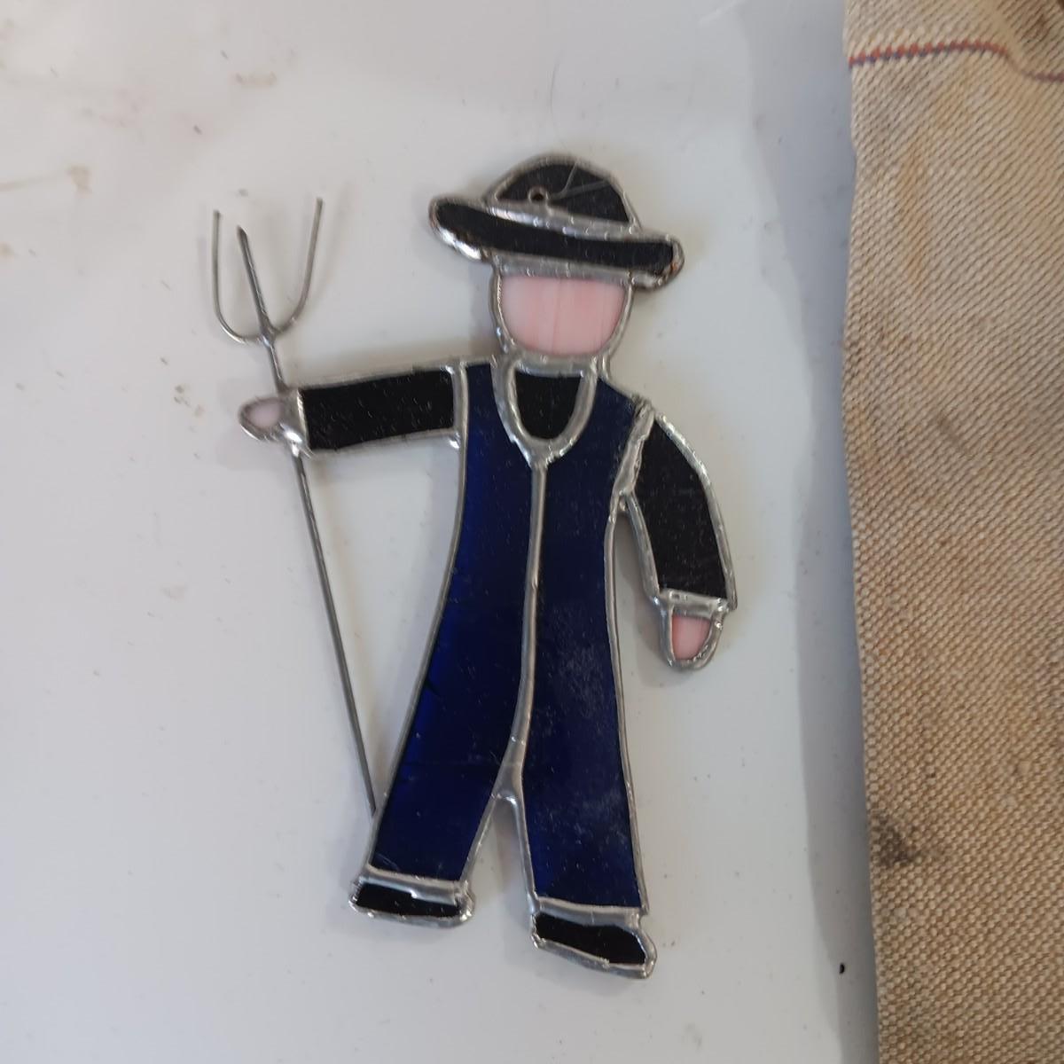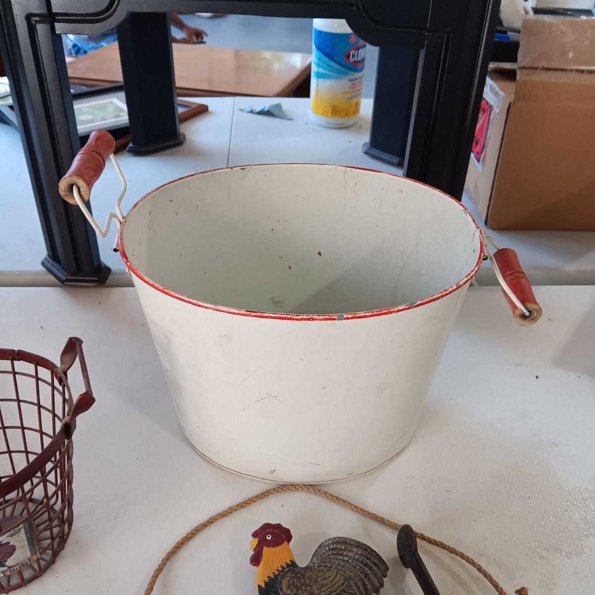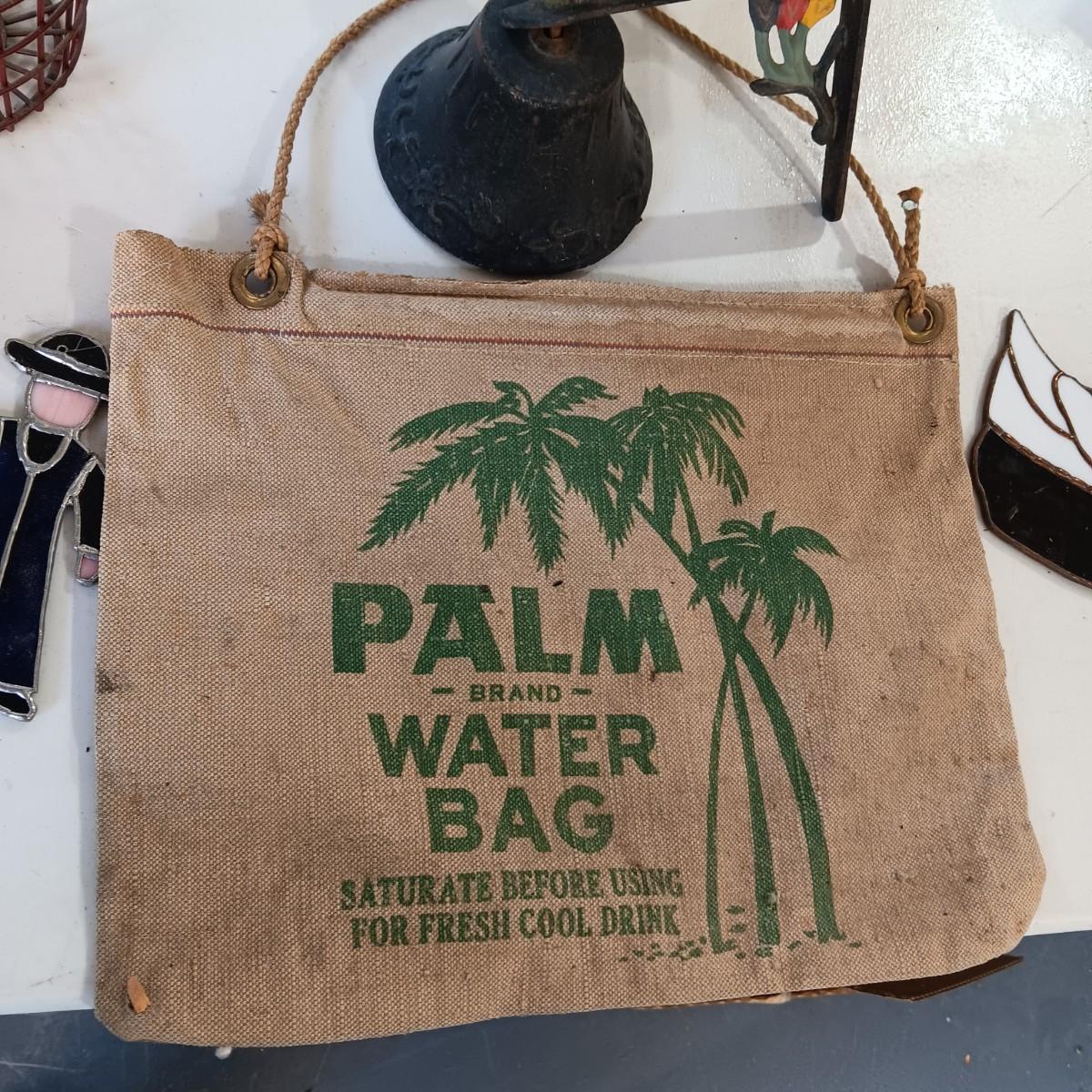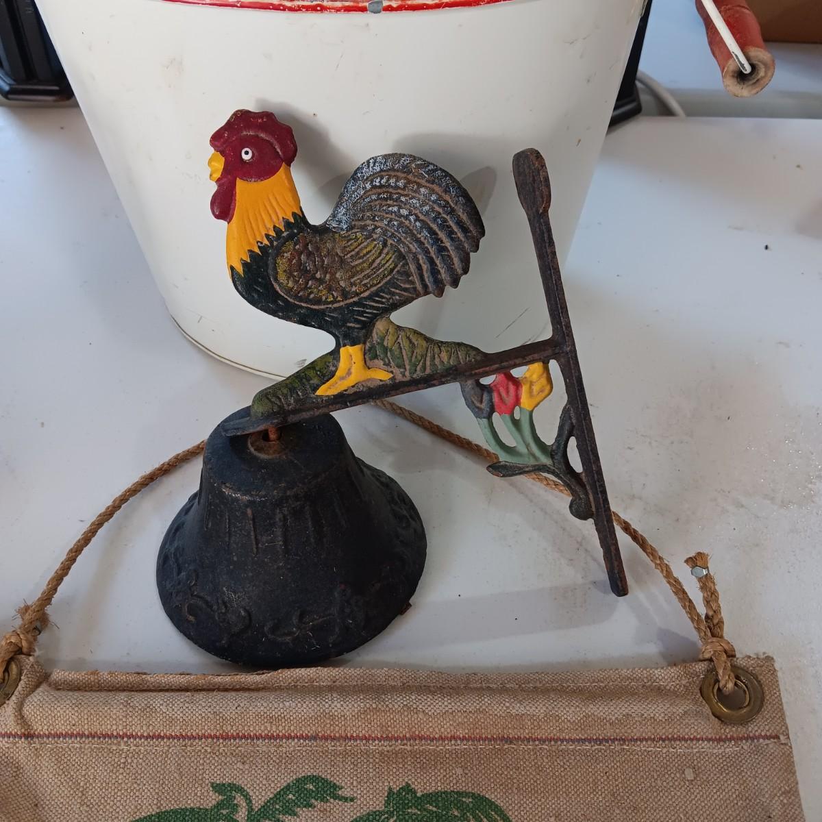 CAST IRON ROOSTER BELL, WATER BAG, 2 STAINED GLASS AND MORE