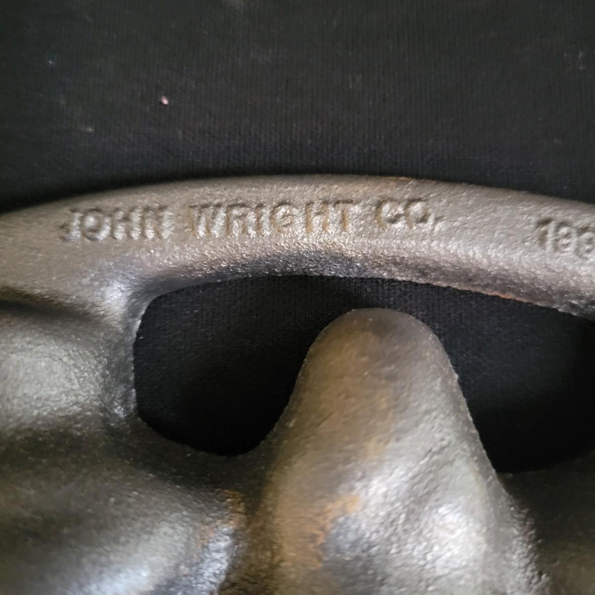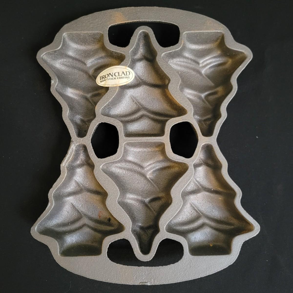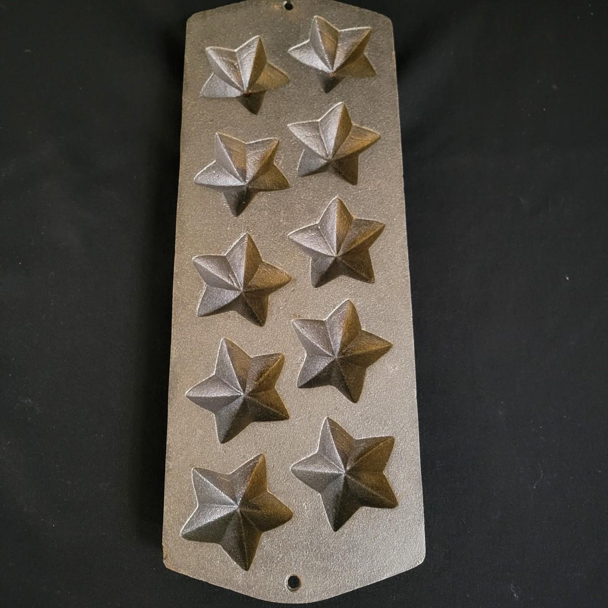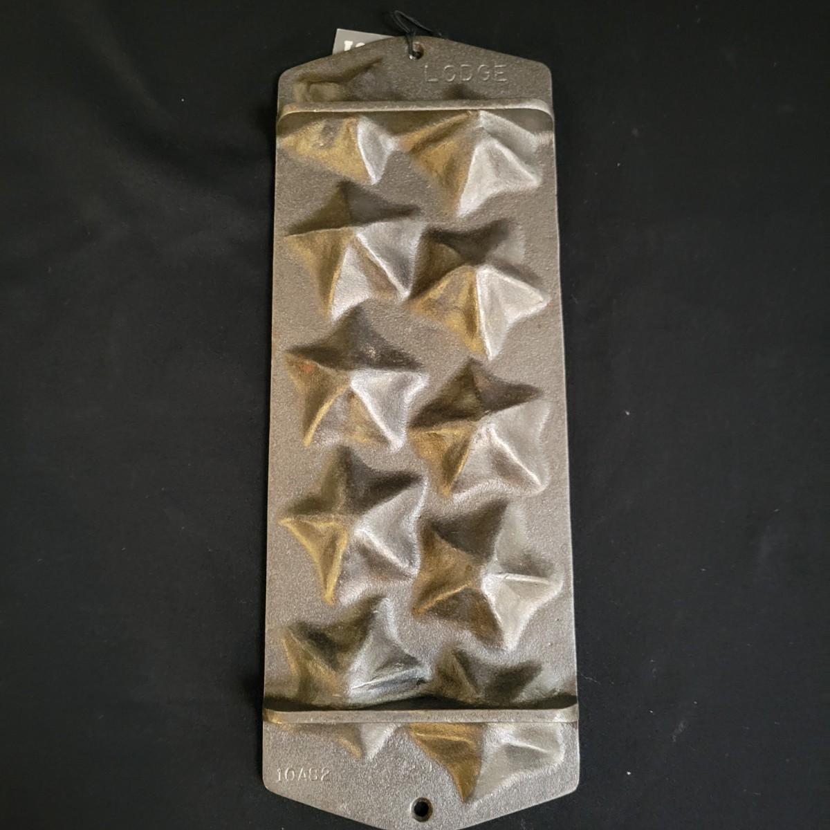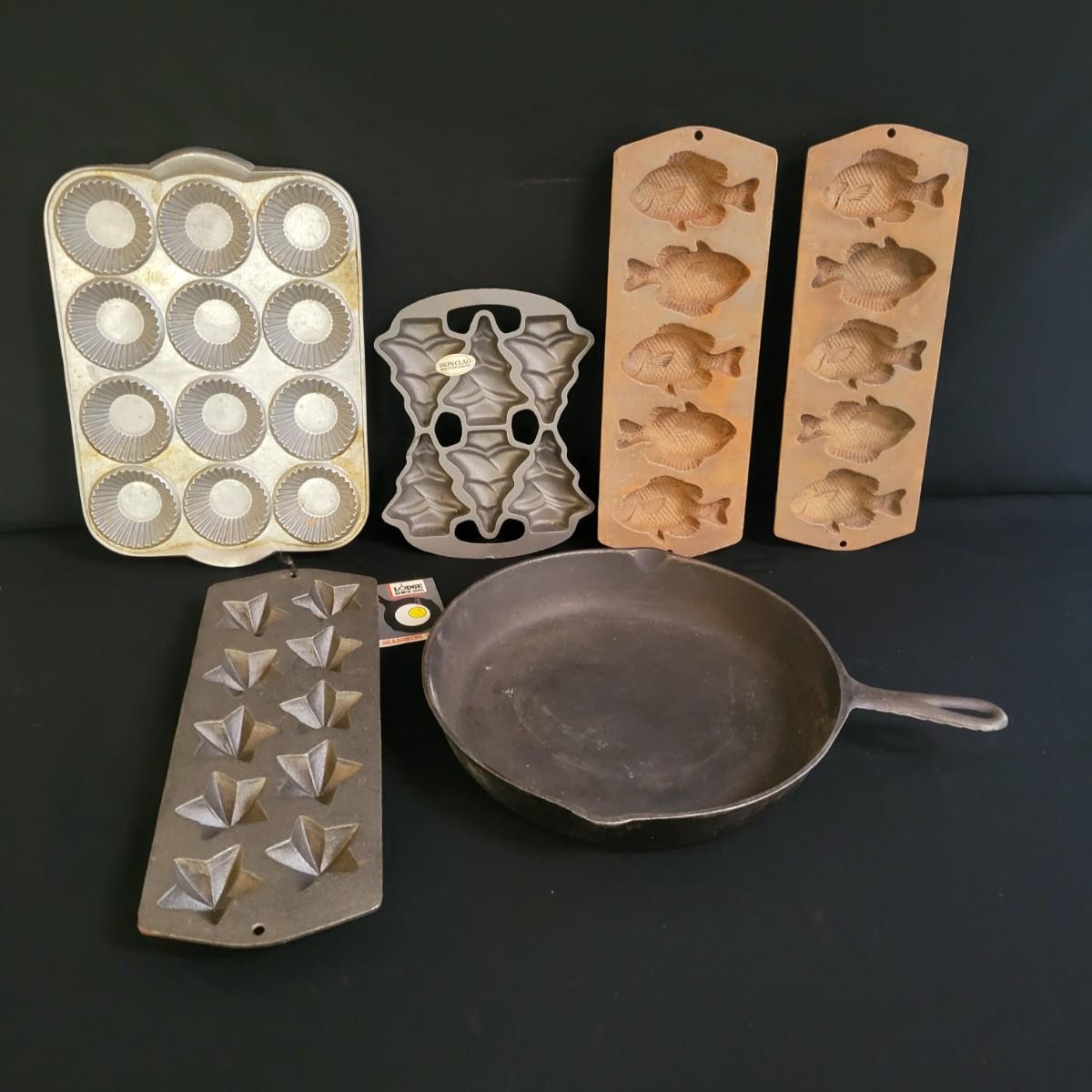 An assortment of cast iron kitchen items that includes a #10 skillet and five cast iron baking molds. The stars and fish were manufactured by Lodge and the Christmas trees by John Wright Co. The muffin pan measures approximately 10" x 14.5". Shipping available. Shipping can be costly. We suggest contacting our preferred local shipping provider, Postage Express, with dimensions and getting an estimate before bidding: (828) 670-5501 or postageexpress@yahoo.com.