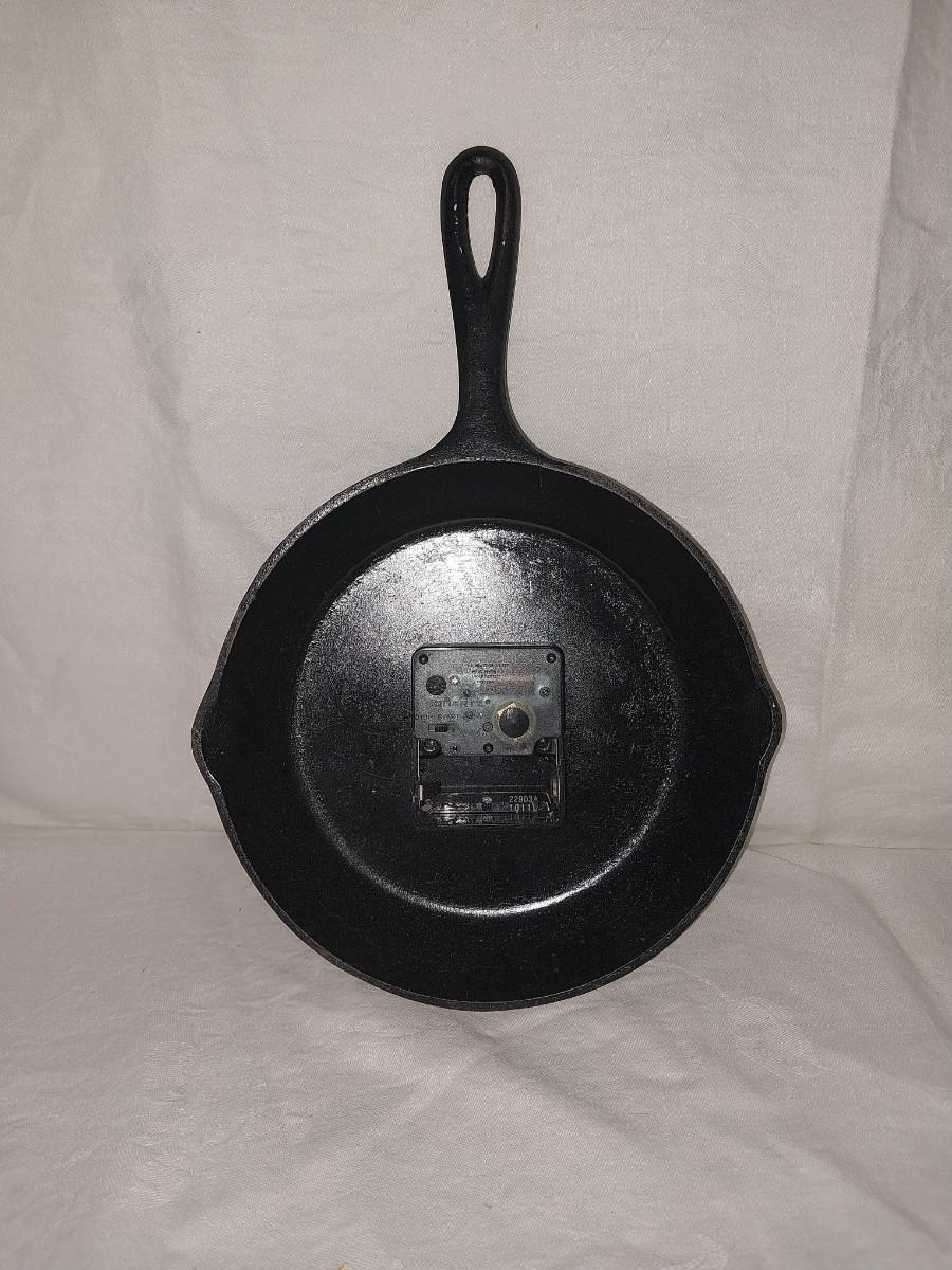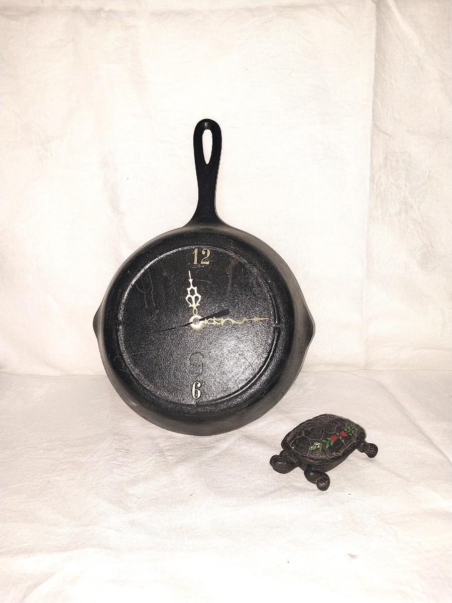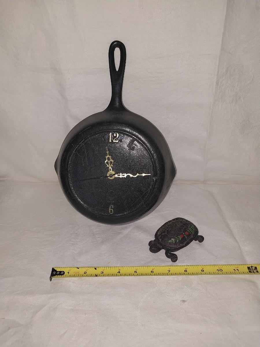 CAST IRON SKILLET CLOCK AND TURTLE TRINKET BOX