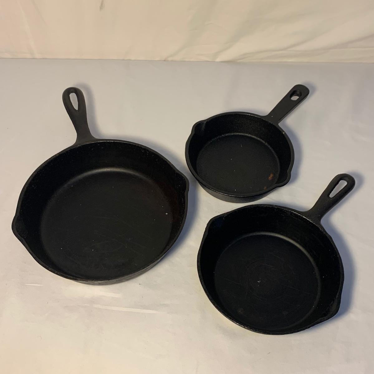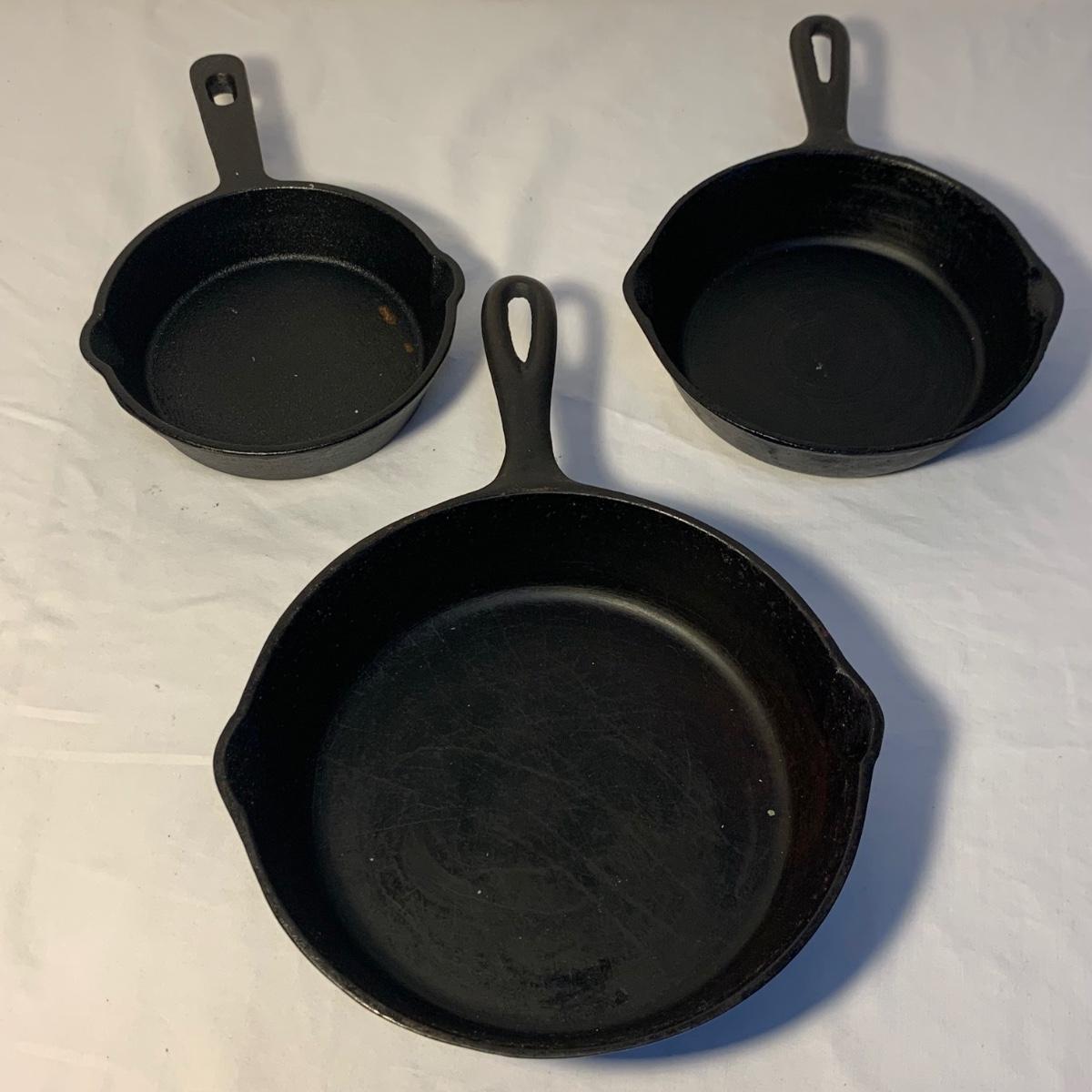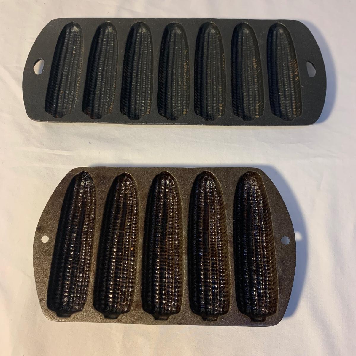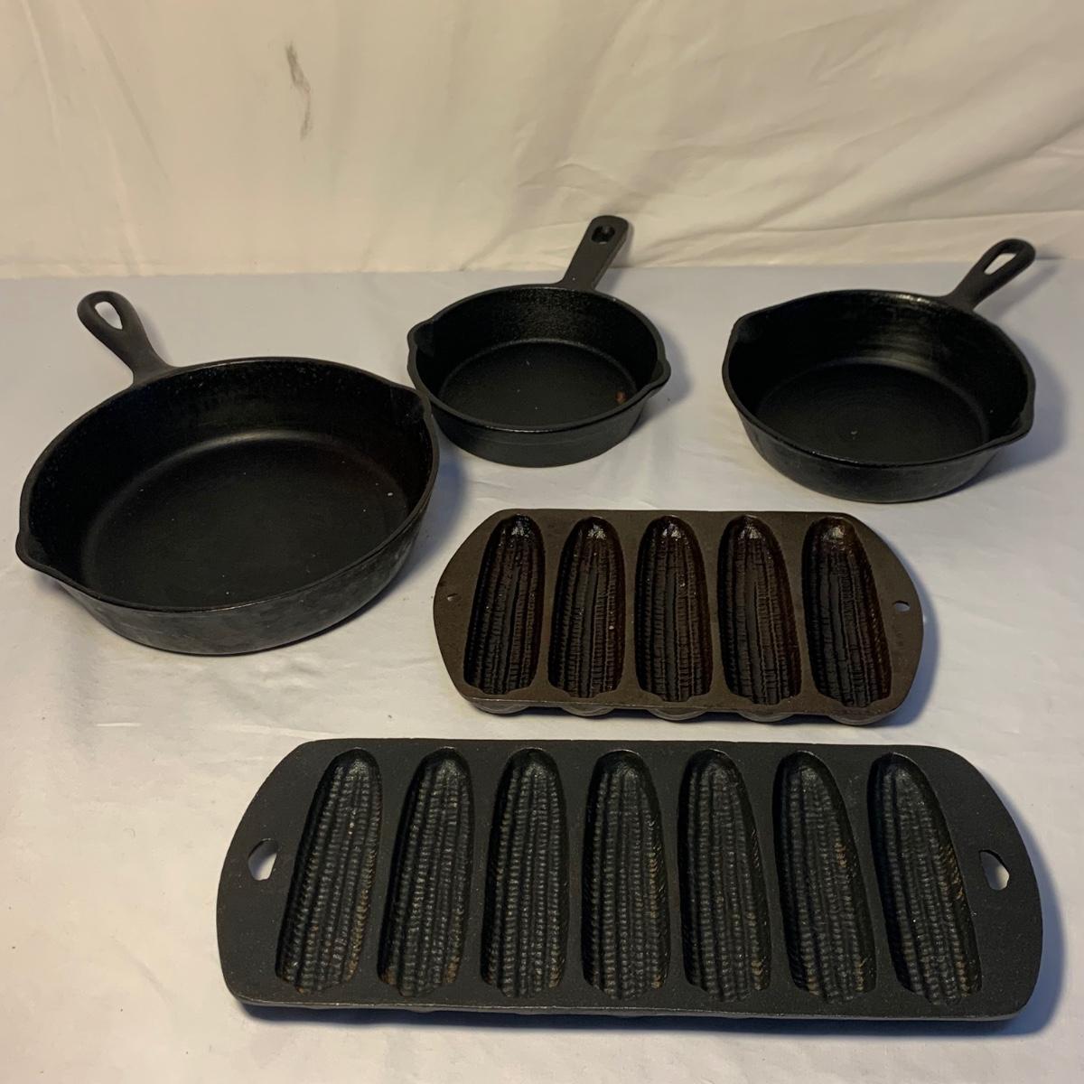 Three cast iron skillets and two cast iron corn molds. The largest skillet is 8”D. The smallest is 6”D. One of the corn molds is quite sticky inside, likely from oil. All will need cleaning and conditioning before use.